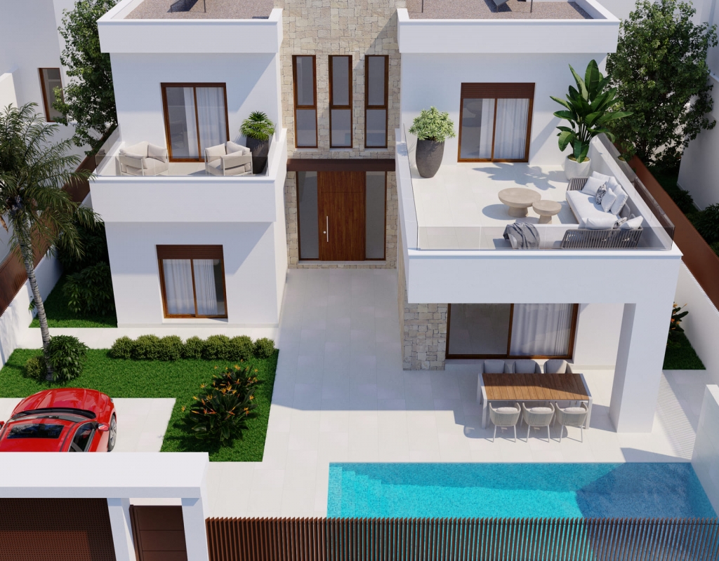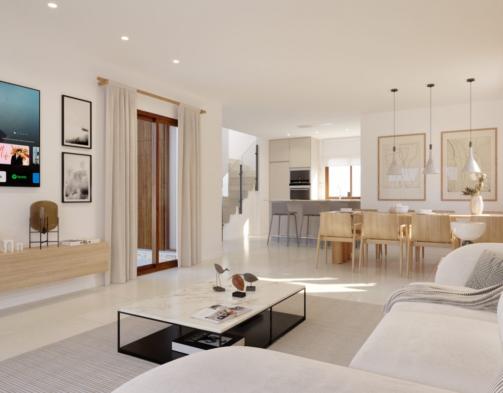 The exterior design of the villas includes private gardens and terraces, perfect for enjoying the Mediterranean climate. Each villa features a private pool, providing an ideal space for outdoor leisure and relaxation. The garden areas complement the surroundings, creating a natural and welcoming atmosphere. The location in Orihuela Costa allows for a peaceful environment, with the advantage of being close to golf courses.