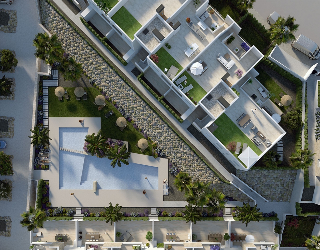 The exterior design of these homes in Algorfa is intended to maximize enjoyment of the Mediterranean climate. Each property features a private terrace, ideal for relaxing outdoors or enjoying al fresco dining. The ground floors have a private garden, perfect for those seeking a personal green space. The penthouses, on the other hand, offer a solarium that provides additional space for sunbathing or enjoying the views. The presence of a pergola adds a touch of sophistication and functionality, allowing enjoyment of the outdoors with shade and style. The option of a private garage ensures that parking is not an issue, offering security and convenience.