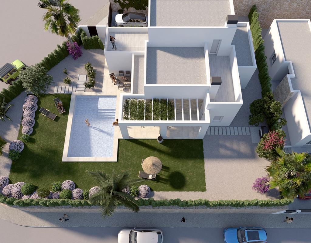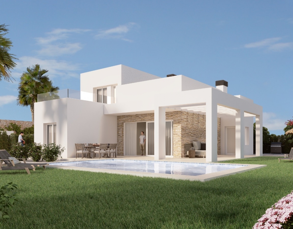 The exterior design of these villas at La Finca Golf is simply spectacular. Each villa boasts a private garden, perfect for enjoying the Mediterranean climate. The presence of a private pool adds a touch of luxury, offering an ideal space to relax and enjoy the sun. Additionally, the villas are equipped with a pergola, providing a shaded area for outdoor dining or simply relaxing with a good book. The terrace is another outdoor attraction, offering views of the natural surroundings and additional space for outdoor entertainment.