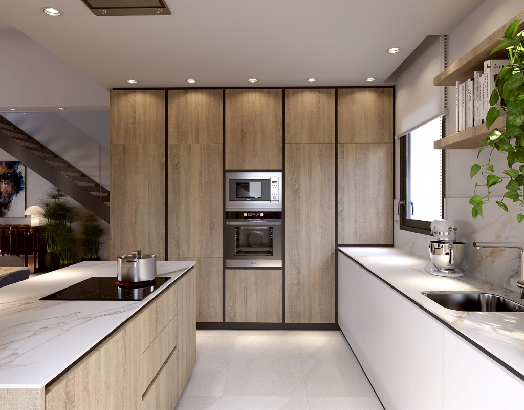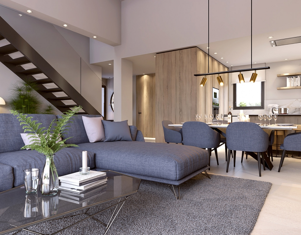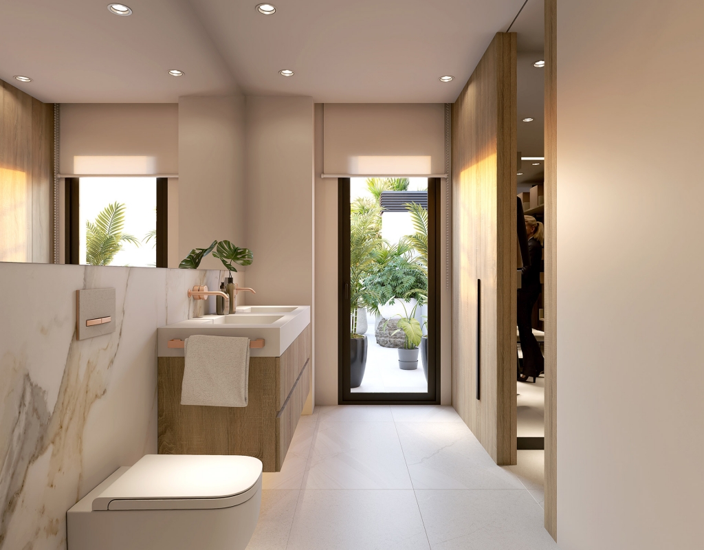 The interior of these villas at La Finca Golf is designed to offer maximum comfort and functionality. Each villa features air conditioning, ensuring a pleasant environment year-round. Electric shutters add an additional level of convenience and security. The built-in wardrobes in the bedrooms provide ample storage space, keeping the design clean and tidy. The layout includes a private garage, ensuring a secure parking space. Additionally, the solarium offers extra space to enjoy the sun and panoramic views of the surroundings.