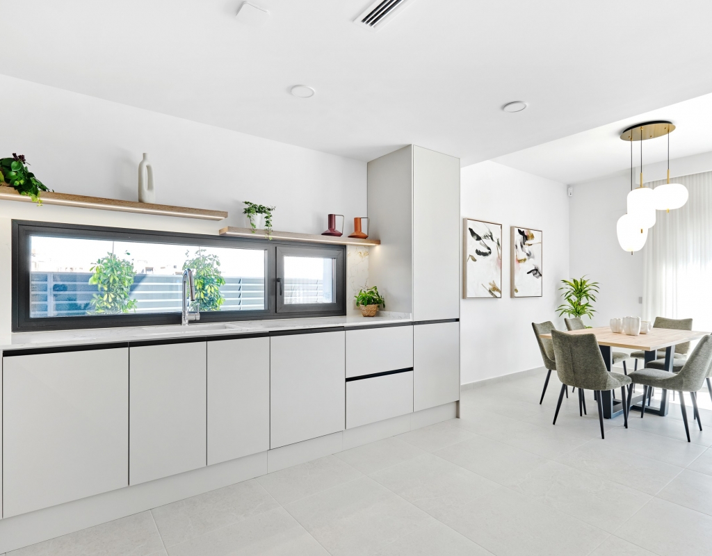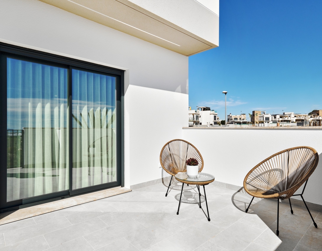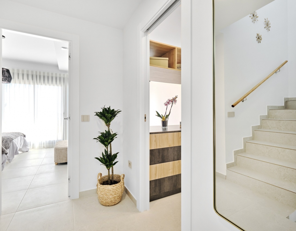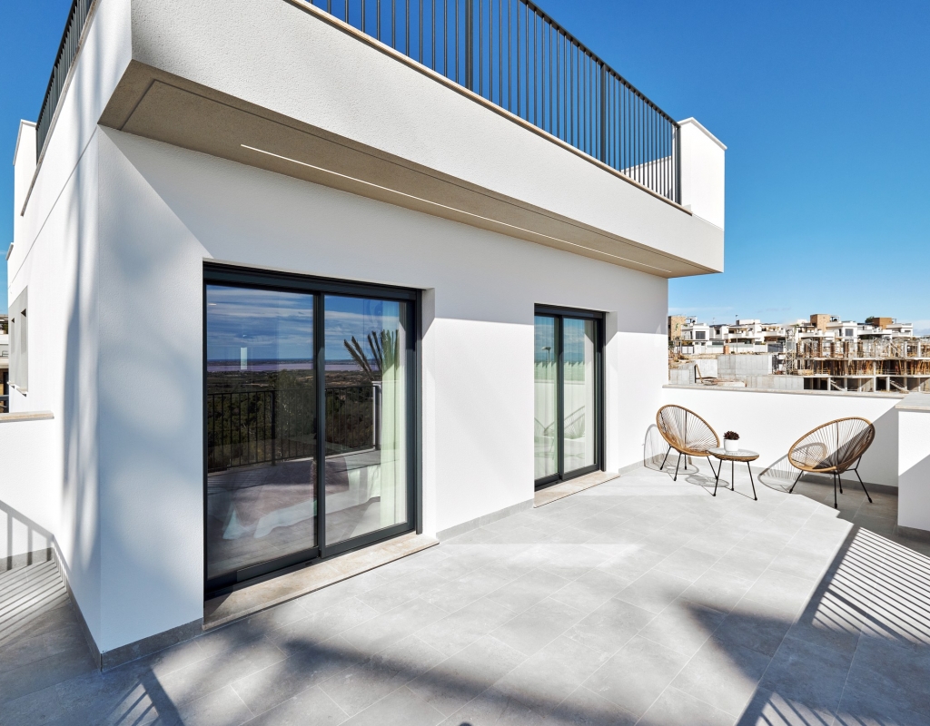 The exterior design of these detached homes in San Miguel de Salinas is intended to enjoy the Mediterranean climate. Each property features a private pool, perfect for cooling off during warm summer days. Additionally, the terraces offer an ideal space for outdoor relaxation or al fresco dining with sea views. The option of a solarium allows residents to make the most of the sun year-round, creating an additional space for leisure and relaxation.