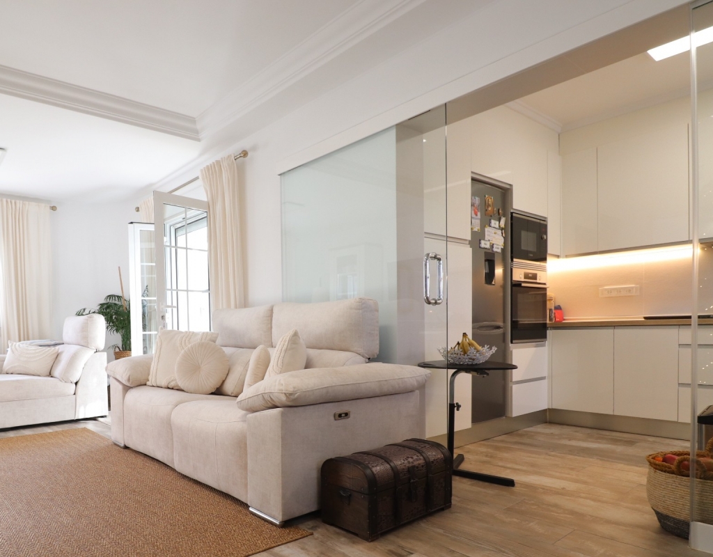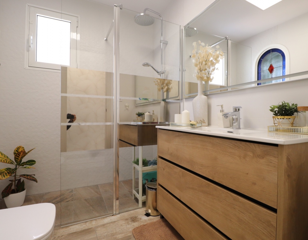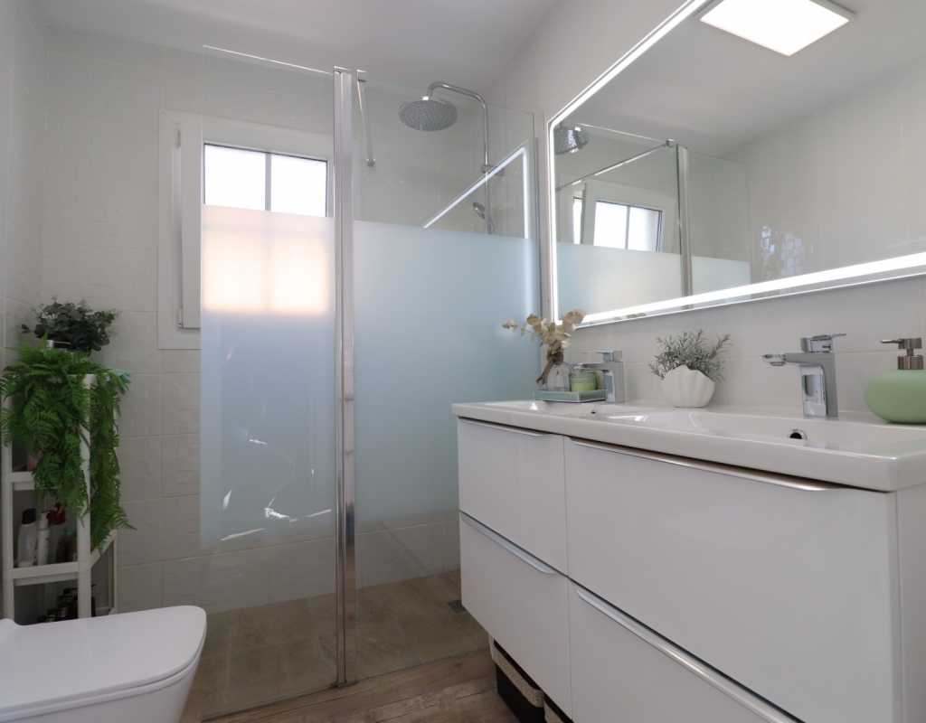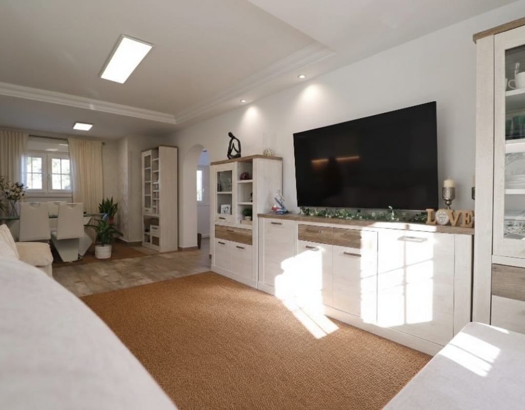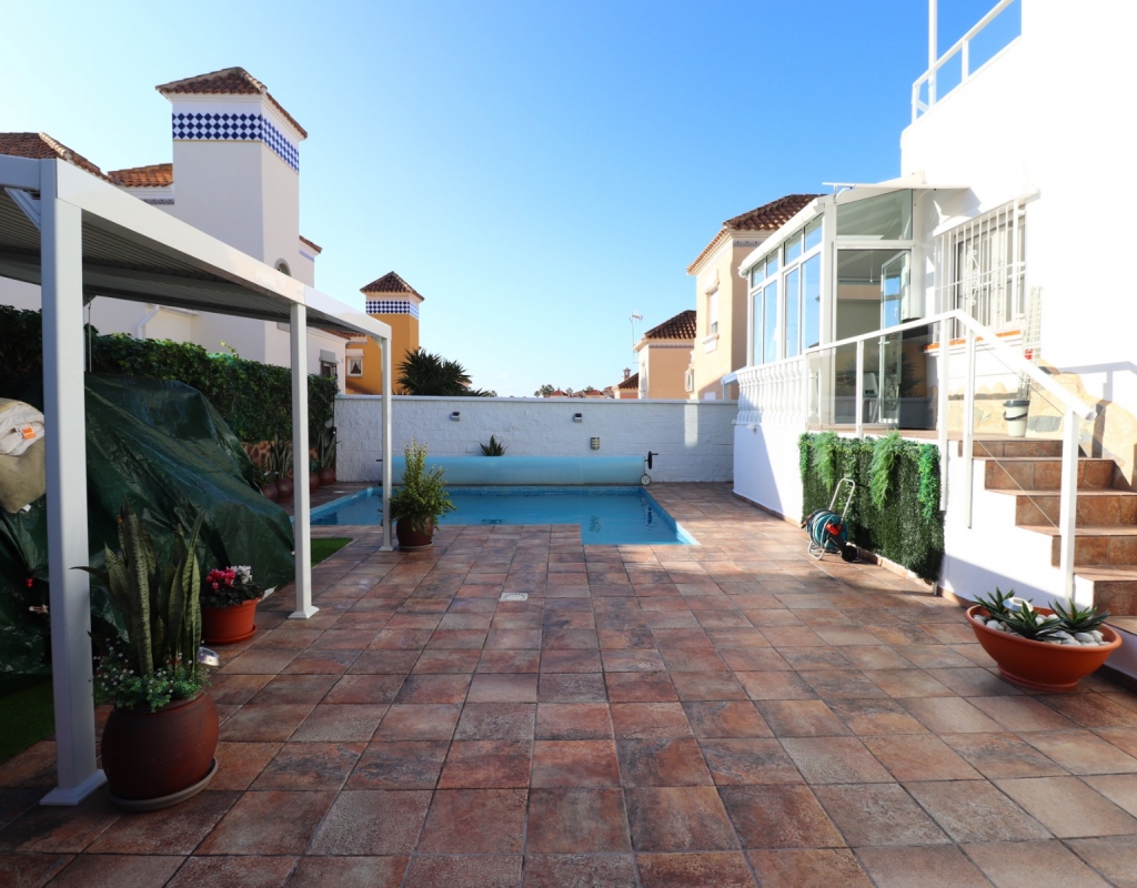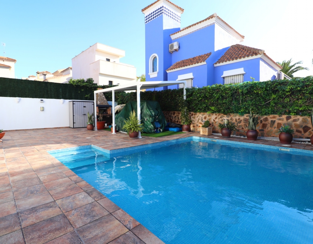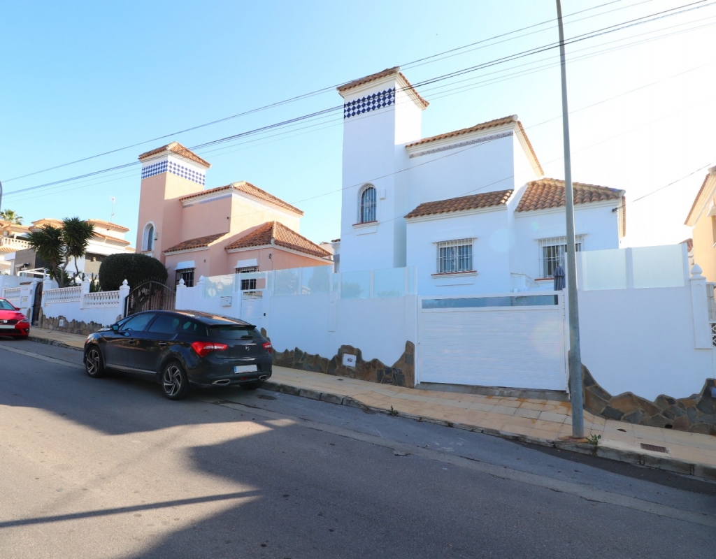 This South East Facing, Four Bedroom, Detached Villa in Las Filipinas, is located overlooking a green area of trees and bushes, in a highly desirable residential setting. A variety of bars and eating places can be reached within a 10–15 minute walk, while a main chain supermarket and La Fuente commercial centre are just a short drive away. Golf lovers are perfectly placed with Campoamor, Las Ramblas, and Villamartin golf courses all within 5 minutes by car. La Zenia Boulevard shopping centre is only 10 minutes away, and the beautiful Orihuela Costa beaches can be reached in 10–15 minutes, making this an ideal Costa Blanca South location. The villa is entered via a welcoming entrance hall with stairs leading up to the first floor. The lounge/dining room is bright and spacious, with double opening glazed doors leading into a charming curved glazed-in area currently used as an additional dining space. Wide modern sliding glazed doors separate this living area from the beautifully fitted modern kitchen. Also on this level is a double bedroom and a stylish modern shower room with a walk-in shower. Upstairs, the master double bedroom enjoys direct access to a private terrace, which can also be accessed from the landing. Another double bedroom has been fitted with a walk-in wardrobe/dressing area in addition to built-in wardrobes, while the remaining two bedrooms also feature built-in wardrobes. A further modern shower room with a walk-in shower serves this floor. The underbuild is accessed externally and is currently laid out to include extensive office area, sitting room, double bedroom, dressing area, shower room, and utility room — offering excellent flexibility for guests, working from home, or extended family accommodation. Outside, the tiled garden is designed for easy maintenance and includes off-road parking, a private saltwater swimming pool, a BBQ area, and a covered space ideal for shaded dining and entertaining. This impressive villa offers space, versatility, and a prime location close to golf, shopping, and the coast — a fantastic opportunity on the Costa Blanca South.