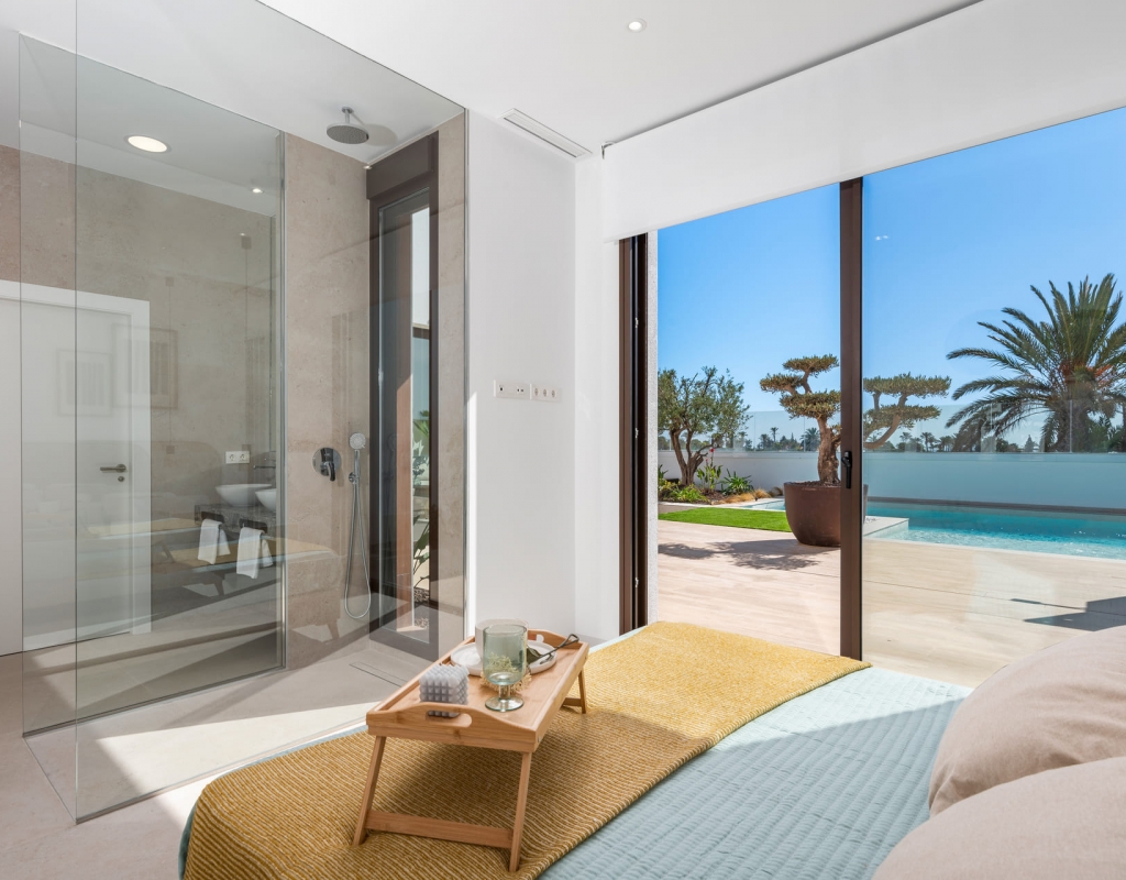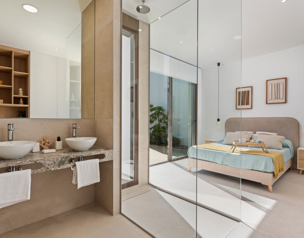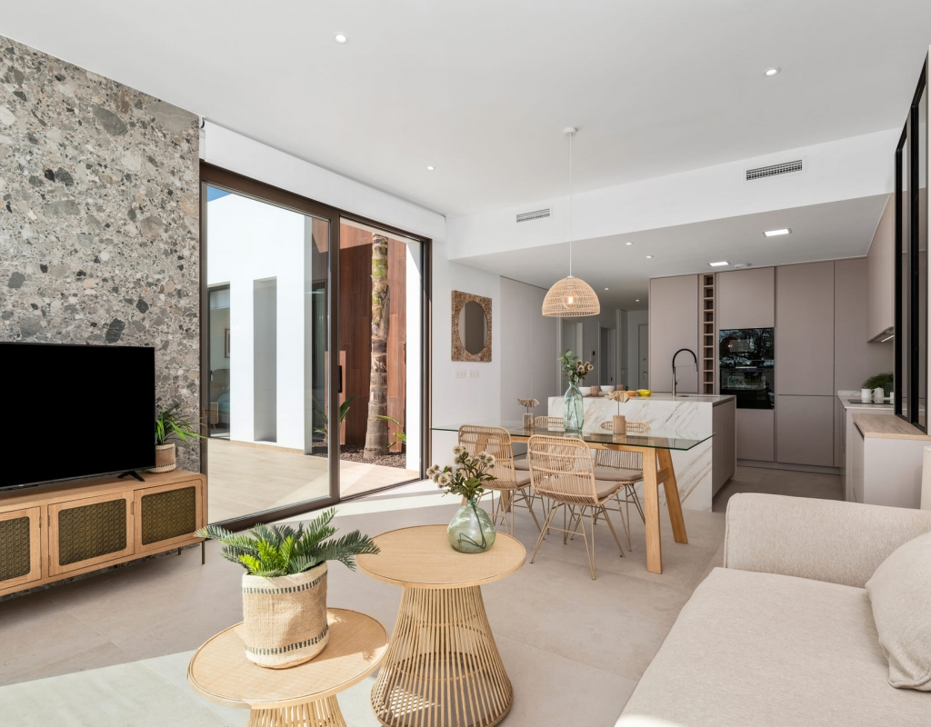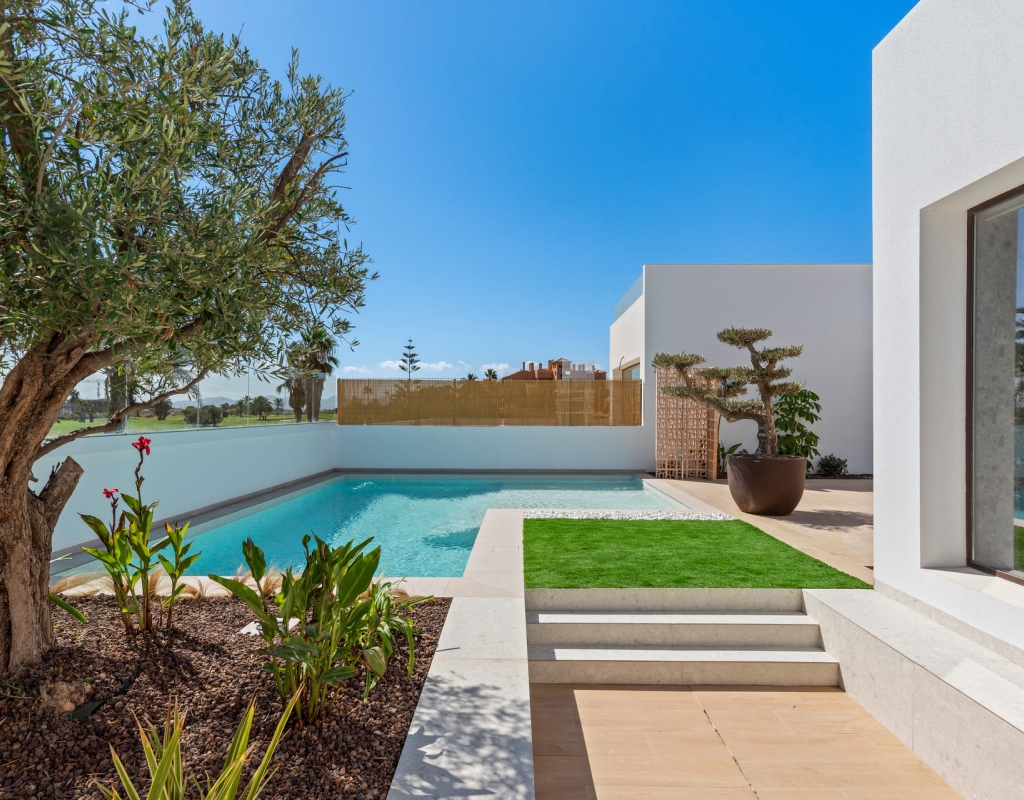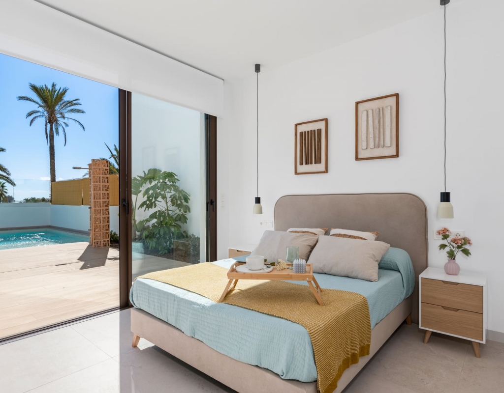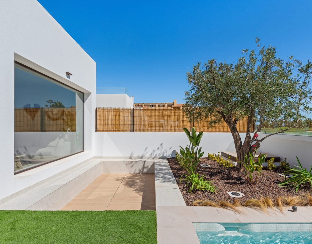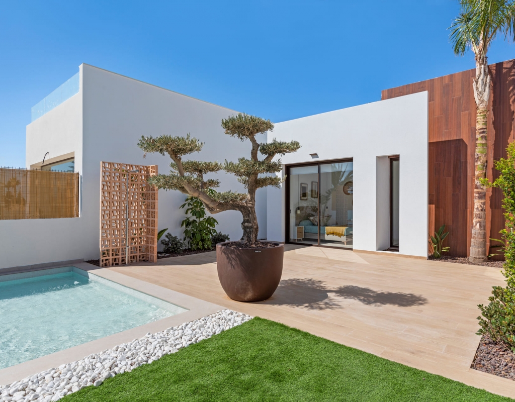 The exterior design of these independent homes in Los Alcázares stands out for its elegance and modernity. Each property features a private pool, ideal for enjoying sunny days in the privacy of your home. Solarium options, available depending on the typology, offer additional space to relax and enjoy the views. Electric shutters add a touch of convenience and security, allowing easy control of light and privacy. The location of the homes, just 1 km from the sea, allows for pleasant walks and outdoor activities in an unparalleled natural setting.