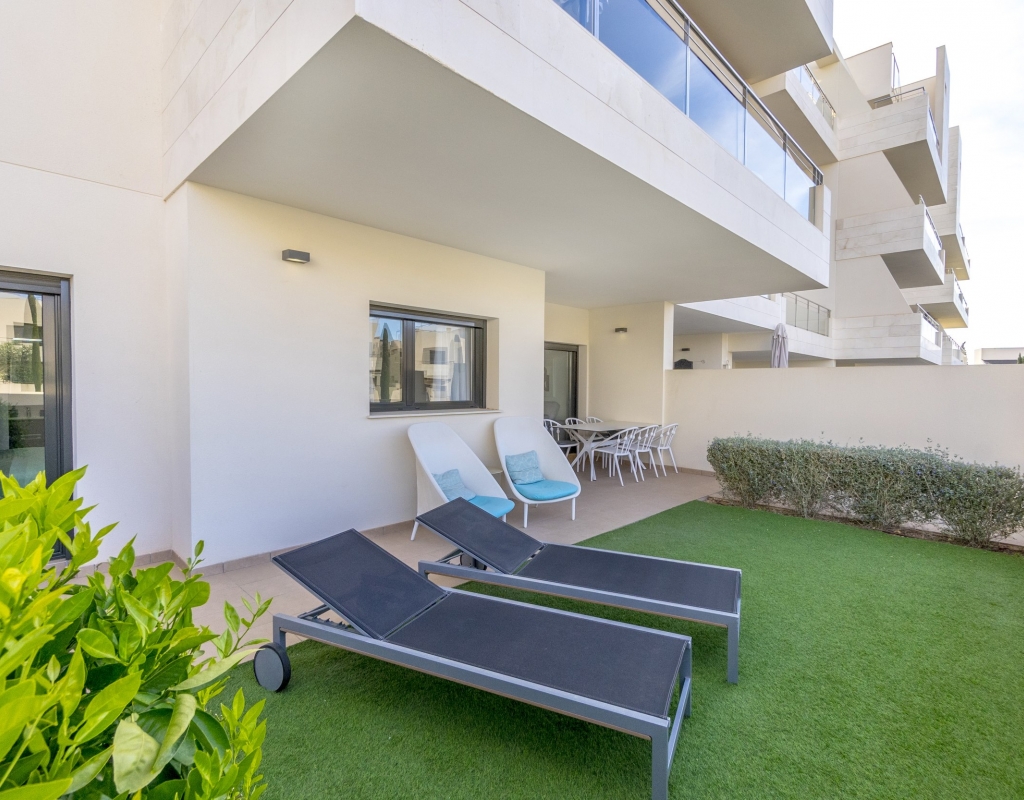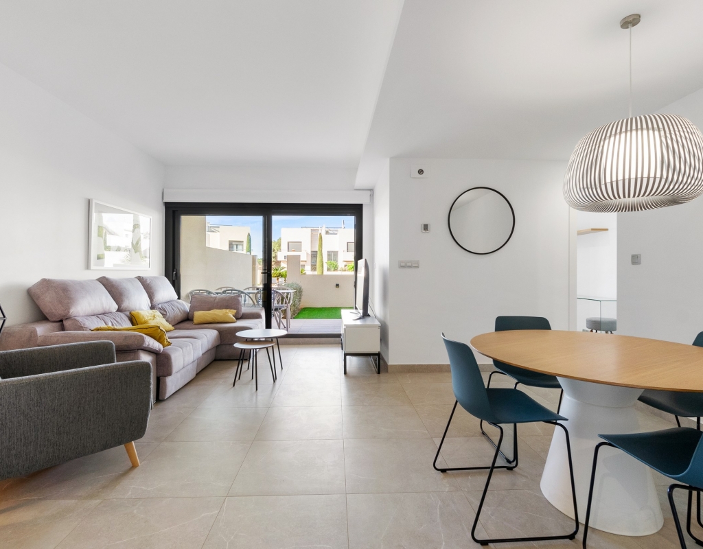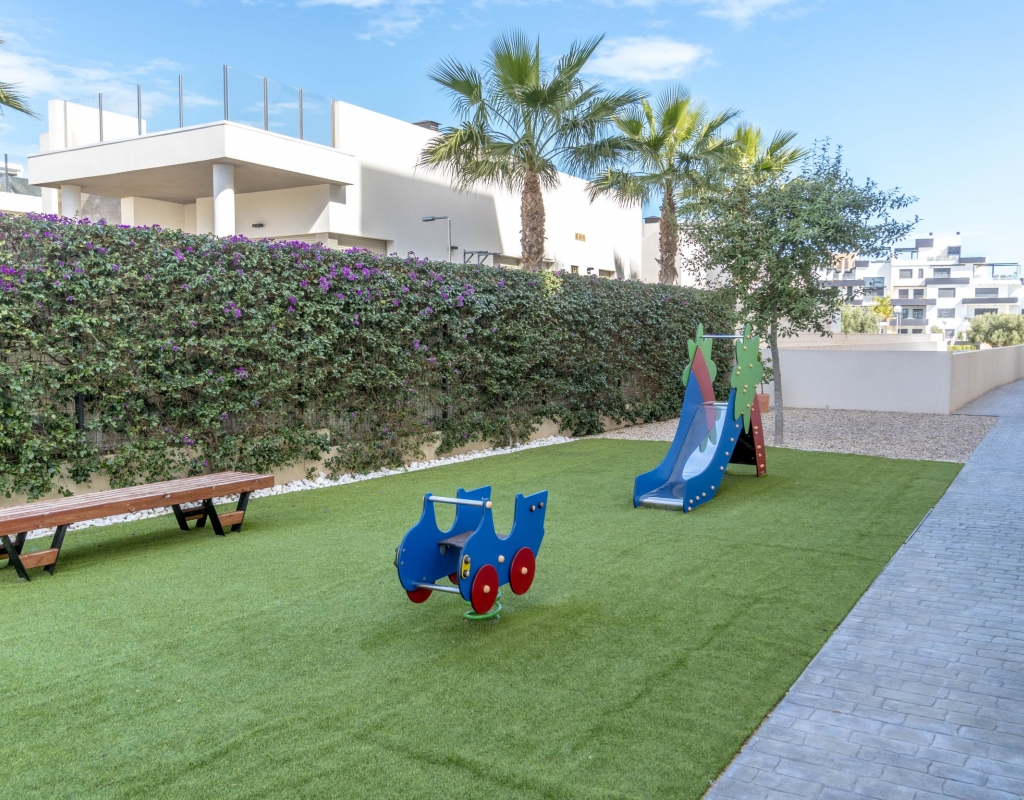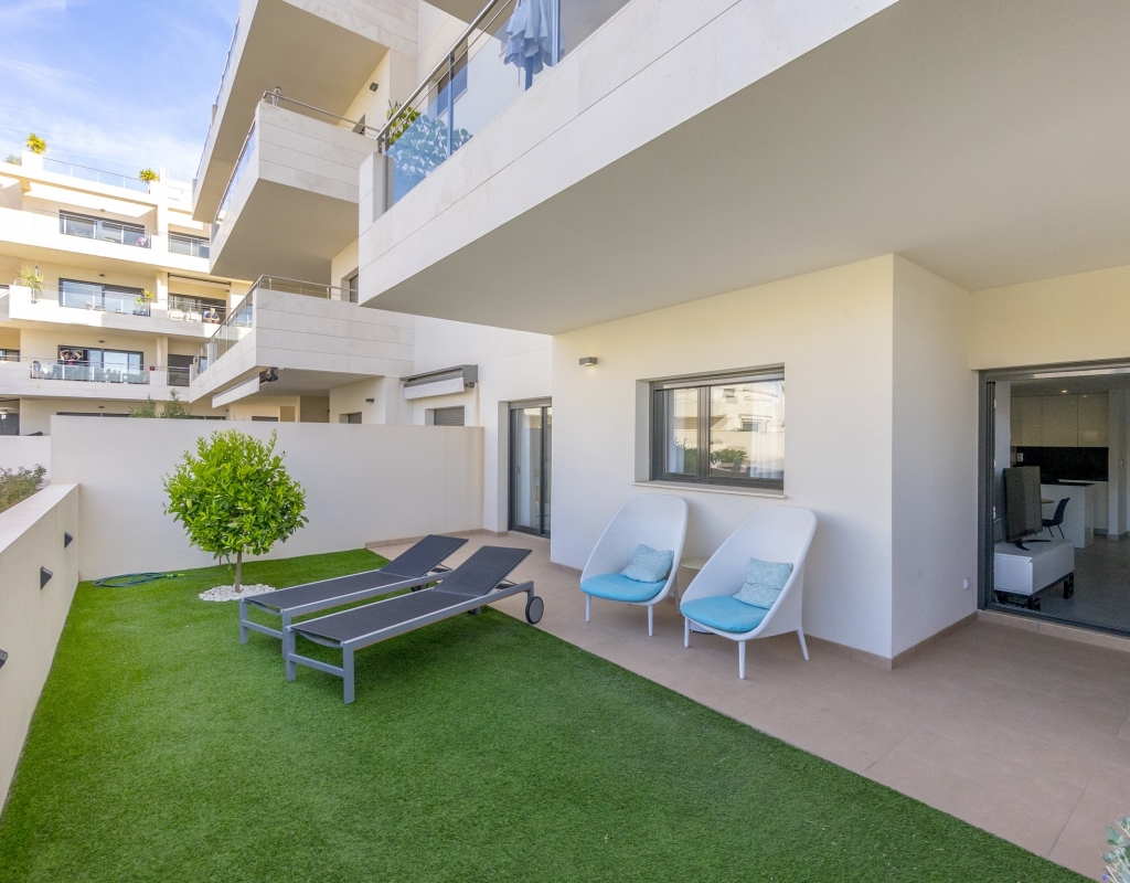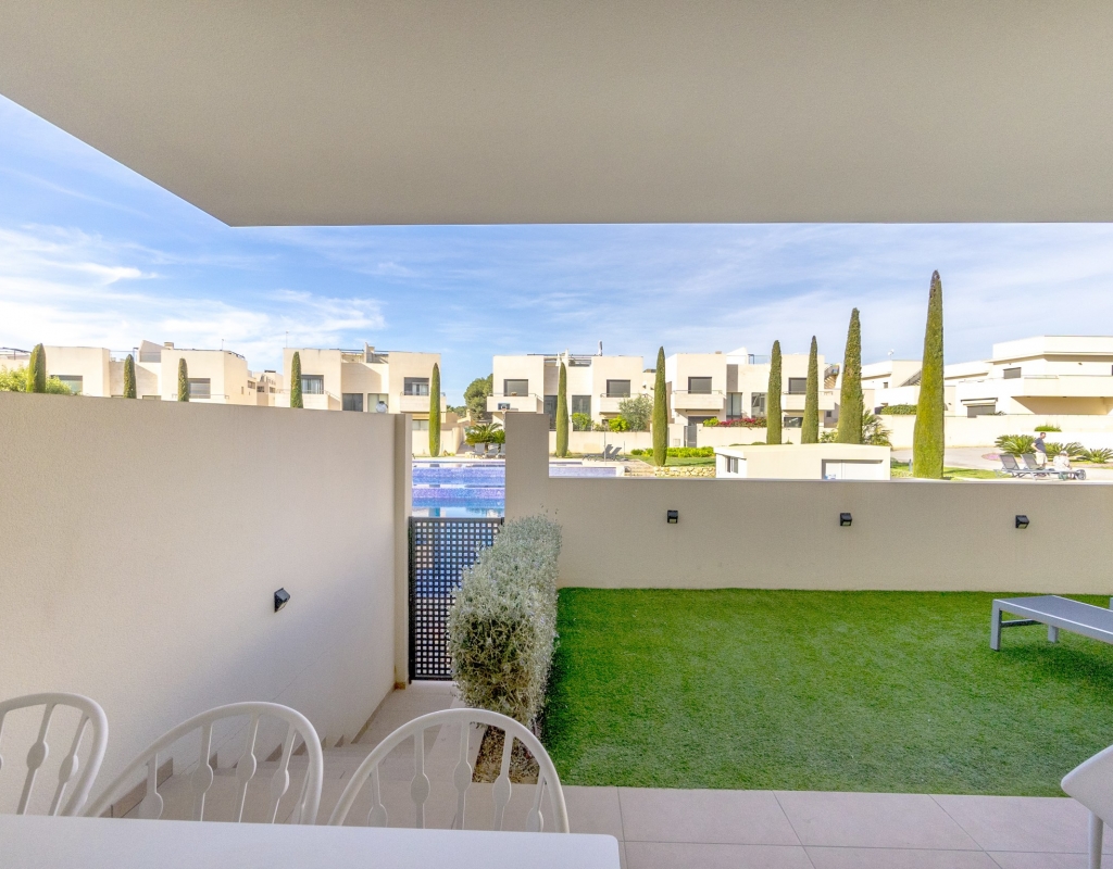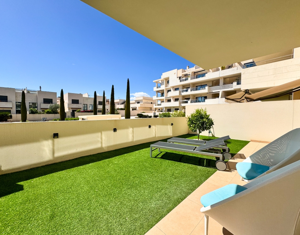 Modern apartment in Jardines de Montesolana, Orihuela Costa. This partment distributed in two bedrooms and two bathrooms. It has a spacious living-dining room with open plan kitchen and direct access to the large garden of 43 m2 with views to the communal areas of the residential with south orientation. It is located in the Jardines de Montesolana development which has a communal swimming pool and garden areas. This residential is close to La Zenia Boulevard shopping centre (Orihuela Costa). La Zenia is close to Cabo Roig, Campoamor and Playa Flamenca. It is a growing area, close to all amenities and the famous La Zenia Boulevard shopping centre. Only a few minutes from the N-332 and the Mediterranean motorway AP-7 towards Alicante and Cartagena. There are also around the golf courses of Villamartin, Las Ramblas, Campoamor and Las Colinas.