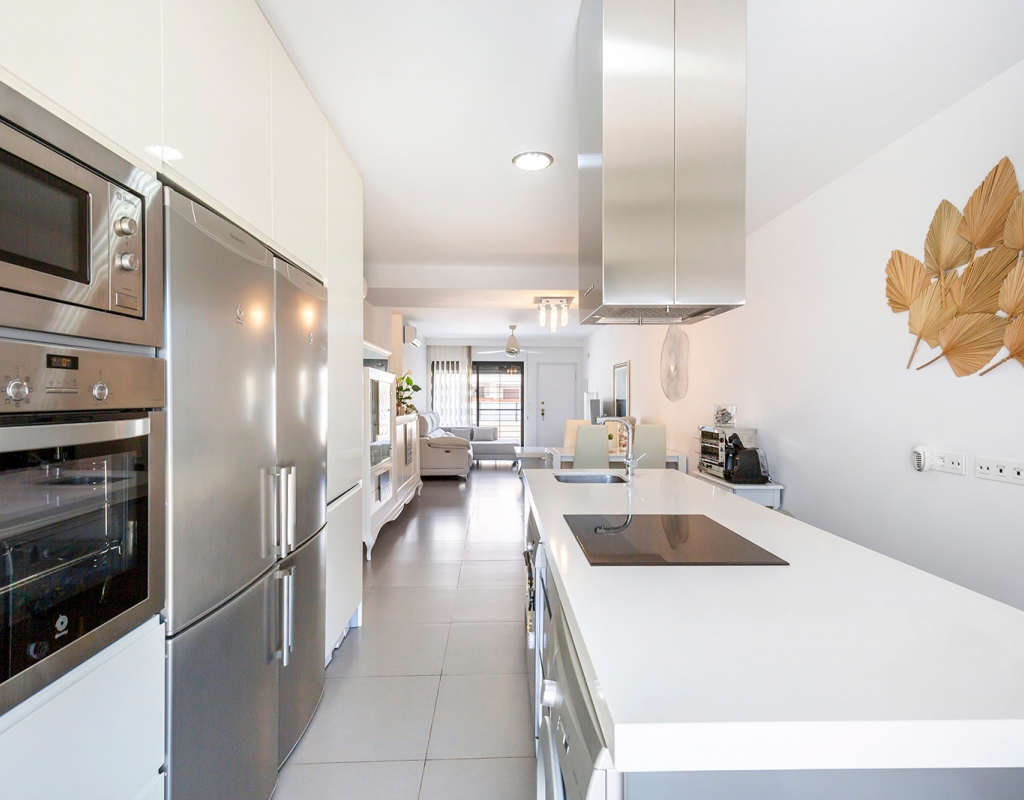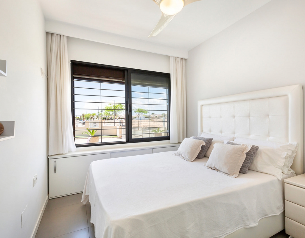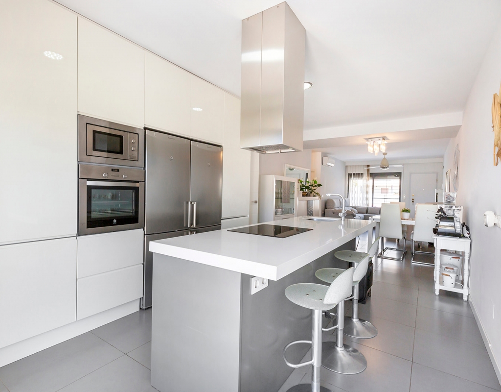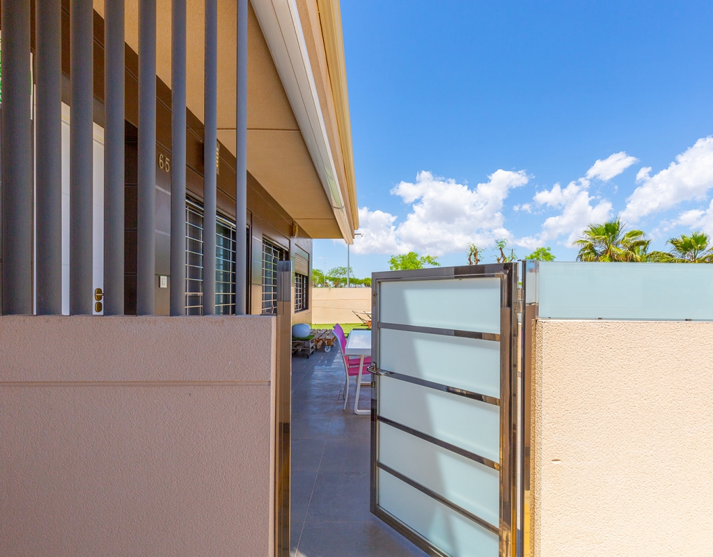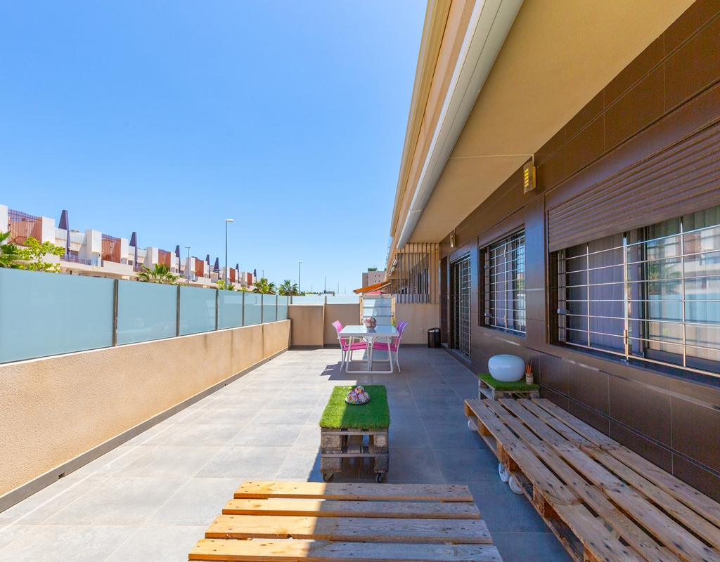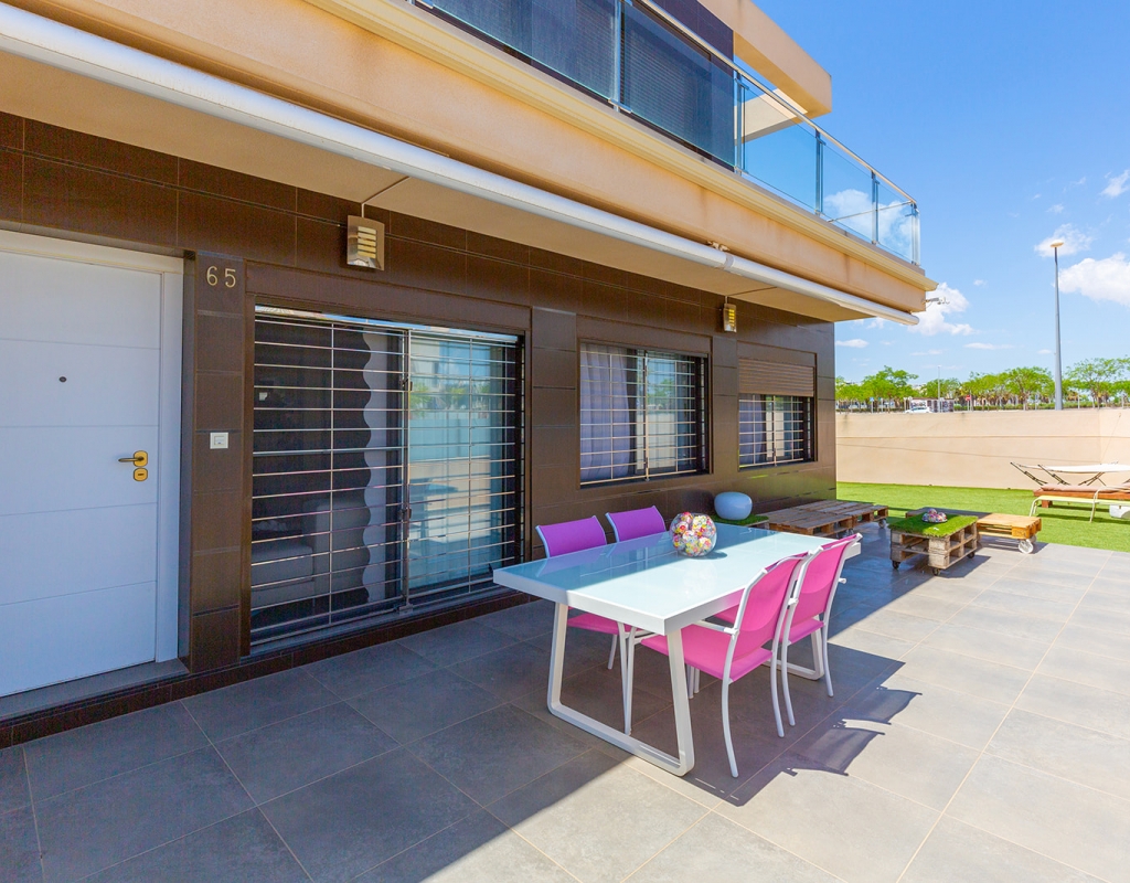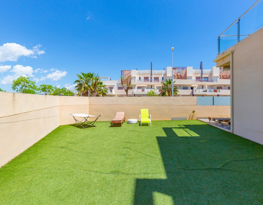 Spacious ground floor bungalow in Torre de la Horadada. This modern south facing property has 4 bedrooms, 3 bathrooms, a spacious living-dining room with open plan kitchen and direct access to the terrace and garden of 120m2. It is located in the complex where you can enjoy communal pool and garden areas. Torre de la Horadada is a prestigious area of the Costa Blanca, very close to Mil Palmeras, Campoamor, San Pedro del Pintar and Orihuela Costa. The famous salt lagoons of San Pedro del Pinatar and the Thalasia marine spa centre can be reached in only 10 minutes. Pilar De La Horadada, enjoys more than 2500 hours of sunshine a year and an average temperature of 18ºC, which makes it a privileged area. It has a wide range of services, green areas, promenades and a marina. Just 5 minutes from the shopping centres La Zenia Boulevard and Dos Mares. In addition to these magnificent weather conditions, there are sandy beaches such as Playa Jesuitas, Playa del Puerto and Playa de las Higuericas. Well communicated with the national road N-332 and the Mediterranean motorway AP-7. Close to major cities such as Murcia and Alicante.
