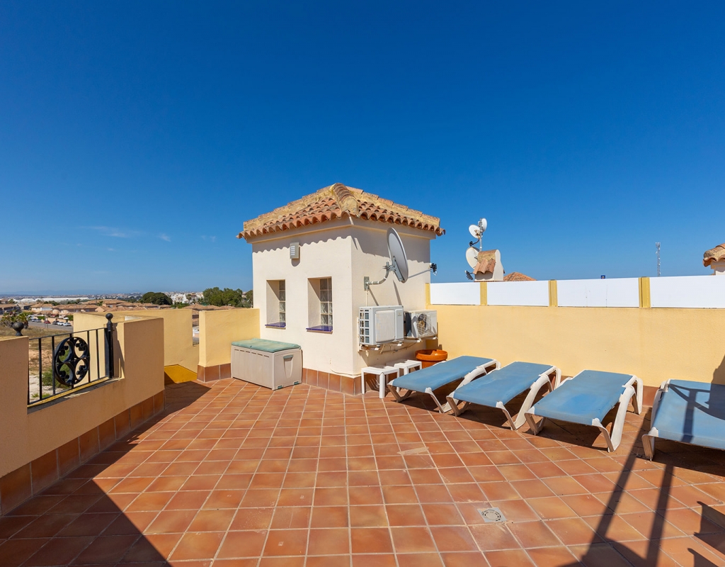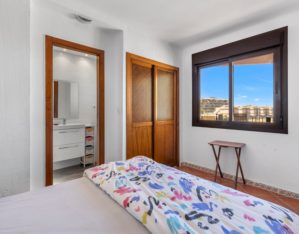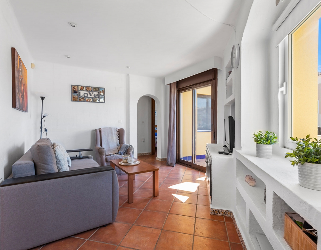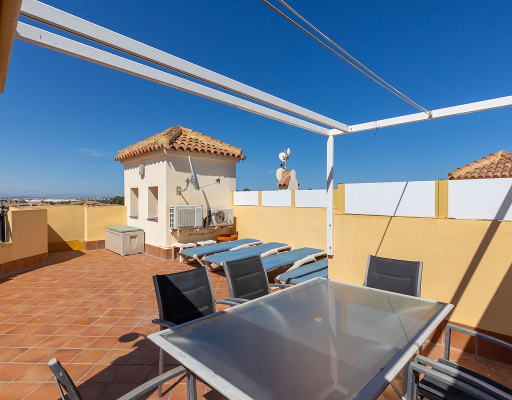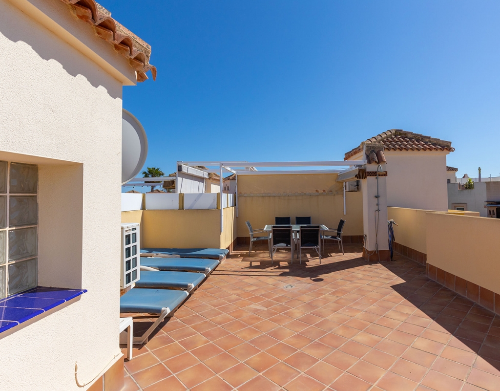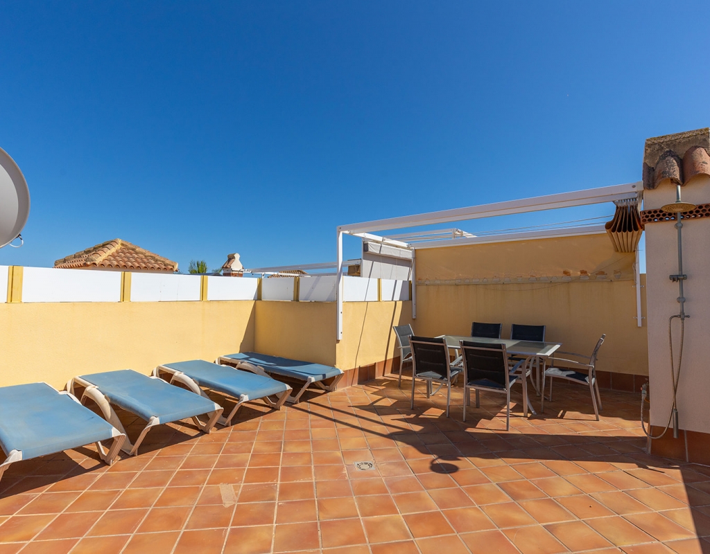 We are pleased to present this outstanding corner penthouse located in a well-established private residential complex featuring a communal swimming pool and high-quality shared amenities, situated in the prestigious Punta Marina area of Punta Prima. The property is in impeccable condition and stands out for its elegant rustic style, creating a warm and inviting atmosphere. Its west-facing orientation ensures excellent natural light during the afternoon, resulting in bright and pleasant living spaces. This penthouse includes a spacious private solarium, ideal for enjoying the sun and unobstructed views of the street in a peaceful and privileged setting. An exceptional opportunity for those seeking a primary residence, a vacation home, or a high-potential investment in one of the most sought-after locations. If you would like to schedule a viewing or request further information, please do not hesitate to contact us.