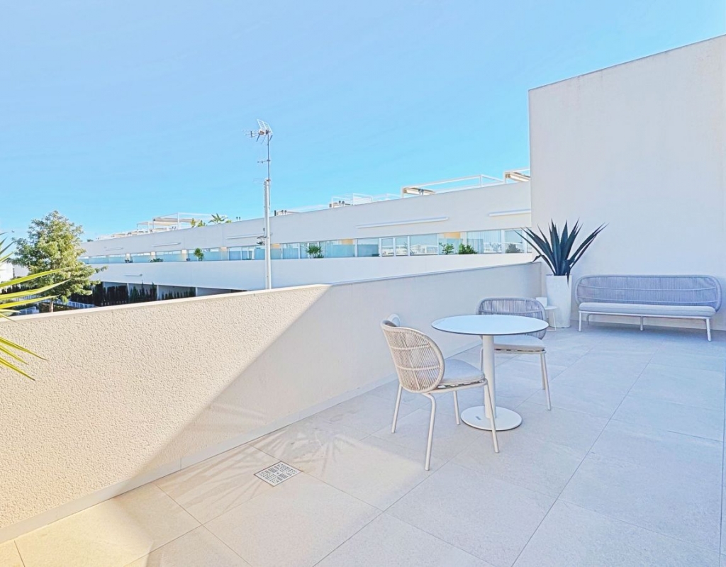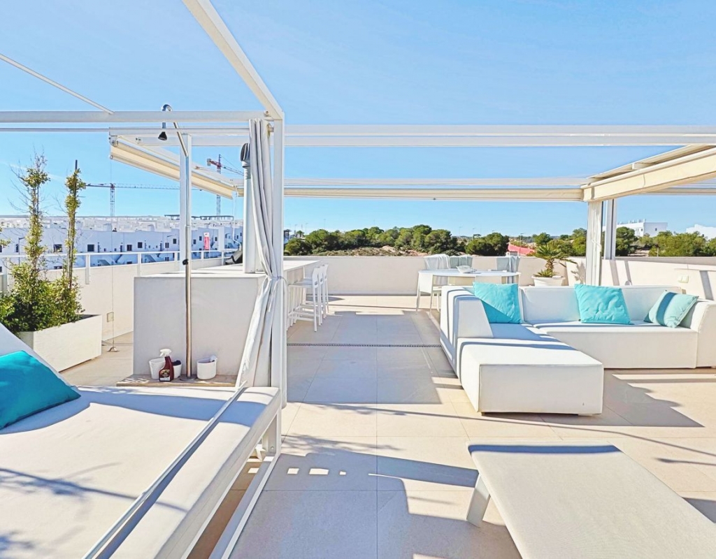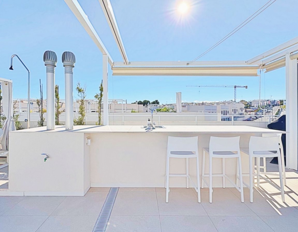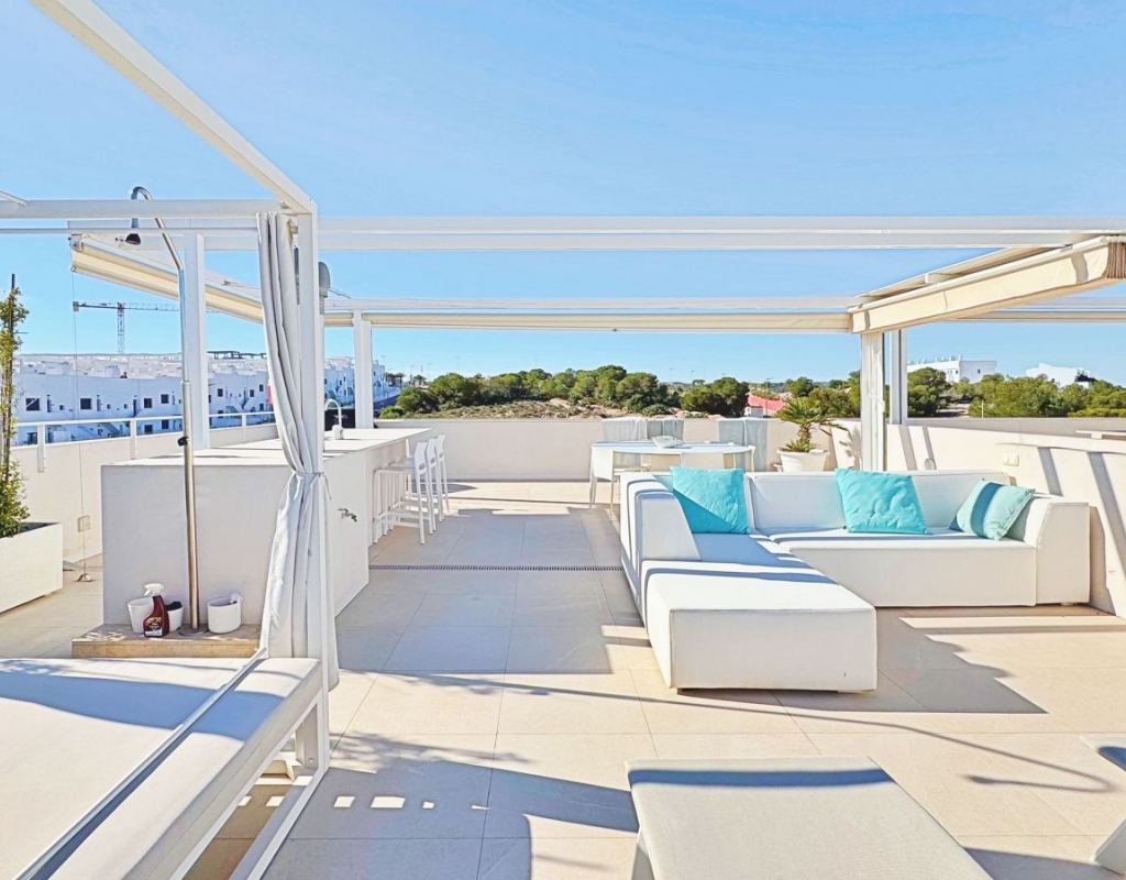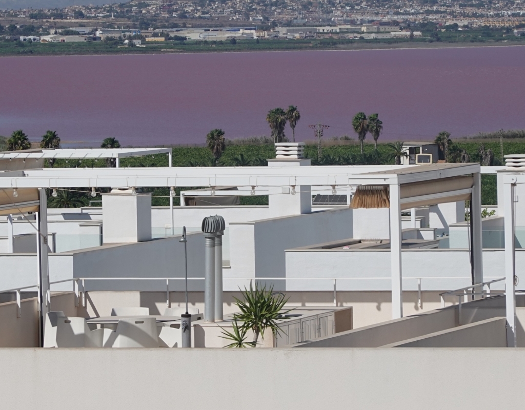 This exclusive penthouse in Mirasal, located in the prestigious Los Balcones area of Torrevieja, stands out for its contemporary design, exceptional brightness and privileged position at the highest point of the residential complex. Thanks to this elevated location, the property enjoys panoramic views over Torrevieja, the Mediterranean Sea and the iconic Pink Salt Lake, one of the most unique natural landscapes on the Costa Blanca. Inside, the penthouse offers a spacious and elegant atmosphere, with a modern open-plan kitchen and a bright living area connected to a generous terrace overlooking the infinity-style swimming pool and landscaped gardens. Large floor-to-ceiling windows create a seamless transition between indoor and outdoor spaces, enhancing the sense of openness and wellbeing. The highlight of the property is its spectacular 75m2 private rooftop solarium, fully designed for year-round outdoor living. The space includes chill-out areas, an outdoor dining space, a bar area and pergolas, making it perfect for relaxing or entertaining guests. From here, the open views of the salt lake and the entire city of Torrevieja are simply extraordinary. It also includes a convenient underground parking space and a storage room. Mirasal is known for its contemporary architecture, large green areas and impressive infinity-style pool. Its location in Los Balcones offers tranquillity, proximity to all services, quick access to sports facilities, supermarkets and natural surroundings, and is just a short drive from Torrevieja’s best beaches. A unique opportunity for those seeking a modern and exclusive penthouse with privileged views in one of the finest residential complexes on the Costa Blanca.