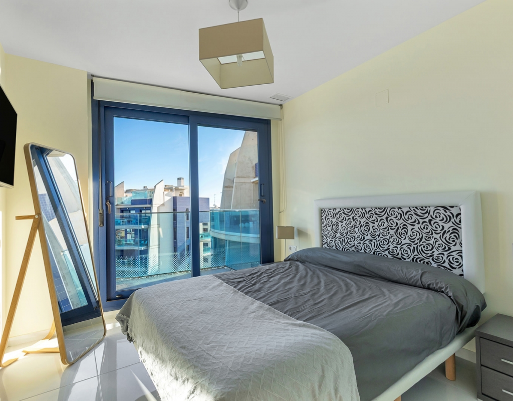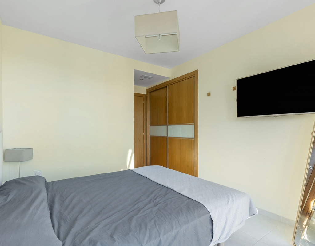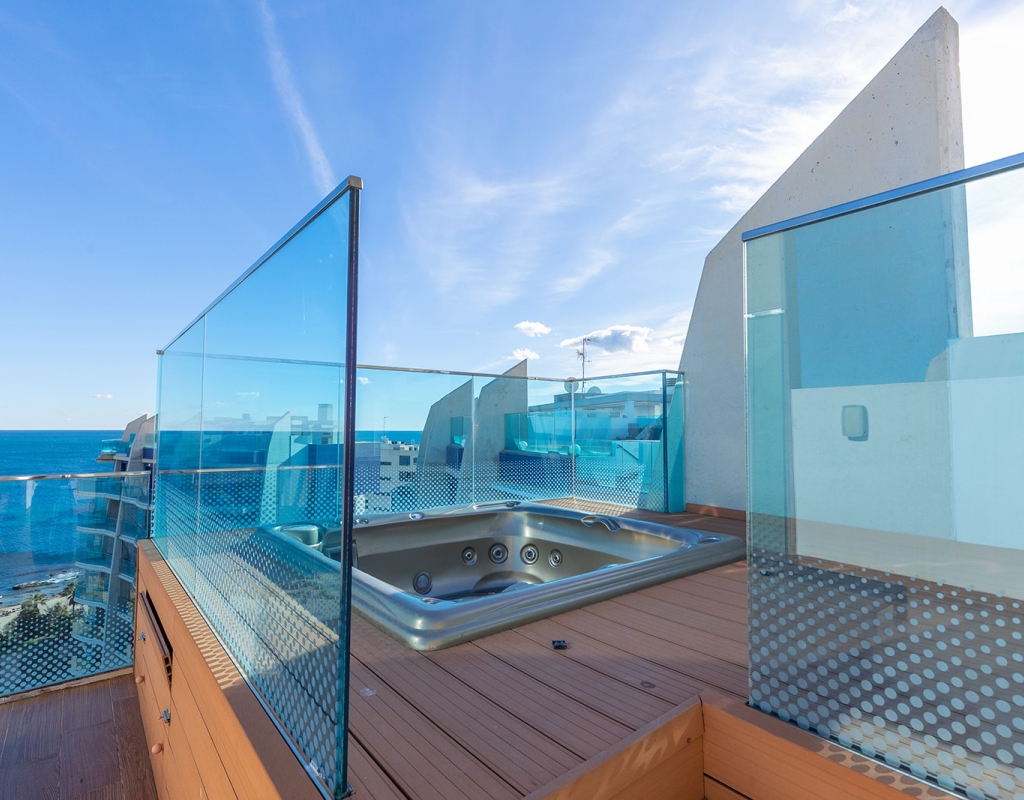 The property features 2 bedrooms and 2 bathrooms, designed in a modern and functional layout to ensure maximum comfort. From the bright living room, you access a charming 12 m² terrace, perfect for enjoying the sunrise and the sea breeze. The highlight of this penthouse is its spectacular private 83 m² solarium, equipped with a jacuzzi and relaxation areas—an authentic private oasis with endless sea views, ideal for enjoying the Mediterranean climate all year round.