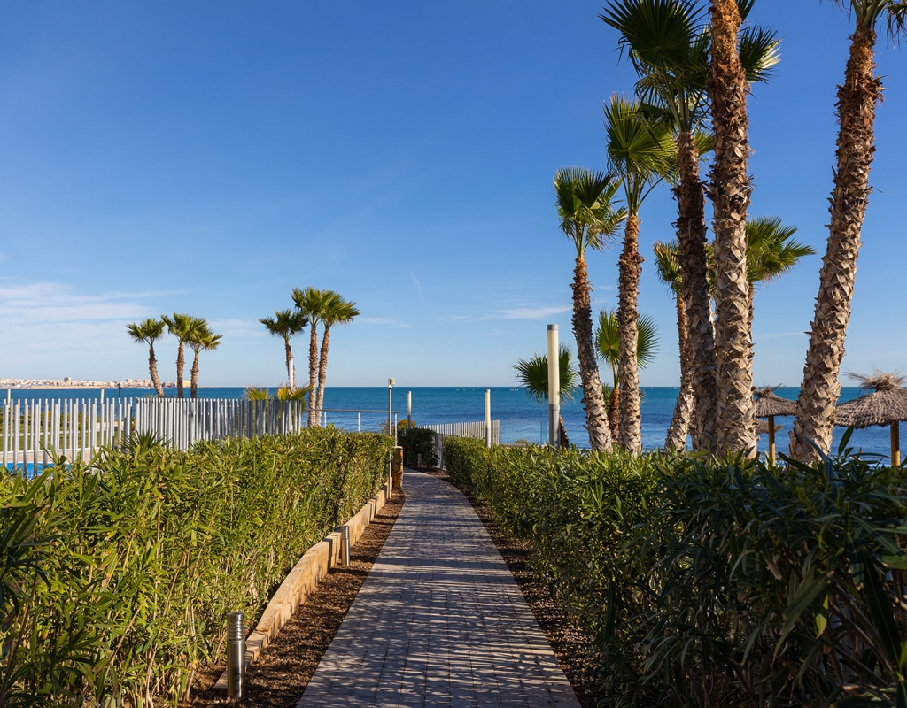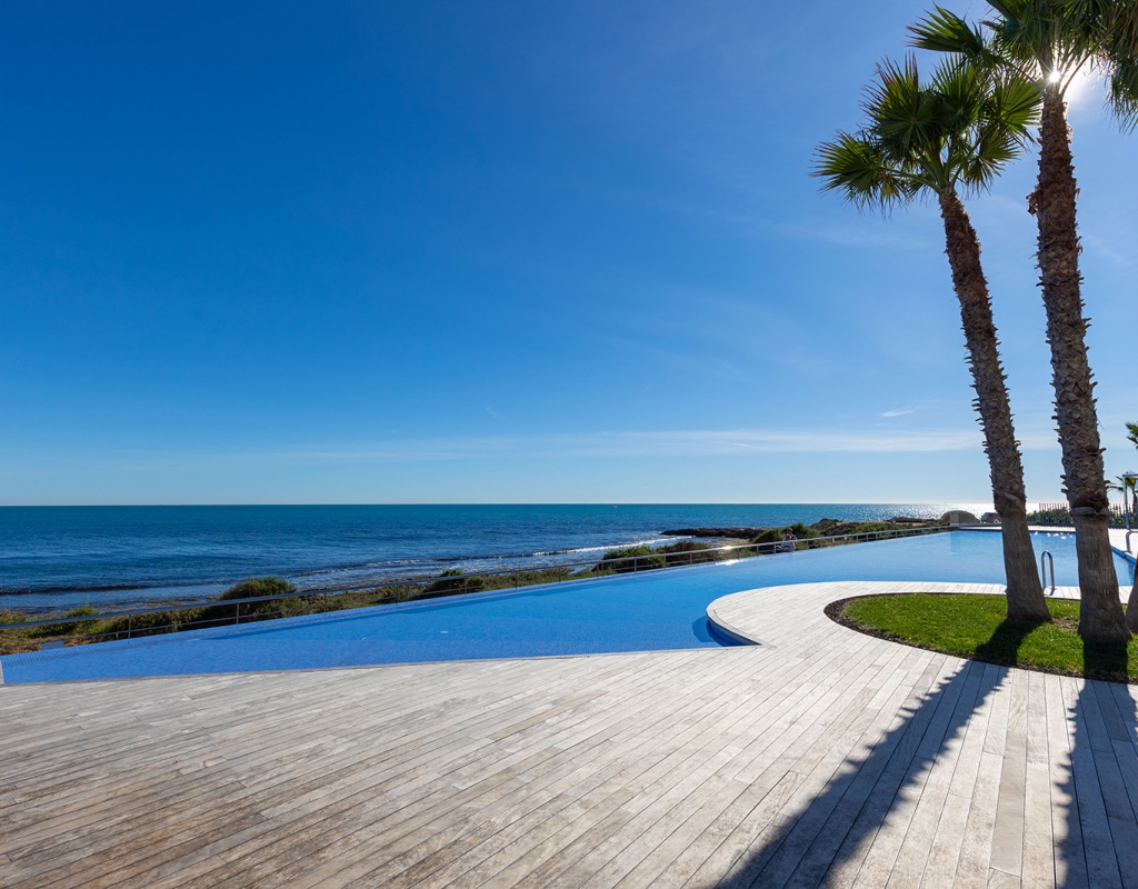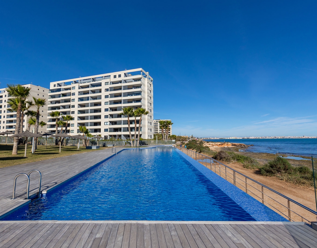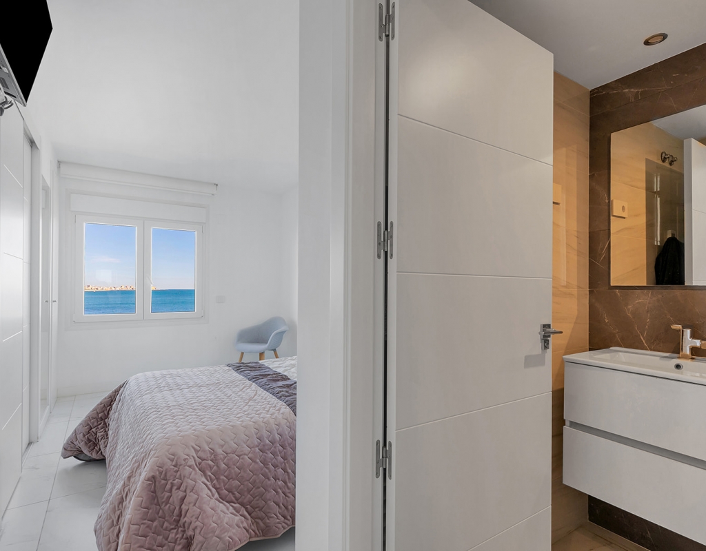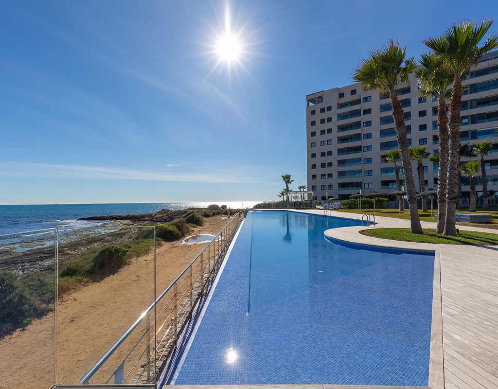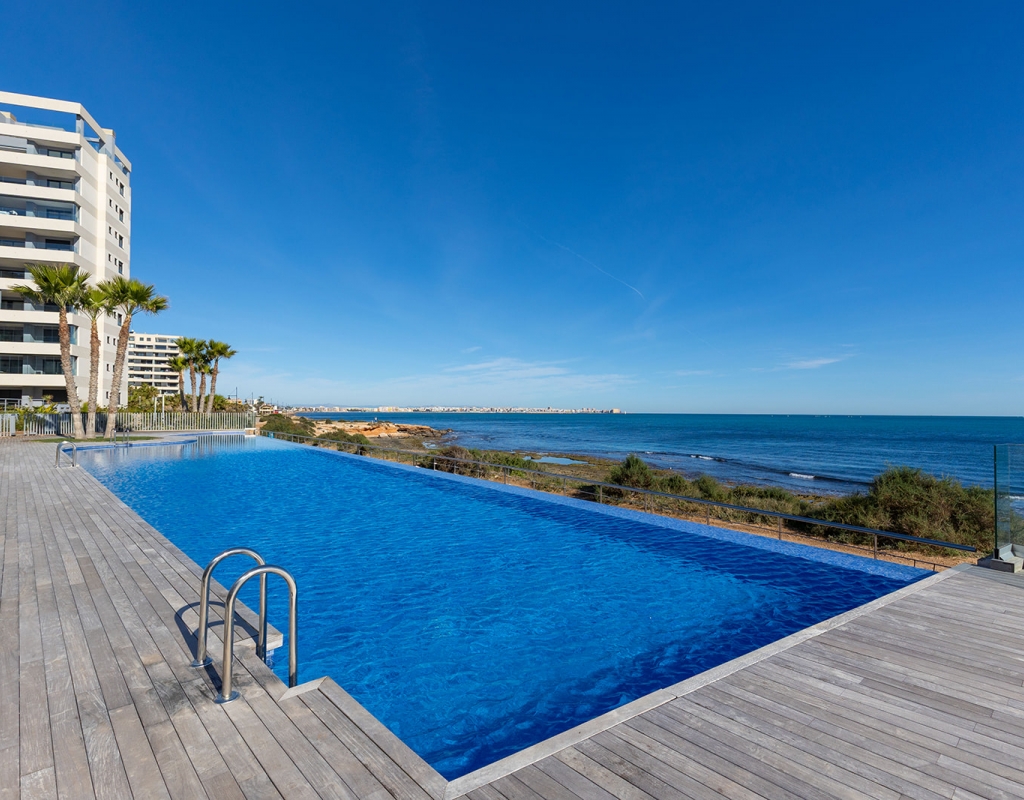 This exclusive 5th-floor apartment is located in the prestigious Posidonia residential complex, on the seafront in Punta Prima. Originally designed with three bedrooms, the property was modified off-plan to offer 94 m² of pure comfort, now distributed into two spacious bedrooms and two bathrooms, gaining exceptional spaciousness in the living areas. Its key strength lies in its double orientation and outdoor spaces: a 16 m² terrace with unobstructed views of the sea and the bay of Torrevieja, and a second 12 m² rear terrace facing south with views towards La Manga, guaranteeing sun, natural light, and cross ventilation throughout the day. The property is sold fully furnished, with an underground parking space and storage room included. The complex features high-standard common areas and security. Located within walking distance of amenities, supermarkets, and coves, it is approximately 45 minutes from Alicante Airport, combining luxury and comfort in one of the most sought-after areas of the Costa Blanca.