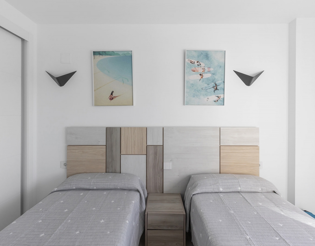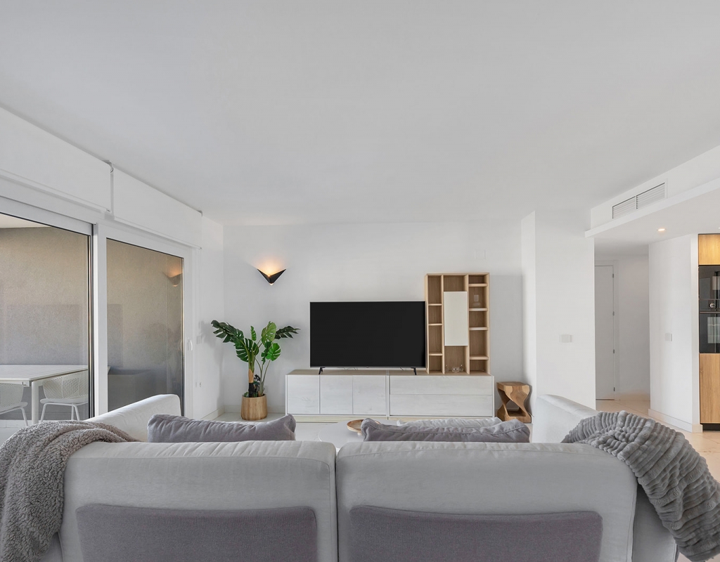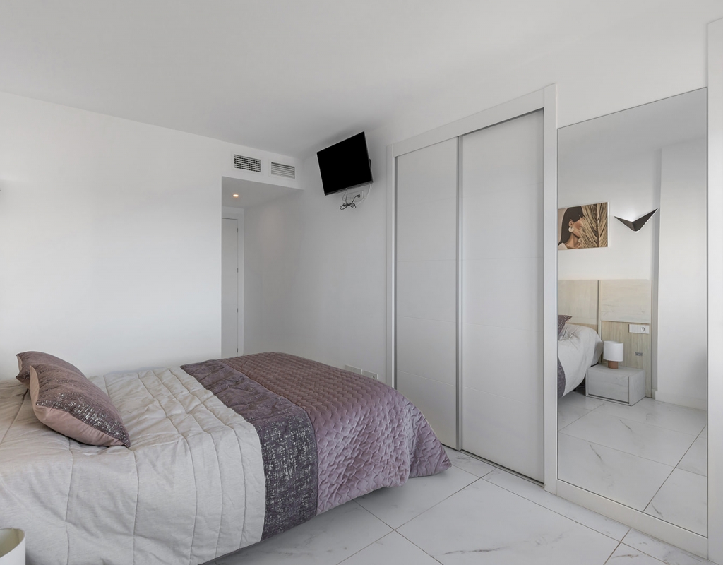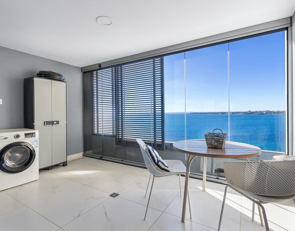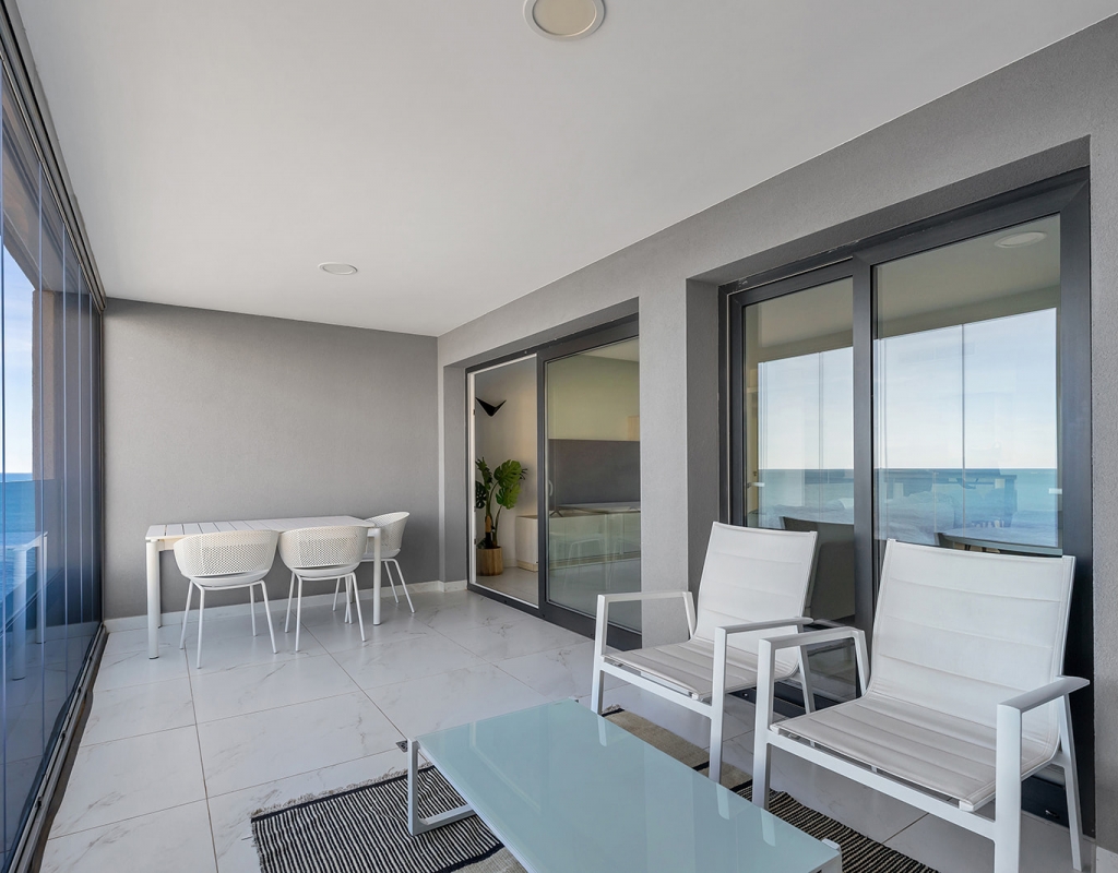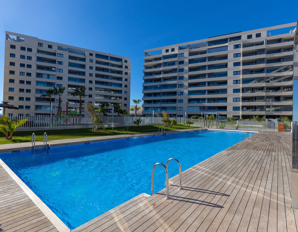 This exclusive 5th-floor apartment is located in the prestigious Posidonia residential complex, on the seafront in Punta Prima. Originally designed with three bedrooms, the property was modified off-plan to offer 94 m² of pure comfort, now distributed into two spacious bedrooms and two bathrooms, gaining exceptional spaciousness in the living areas. Its key strength lies in its double orientation and outdoor spaces: a 16 m² terrace with unobstructed views of the sea and the bay of Torrevieja, and a second 12 m² rear terrace facing south with views towards La Manga, guaranteeing sun, natural light, and cross ventilation throughout the day. The property is sold fully furnished, with an underground parking space and storage room included. The complex features high-standard common areas and security. Located within walking distance of amenities, supermarkets, and coves, it is approximately 45 minutes from Alicante Airport, combining luxury and comfort in one of the most sought-after areas of the Costa Blanca.