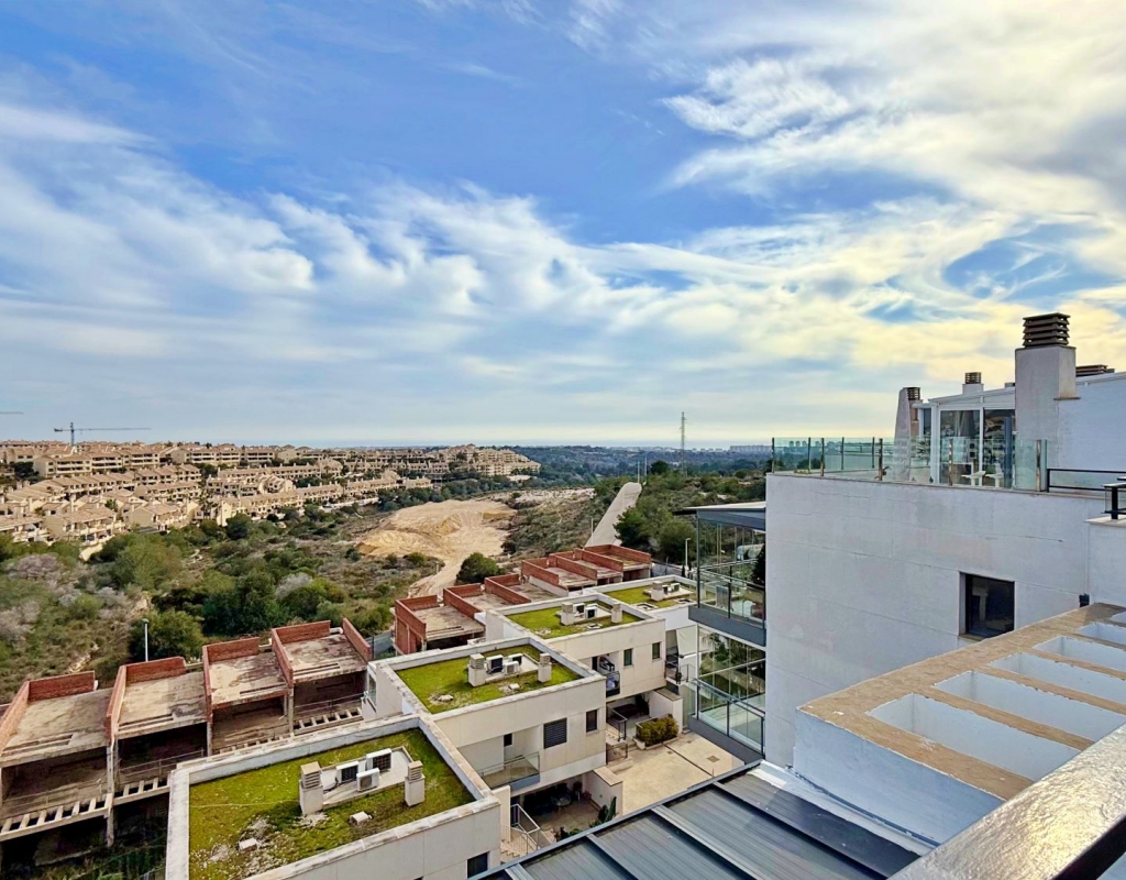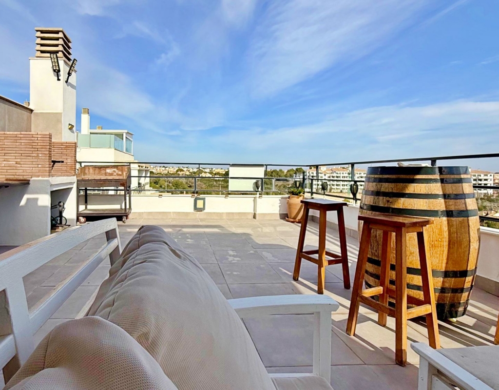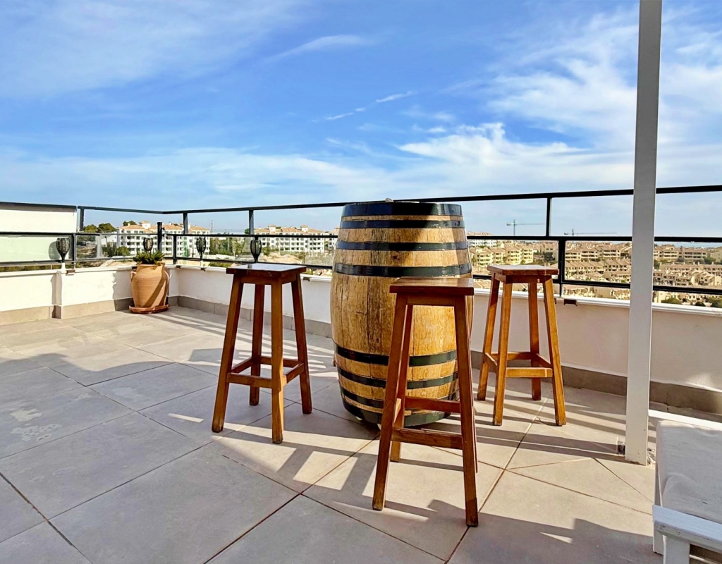 This spectacular penthouse in the exclusive area of Lomas de Campoamor offers a perfect combination of luxury and comfort with its 87 m² of living space in excellent condition and an impressive 52 m² private solarium equipped with its own kitchen to enjoy unforgettable dinners facing the Mediterranean while contemplating the sunset in an environment of maximum privacy The property features 2 large bedrooms with fitted wardrobes and 2 full bathrooms with quality finishes highlighting its bright south orientation which guarantees sun all day long as well as a magnificent glass-enclosed terrace that is fully integrated into the living room expanding the living space and creating a bright and welcoming open-plan atmosphere that allows you to enjoy the unobstructed sea views from inside the home at any time of the year Strategically located next to the prestigious golf course and just 3 km from the paradisiacal beaches of the area the property has all modern amenities such as air conditioning with hot and cold air system along with a parking space included in the price All this is located within a high-level private urbanization that features permanent security services access control and surveillance cameras for your total peace of mind and that of your family representing a unique opportunity for both a permanent residence or a secure investment in one of the most sought-after and well-maintained areas of the Costa Blanca where silence and exclusivity merge with the proximity to all necessary services such as shopping centers restaurants and top-level leisure areas