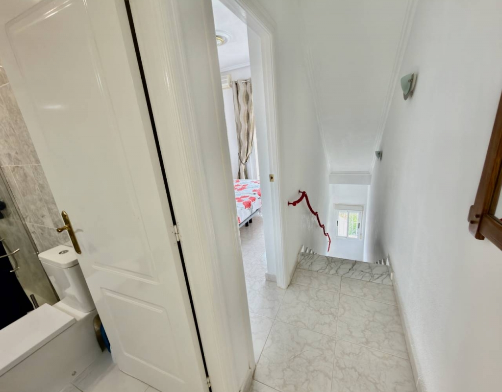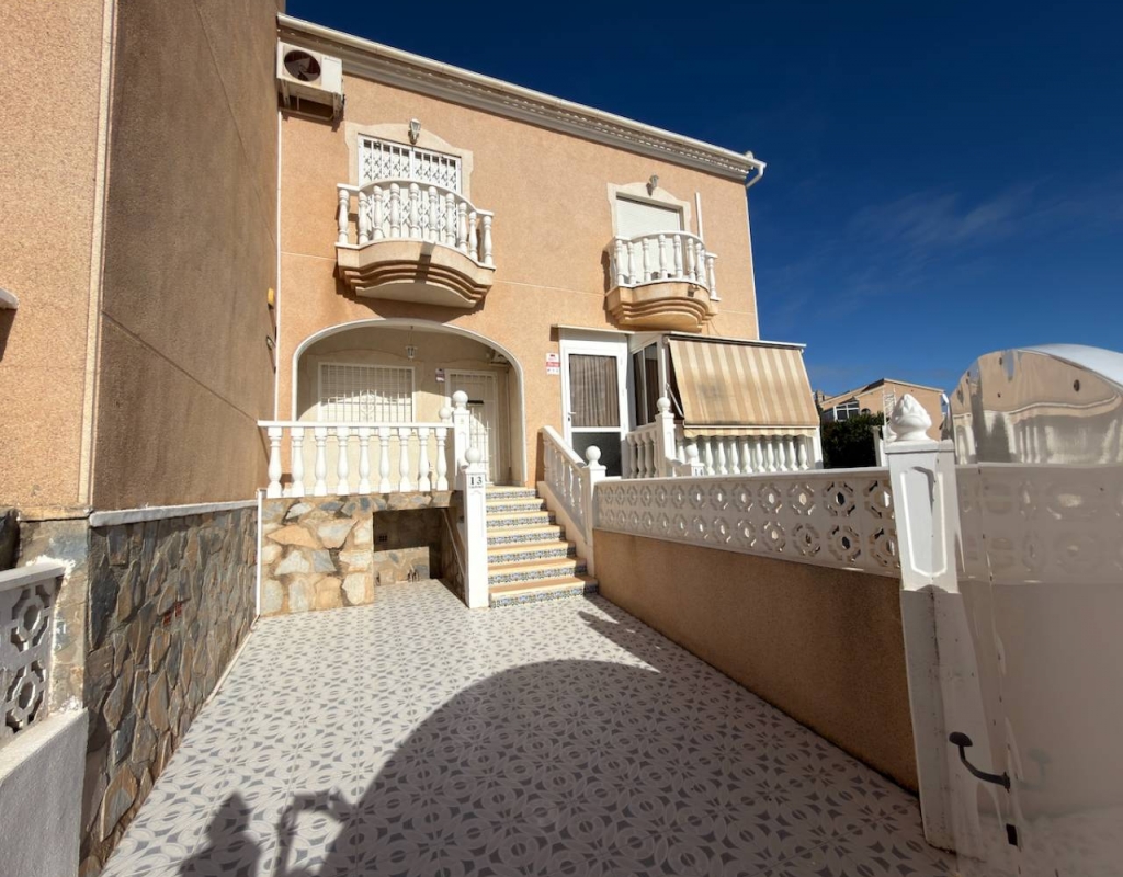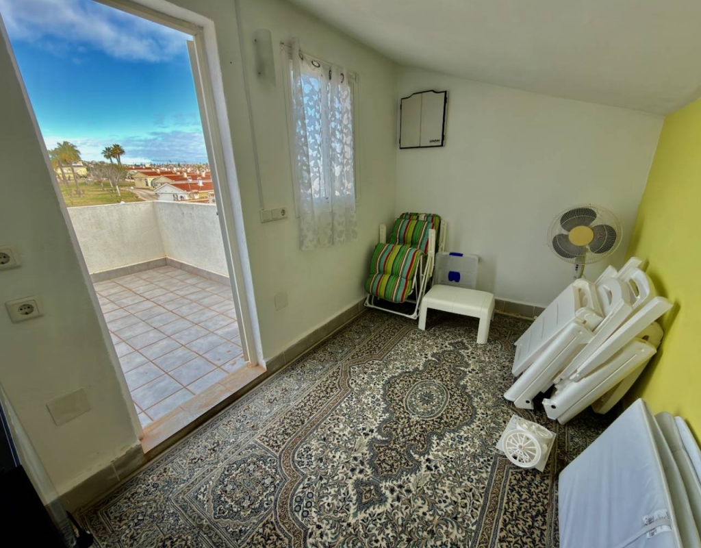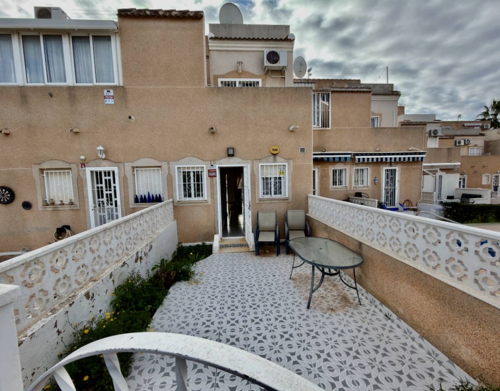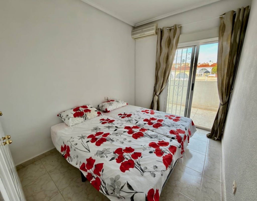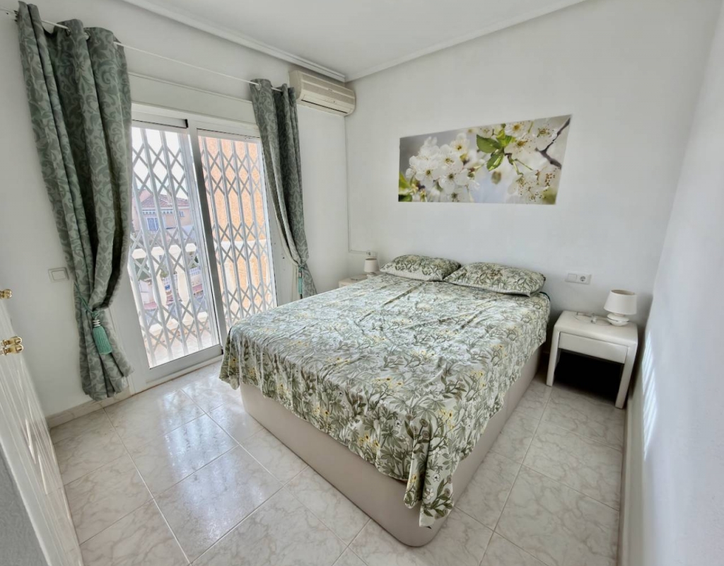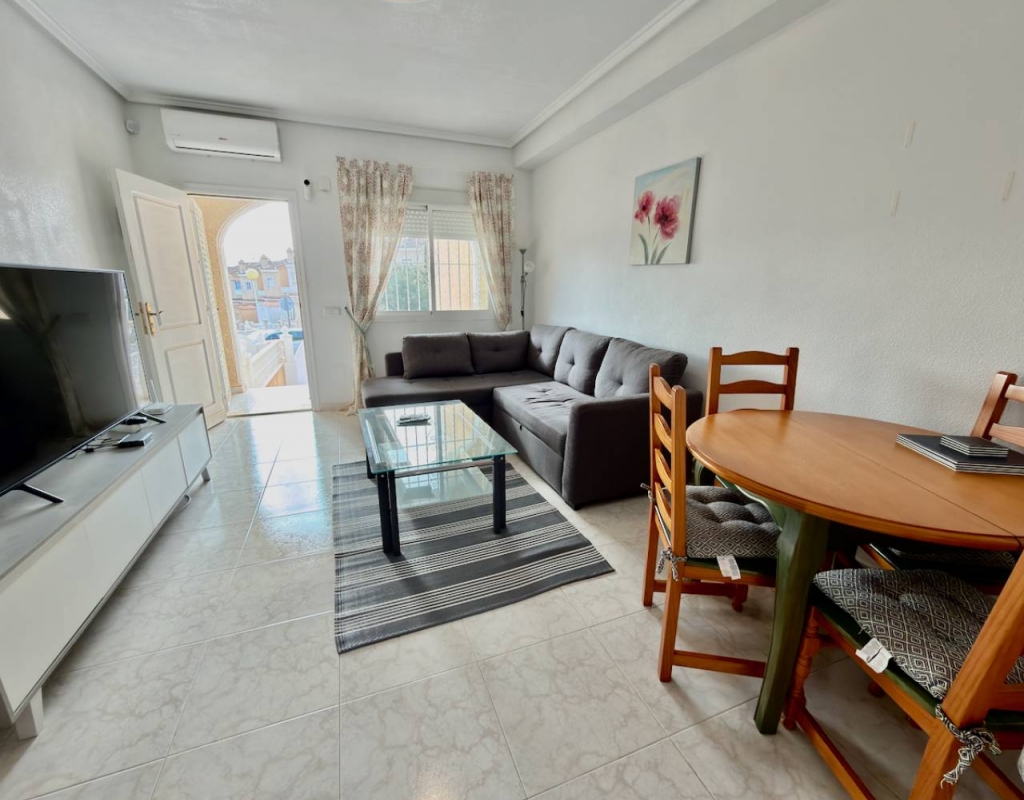 South-Facing Home with Private Solarium This well-presented two-bedroom property is offered in excellent condition and enjoys a desirable south-facing orientation, providing abundant natural light throughout the day. The home features a bright open-plan living and dining area with an American-style kitchen, creating a modern and sociable living space. The kitchen comes fully equipped with white goods, while air conditioning and ceiling fansensure comfort all year round. There are two bedrooms, both with built-in wardrobes, a family bathroom, and a separate guest toilet. The property also benefits from a storage room for added convenience. Outdoor living is enhanced by a private solarium offering pleasant garden views, perfect for relaxing or entertaining. Residents can also enjoy access to a communal swimming pool. Off-road parking is included, providing one designated parking space. Ideally located within walking distance to amenities, the property is just 5 minutes from local shops and services, 15 minutes from the beach and golf courses, and approximately 30 minutes from the airport. Offered fully furnished, this home is ideal as a permanent residence, holiday retreat, or rental investment.