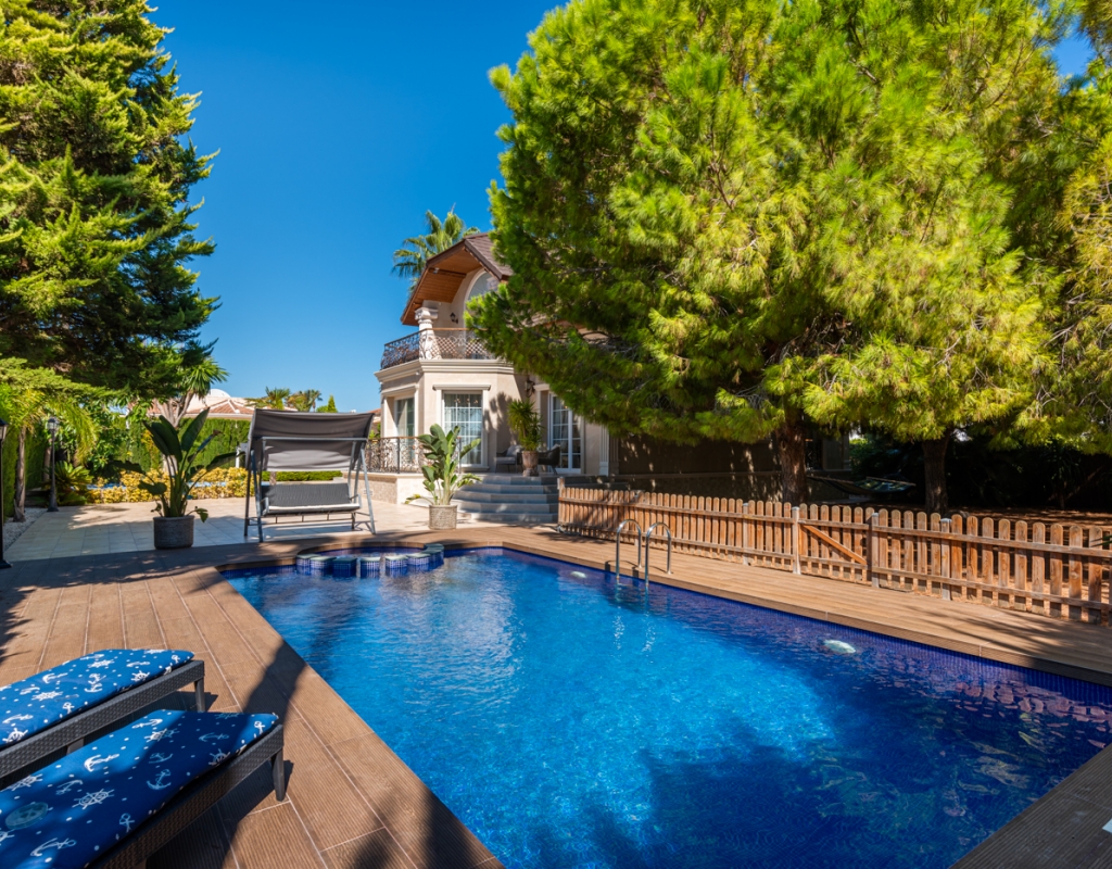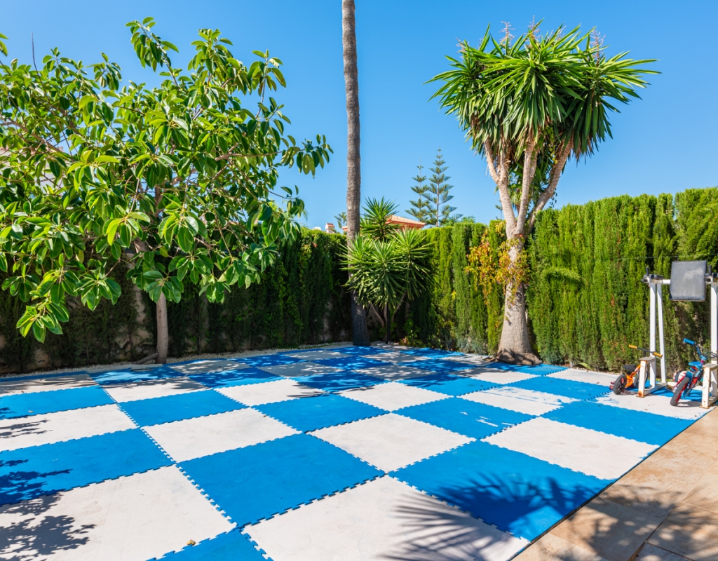 The plot is 882sqm where you will find the area with saltwater pool m8 x 4m, outdoor kitchen with barbecue and a kids playground. You will find plenty of space to have several seating areas and sun loungers.