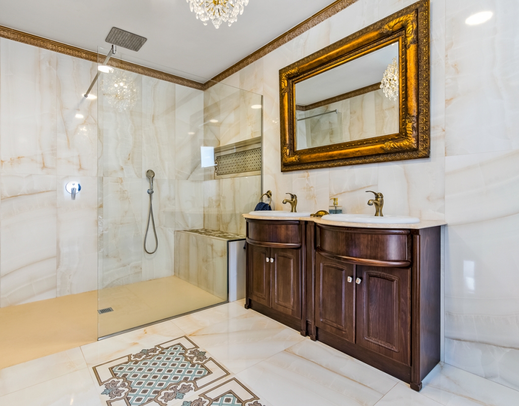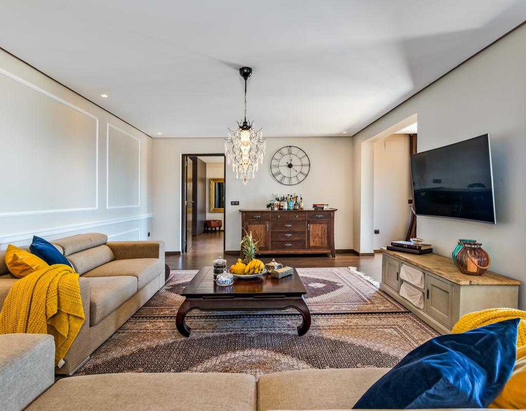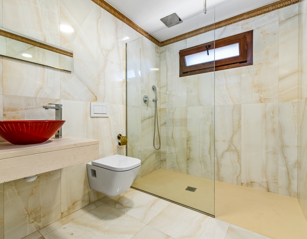 The villa boasts an abundance of natural light, thanks to the large windows (floor to ceiling in the top level). The interiors of the villa feature high-end finishes and luxurious materials, creating a sophisticated ambiance throughout. In addition, the villa is equipped with air condition, underfloor heating, smart-home system, integrated loudspeakers, safety windows from Schüco.