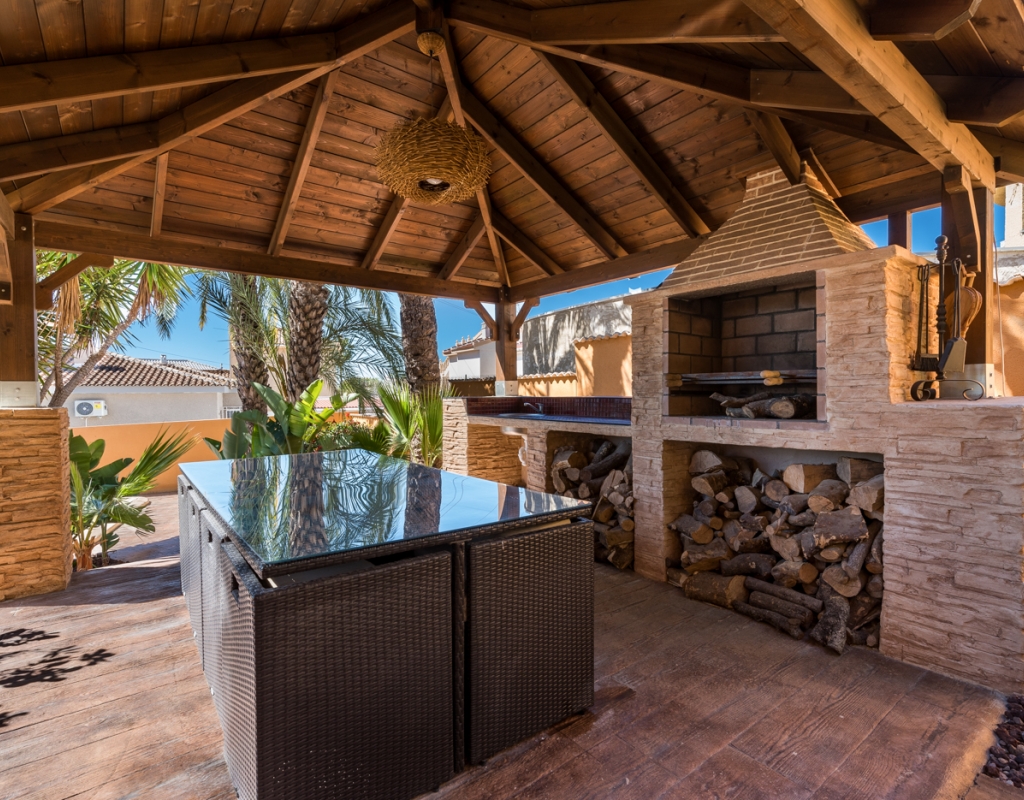 The outdoor area is featuring a swimming pool, a beautifully landscaped garden, and multiple entertainment spaces. Whether you're lounging by the pool, hosting a barbecue, or enjoying a quiet afternoon in the sun, this villa offers the perfect setting for outdoor living and entertaining. There is also parking on the plot for 2 cars with a charging point.