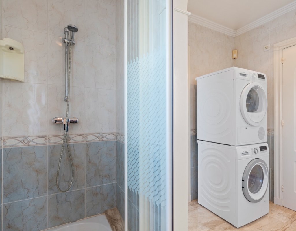On the upper floor is a spectacular master suite, which features a bathtub and private shower, as well as access to two separate terraces. On this floor, we also find two additional bedrooms, a full bathroom, and a shared terrace.