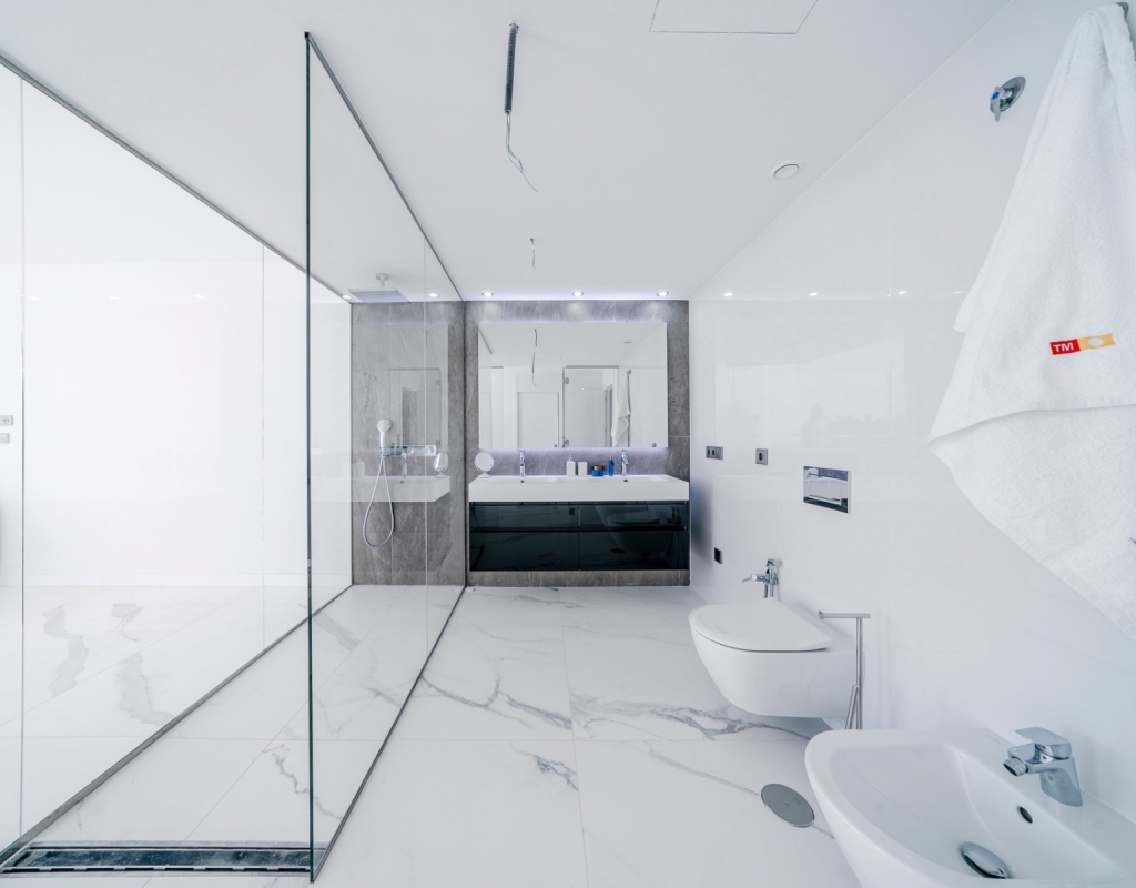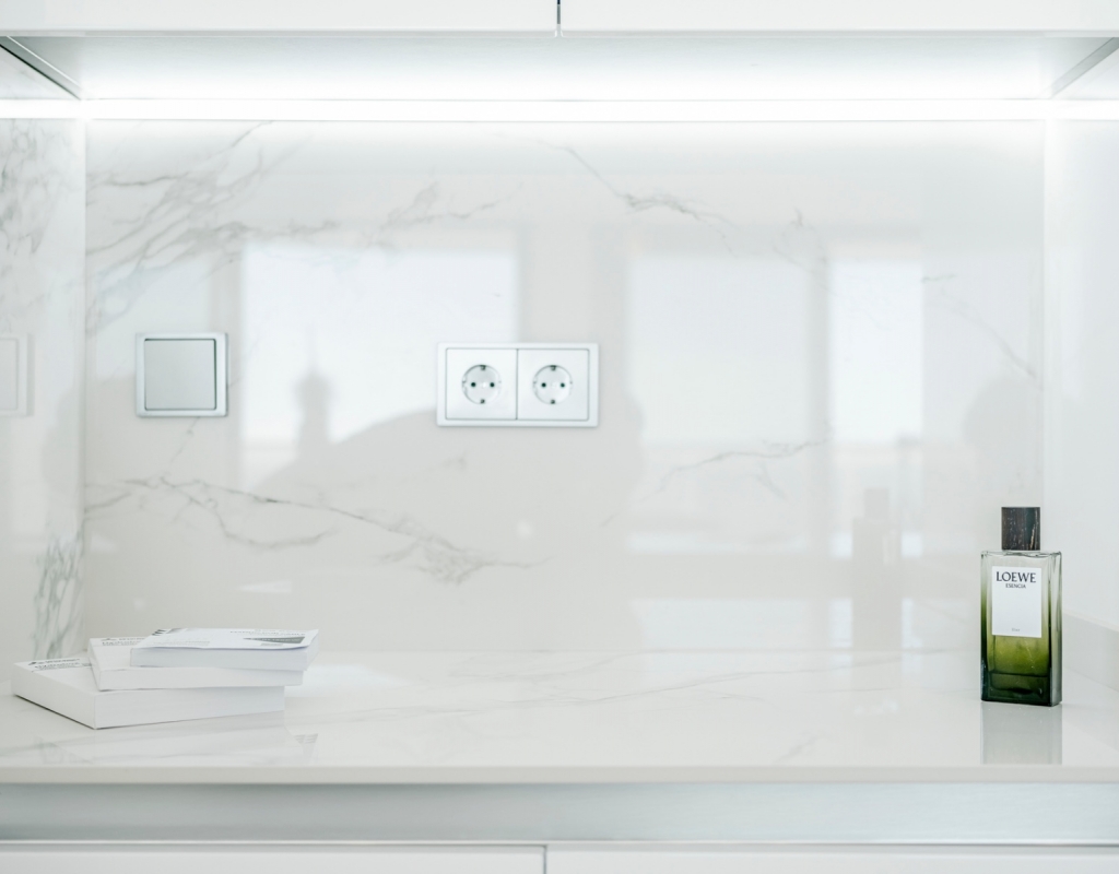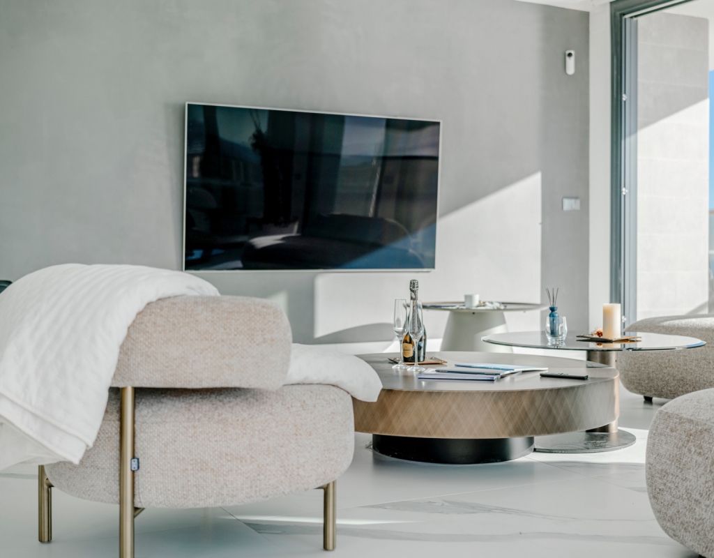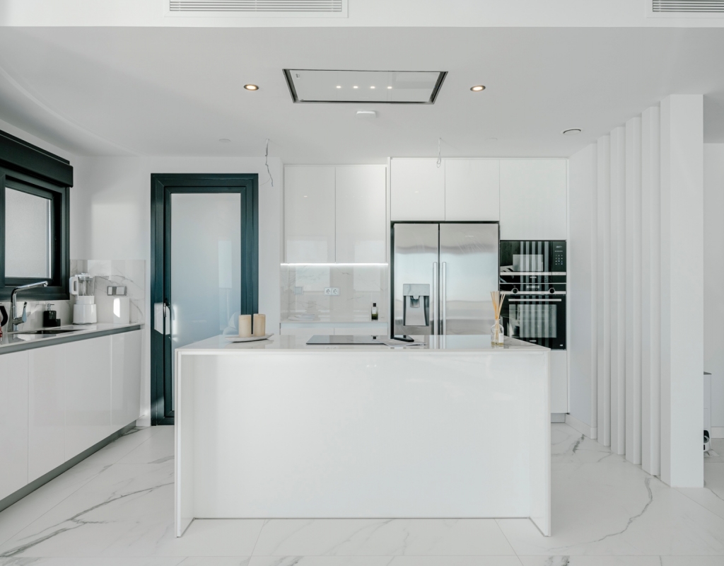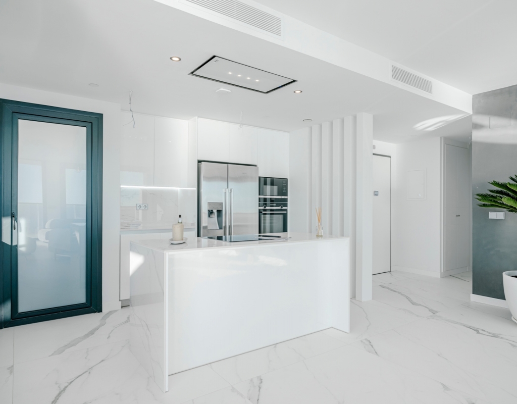 The spacious living area is bathed in natural light, featuring an open-concept kitchen equipped with high-end Samsung smart appliances and exclusive Porcelanosa finishes. With its seamless design and premium materials, this space is perfect for both everyday living and entertaining.