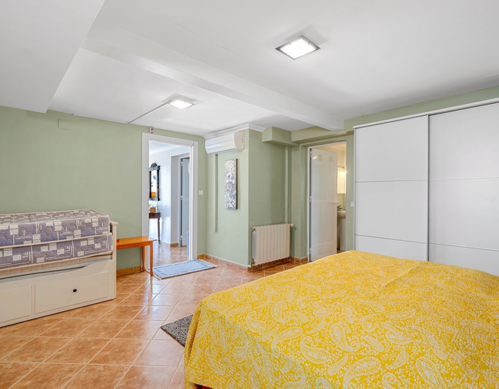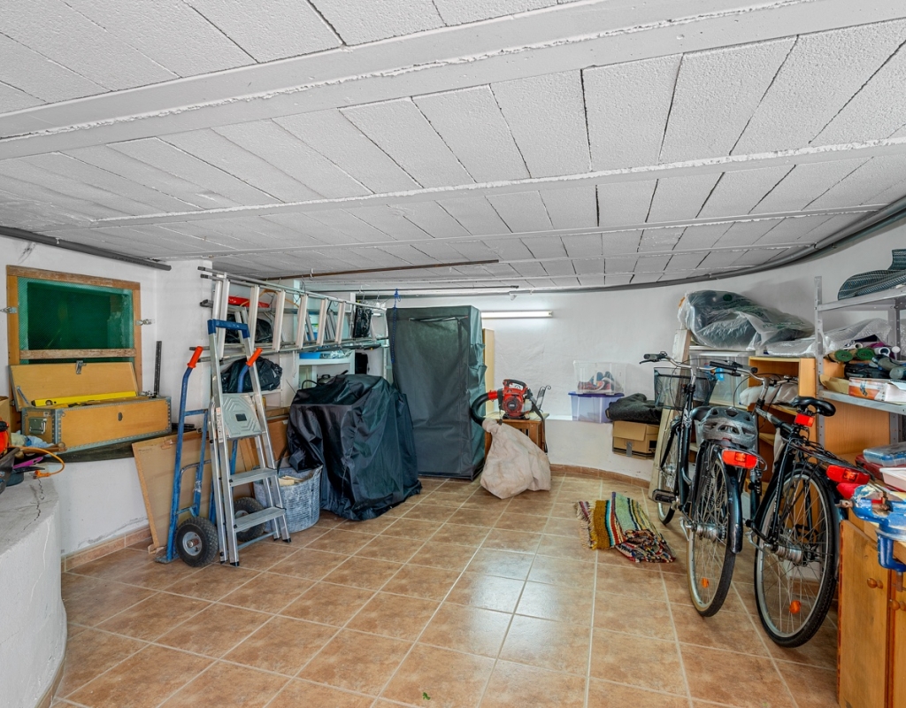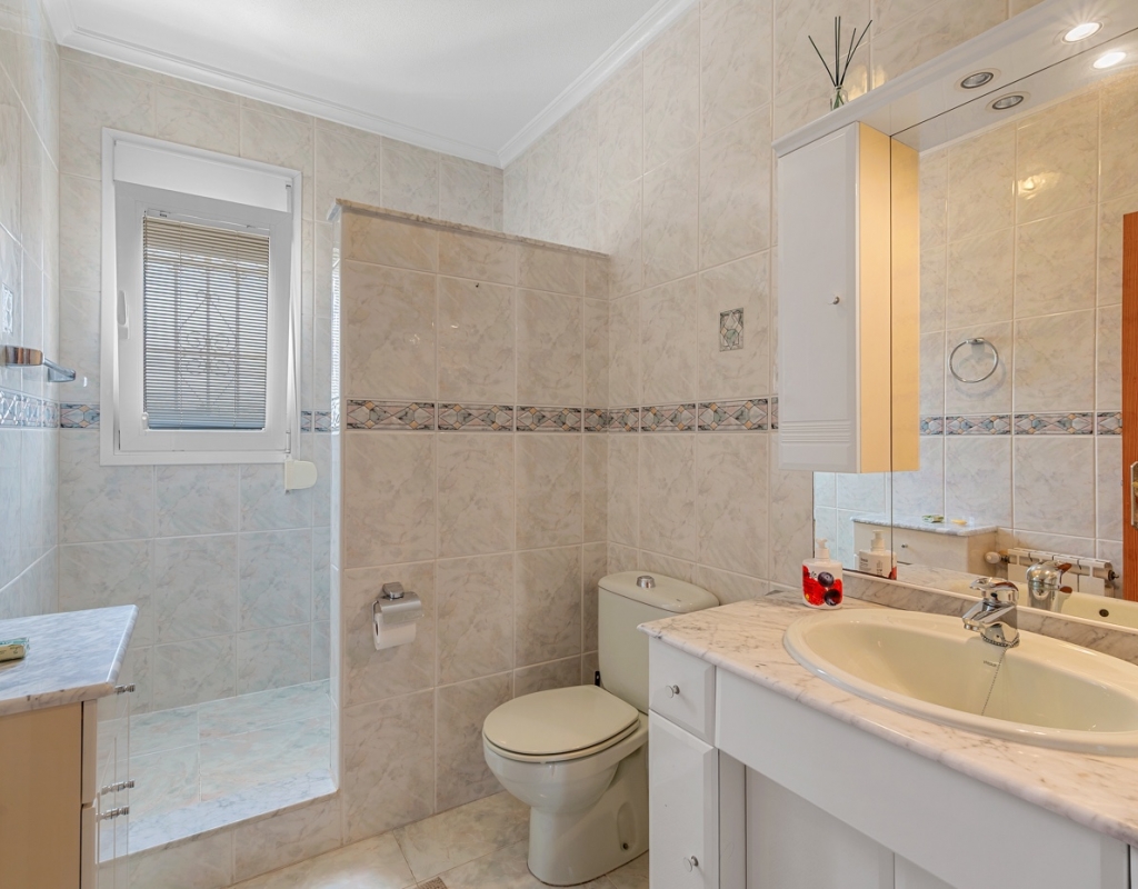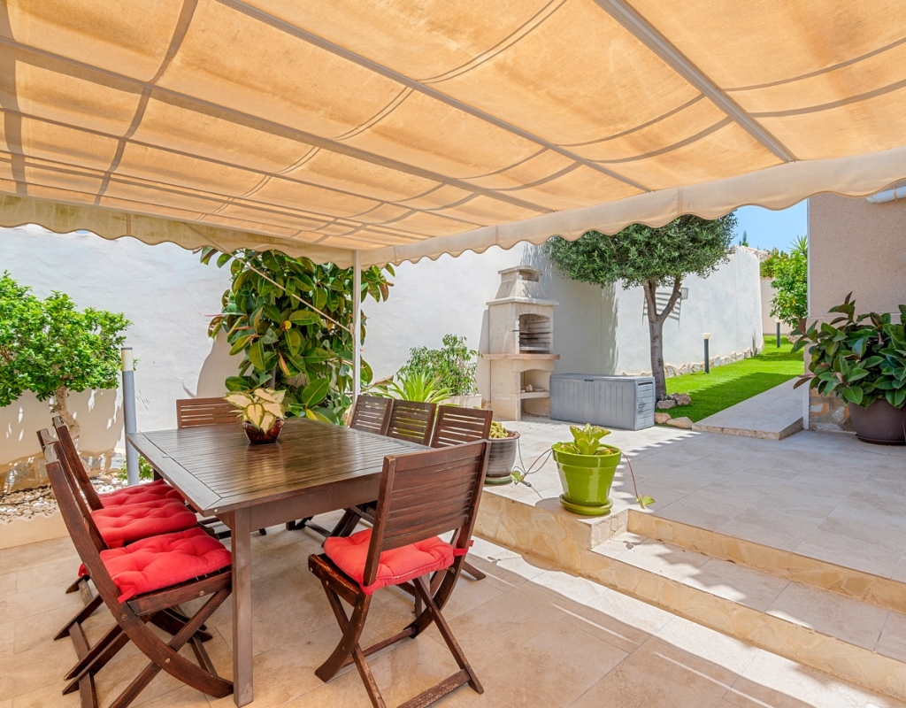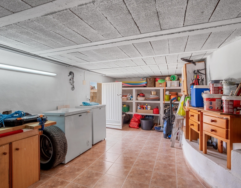 Outdoor areaThe villa is set on a south facing plot of 500 m2. The garden is well maintained with tiles and plants. You can find a swimming pool (salt water), an outdoor shower, a carport, a BBQ area, a storage room and several outdoor seating areas. The garden has automatic irrigation system.