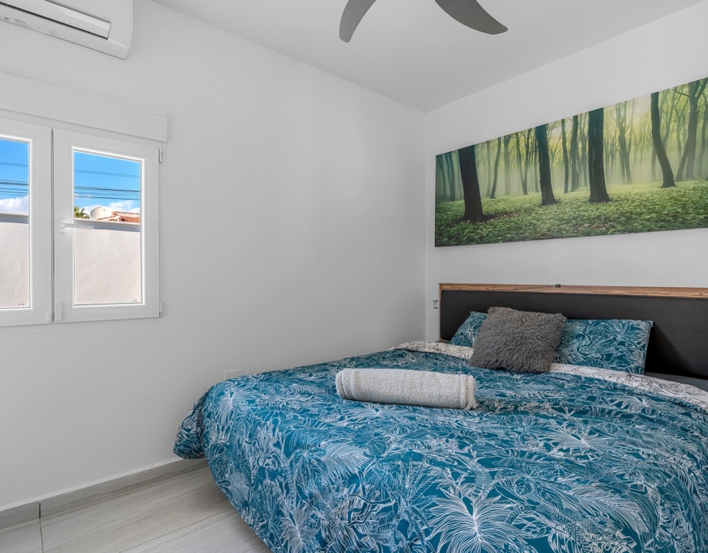 The main floor comprises four bedrooms, all equipped with individual air conditioning, two full bathrooms, a spacious and bright living-dining room, and a functional open-plan kitchen that integrates seamlessly into the living area.