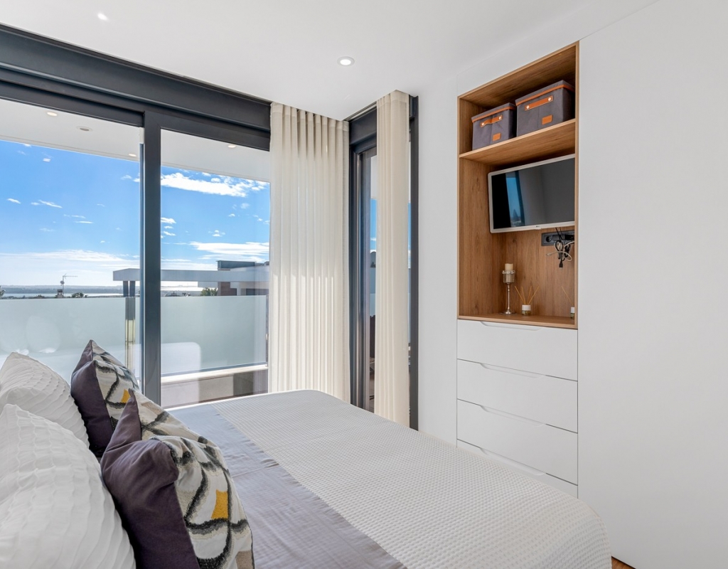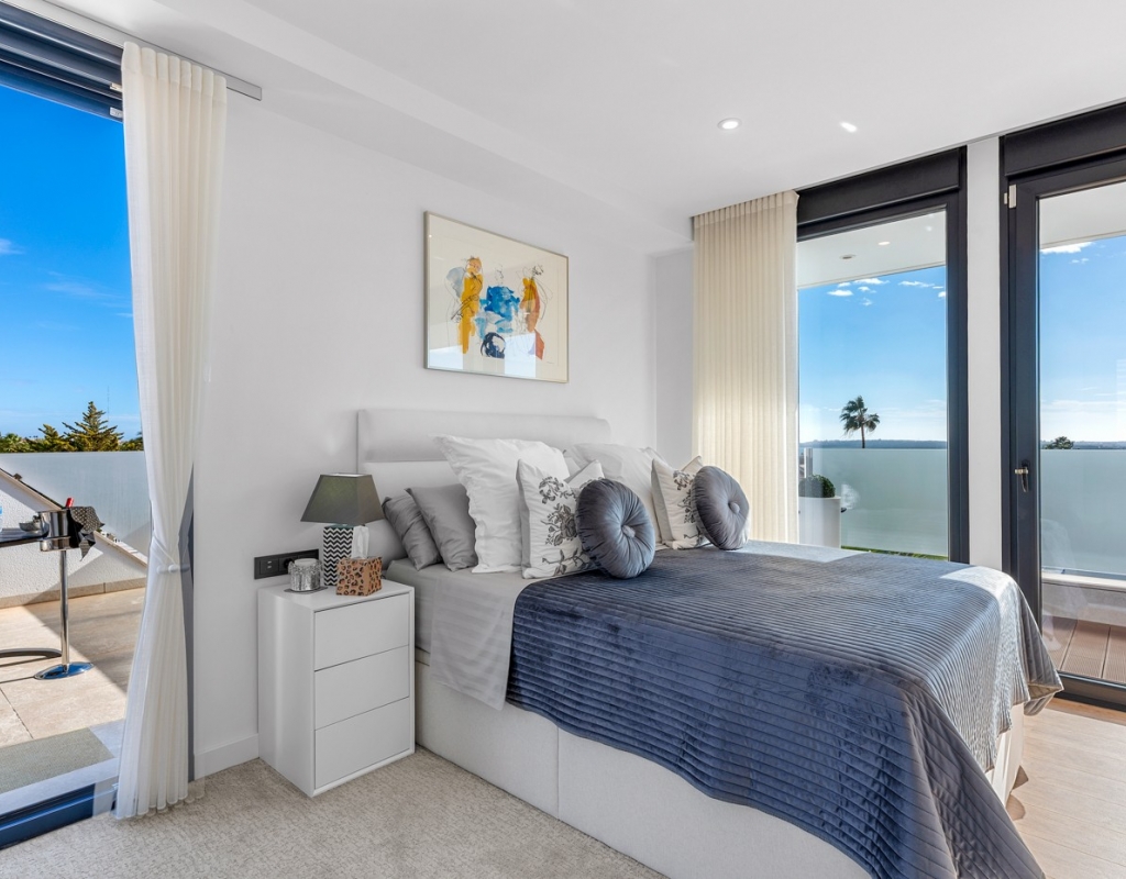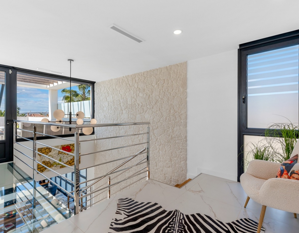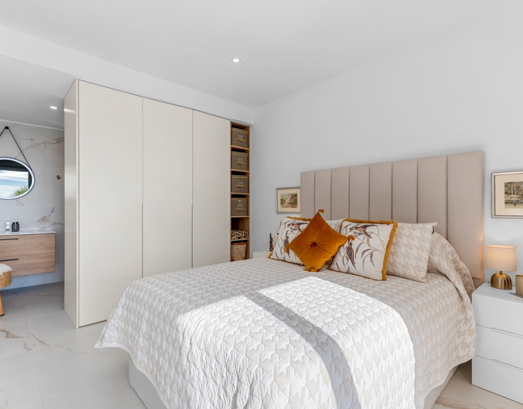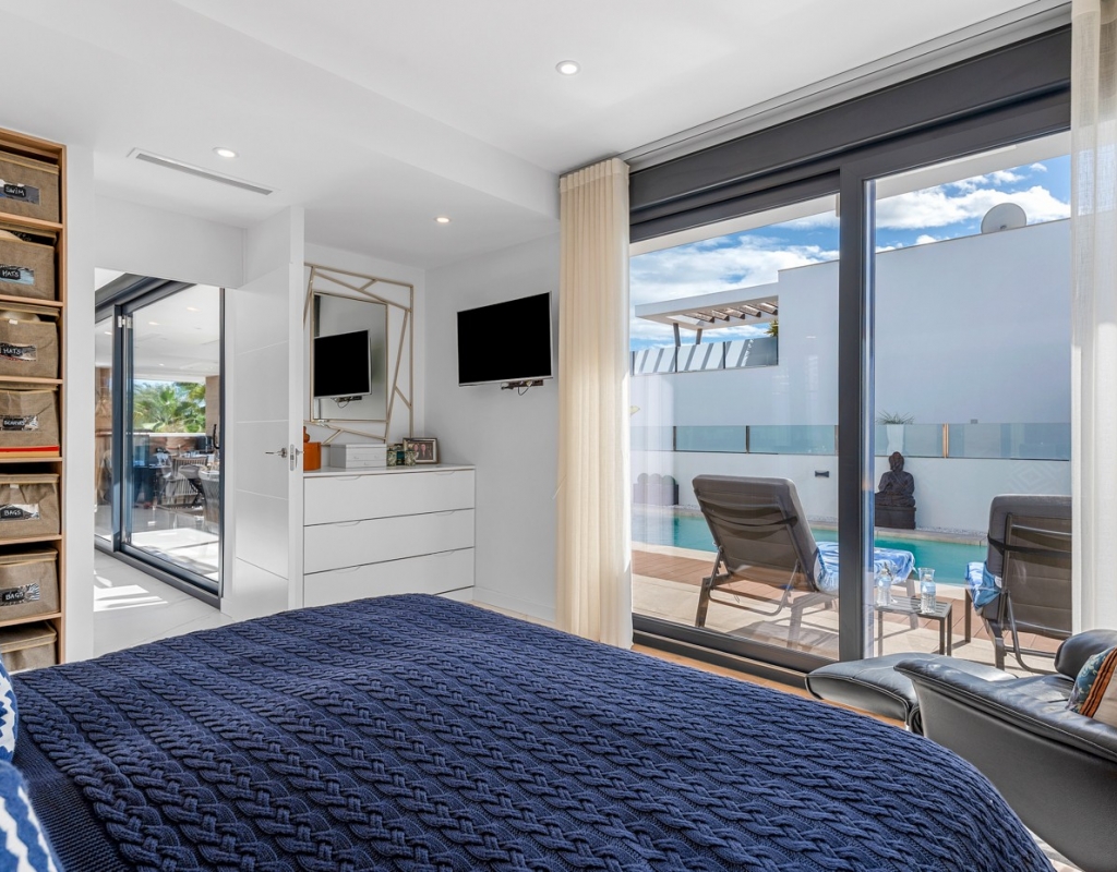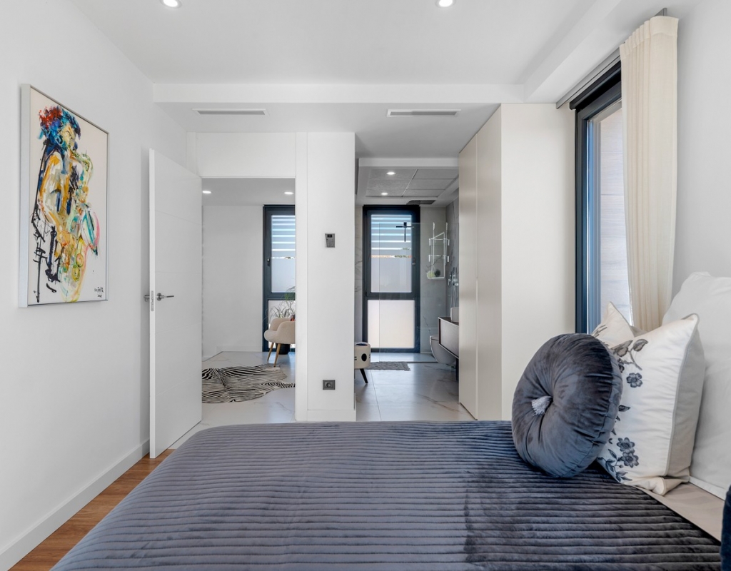 The ground floor also houses two elegantly appointed bedrooms are located on this level, one to the left and one to the right each with en-suite bathrooms, built-in wardrobes, garden, pool views, and partial vistas of the Salt Lakes. Underfloor heating runs throughout the entire property, enhancing comfort in every season, while a fully integrated smart home system allows complete control of the villa remotely from anywhere in the world.