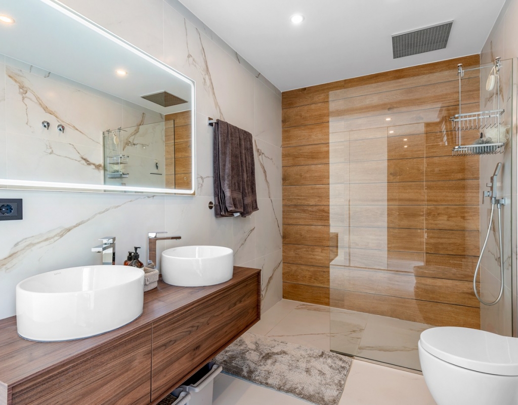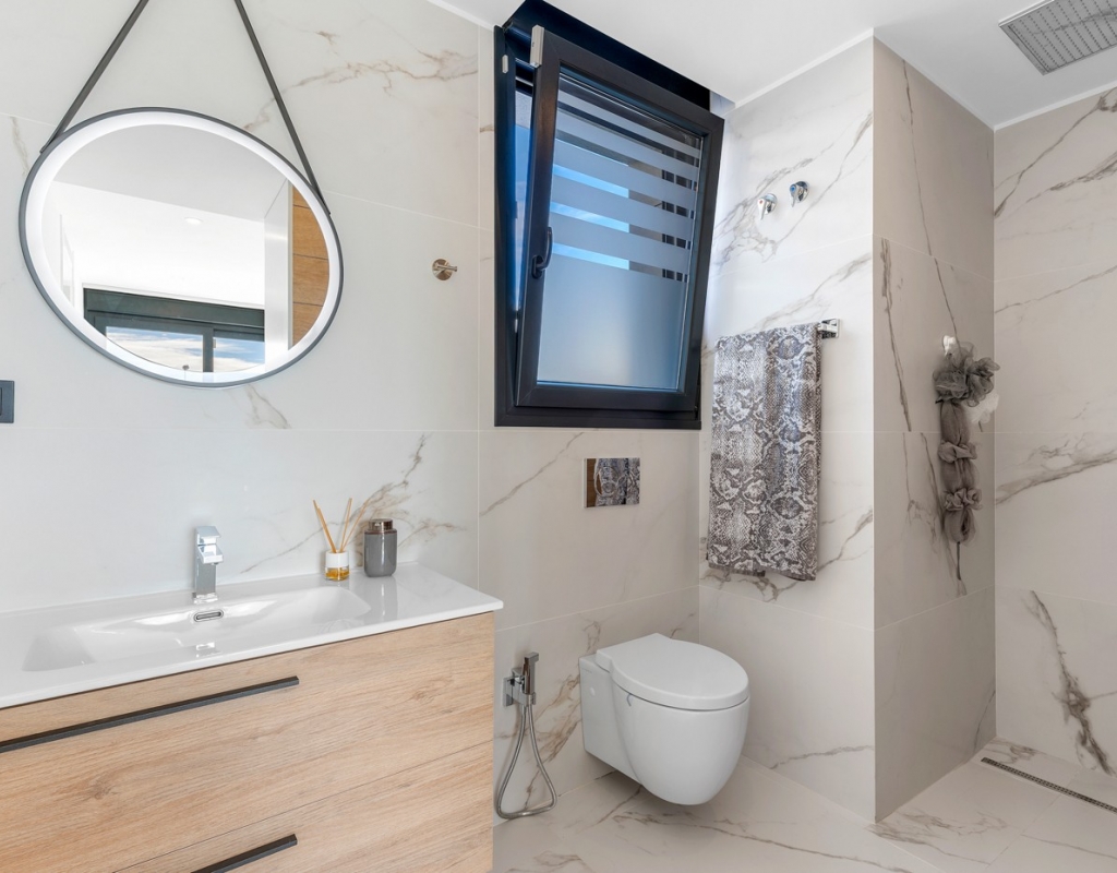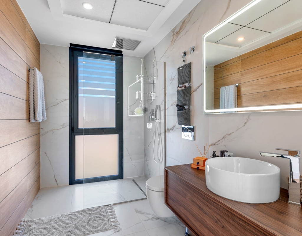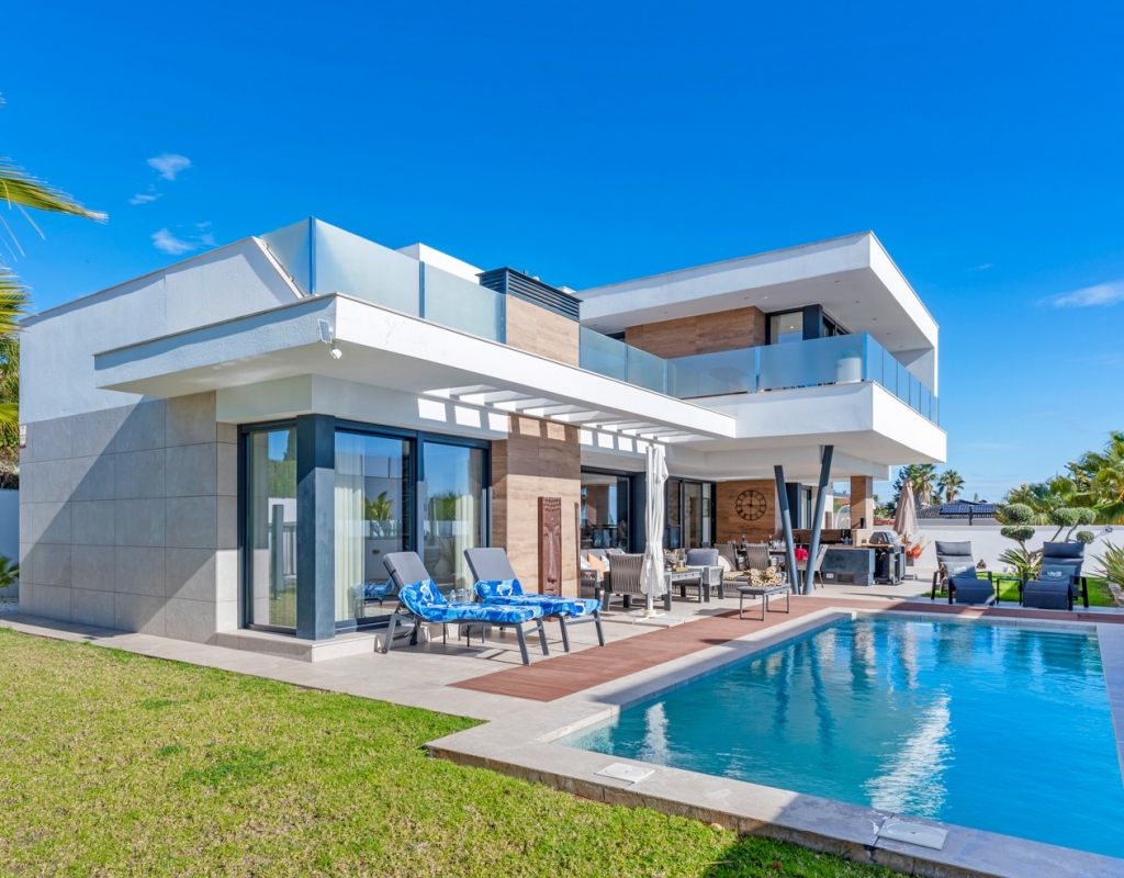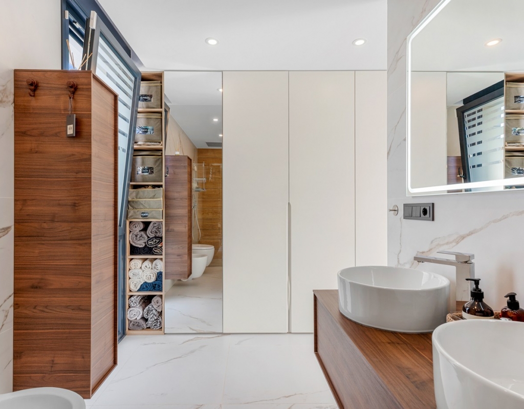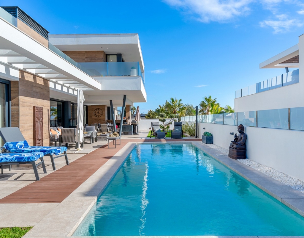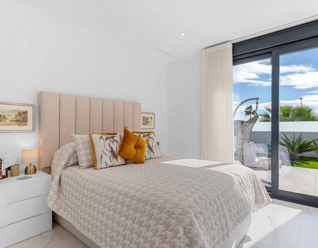 The ground floor also houses two elegantly appointed bedrooms are located on this level, one to the left and one to the right each with en-suite bathrooms, built-in wardrobes, garden, pool views, and partial vistas of the Salt Lakes. Underfloor heating runs throughout the entire property, enhancing comfort in every season, while a fully integrated smart home system allows complete control of the villa remotely from anywhere in the world.