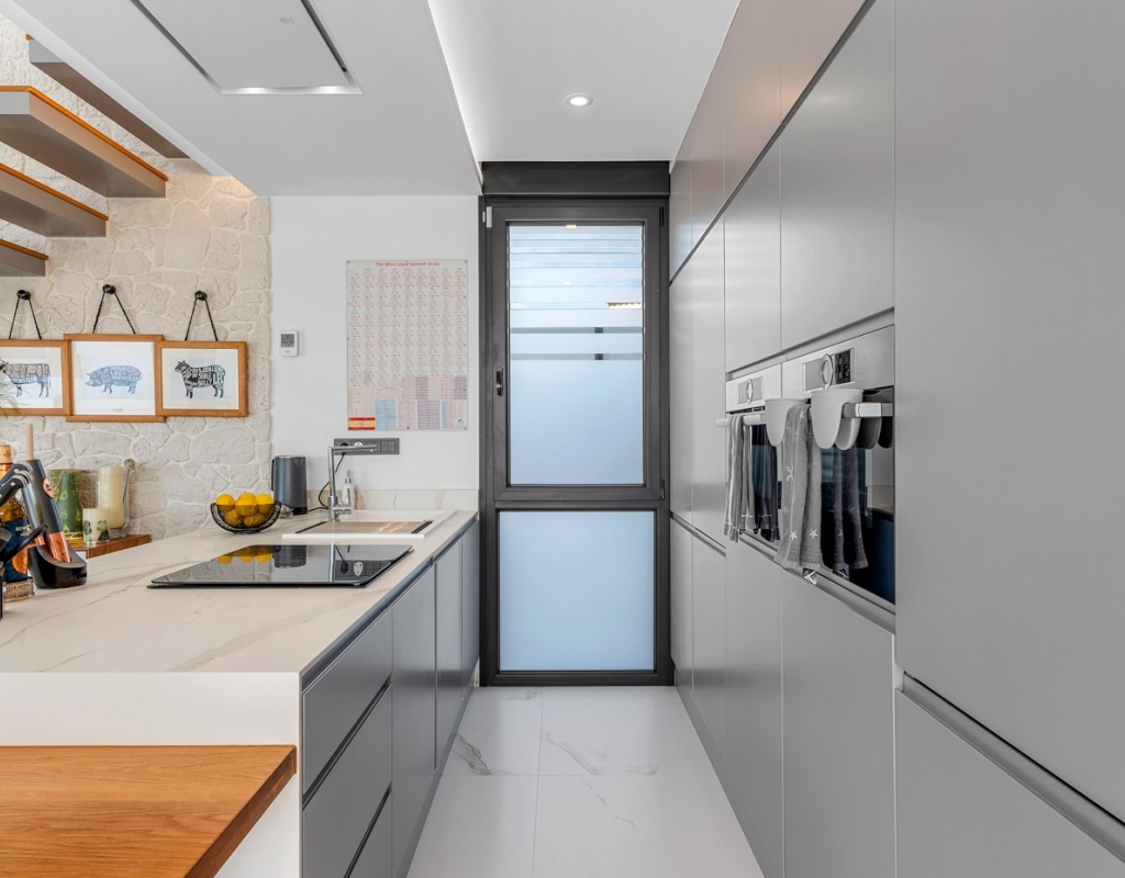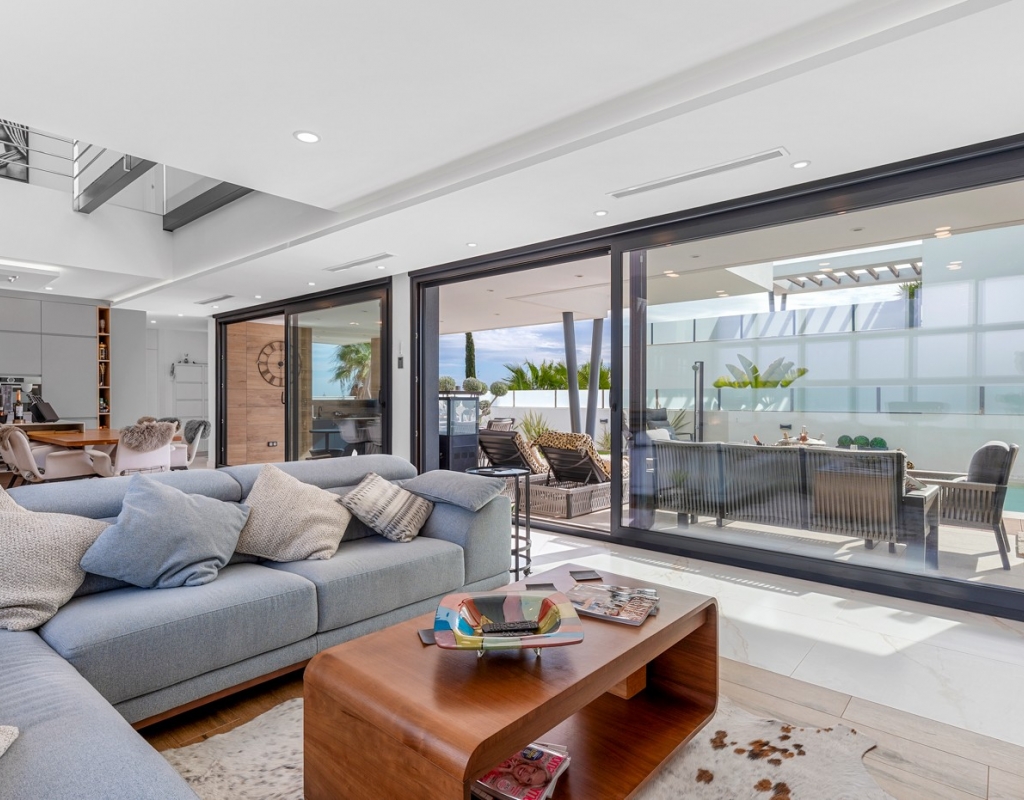 You will also find separate access via a glass walkway to the expansive rooftop terrace, designed for entertaining with comfortable seating and a stylish, fully equipped bar — the perfect setting for elegant gatherings or relaxed evenings, all while enjoying uninterrupted views of the Mediterranean and spectacular sunsets.