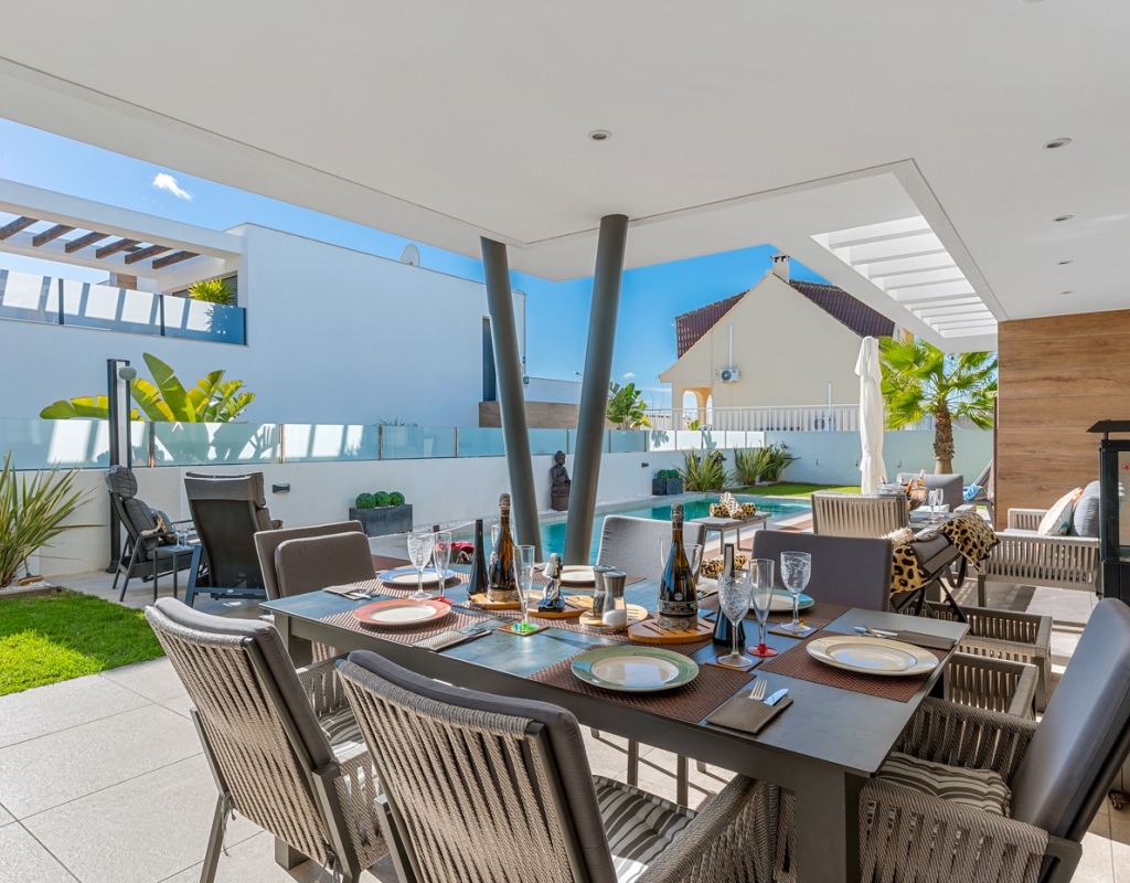 Internally, the villa spans two levels and is designed to maximise light, flow, and functionality. The entrance hall separates the main living spaces, leading to an open-plan lounge, dining, and kitchen area, featuring bespoke furniture, contemporary finishes, and full-length patio doors opening to the garden and pool terraces. The high-spec kitchen is fitted with premium Bosch appliances and includes an integrated family dining table.