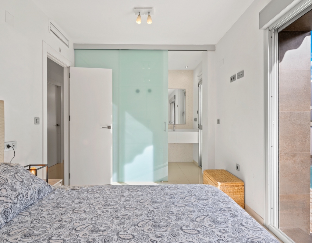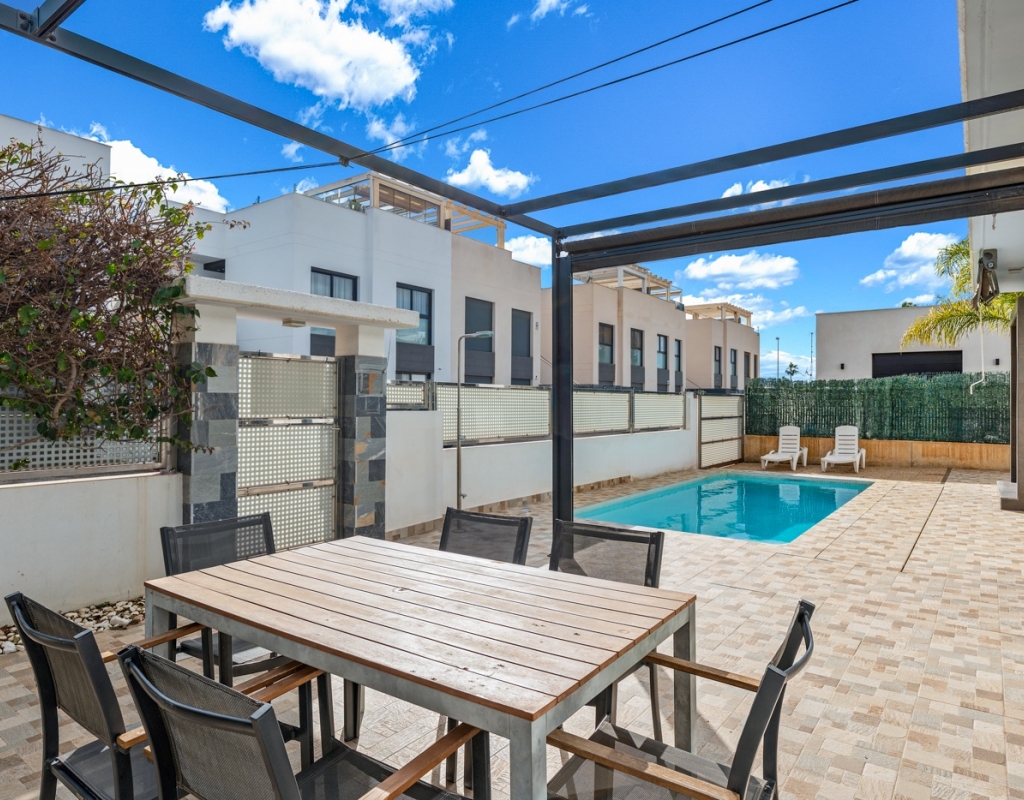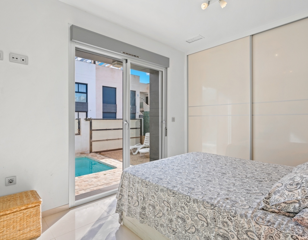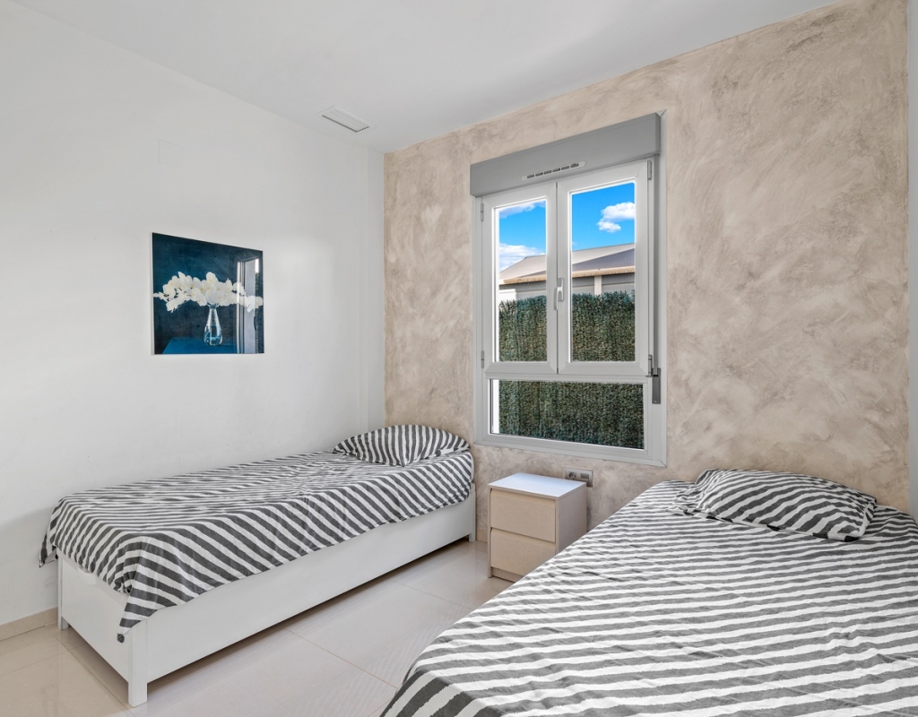 The house boasts 90 m² of living space on a 230 m² plot, offering a perfect balance between interior comfort and outdoor areas to fully enjoy the Mediterranean climate. It features three bedrooms and two bathrooms, with the master suite featuring a private bathroom and a large window overlooking the pool area, allowing for fantastic natural light throughout much of the day.