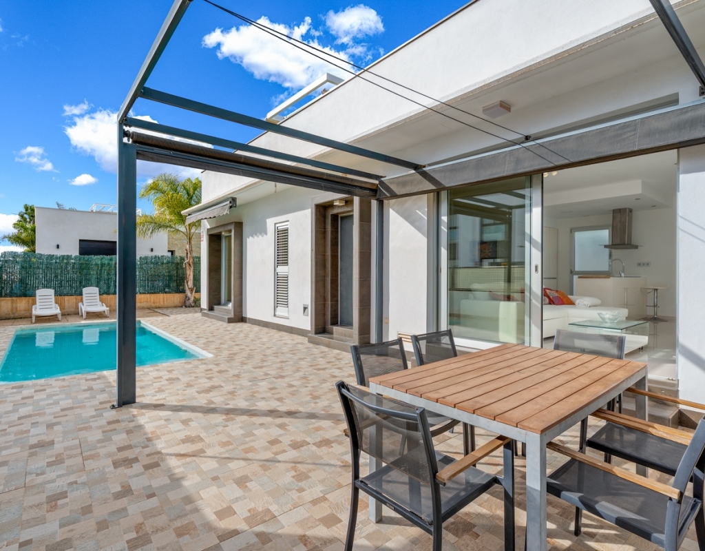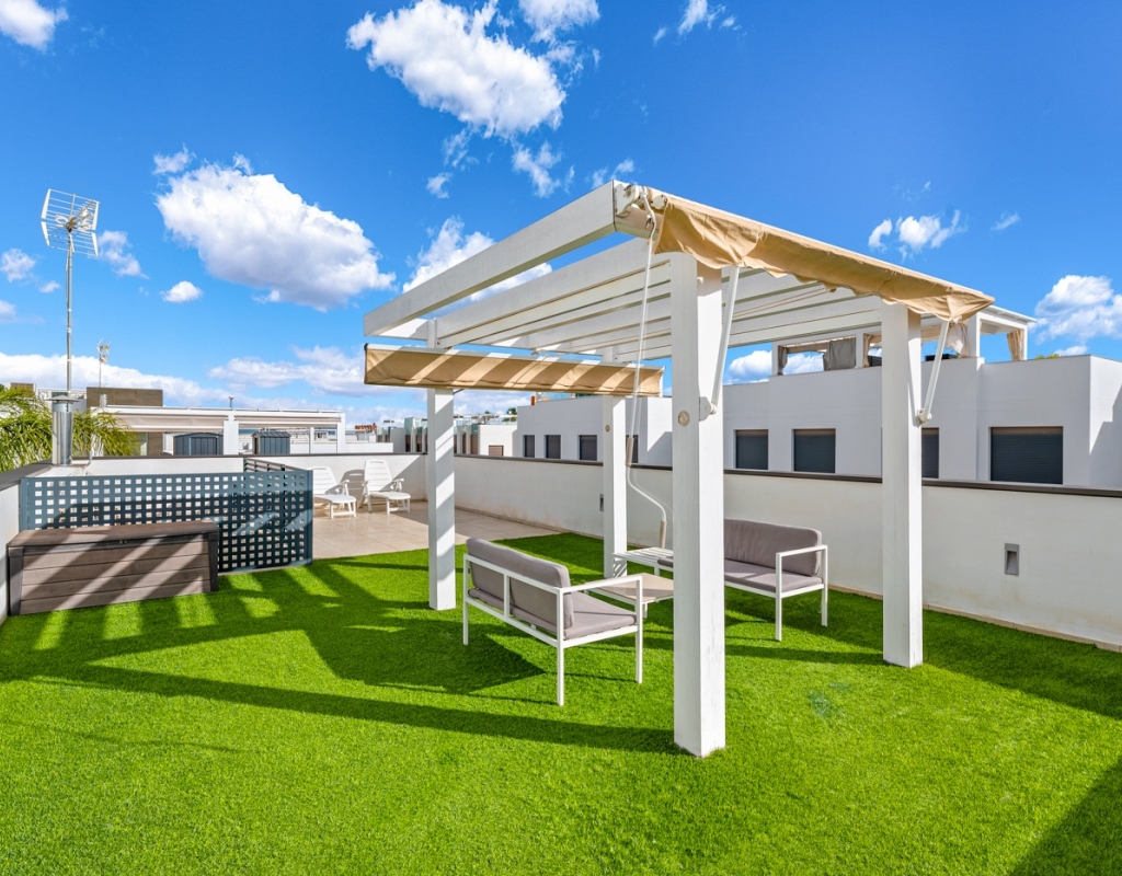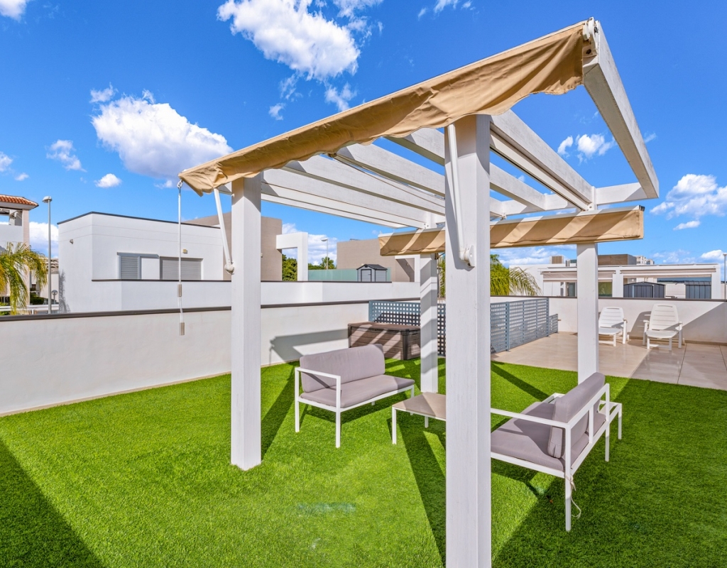 Designed for comfort, the house includes awnings and two aluminum pergolas: one on the main terrace, ideal for al fresco dining in the shade, and another on the solarium, a privileged space to enjoy the sun year-round, read, have a drink at sunset, or simply unwind.