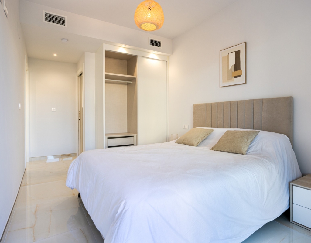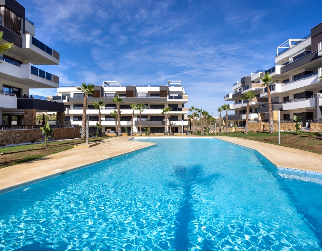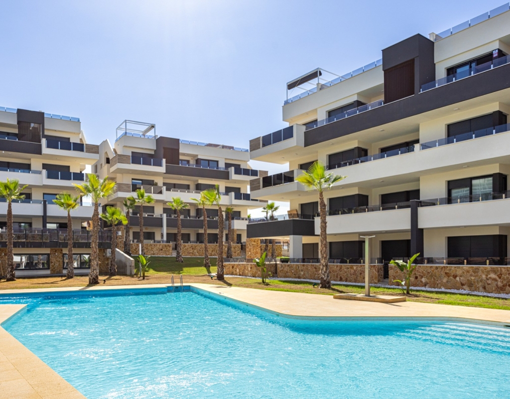 Discover this bright and modern second-floor apartment in a contemporary new-build project in Orihuela Costa, less than six months old! Designed for maximum comfort, it combines clean lines, open spaces, and modern finishes, creating a sense of space and well-being in every corner. Upon entering, you're greeted by an open-plan living and dining area, bathed in natural light from the terrace. The open-plan layout flows seamlessly into the American-style kitchen, fully equipped with state-of-the-art appliances, ideal for those seeking functionality without compromising on style. The apartment features two spacious bedrooms, both with fitted wardrobes that maximize space and add elegance to the overall design. The two modern and stylish bathrooms feature high-quality finishes, creating a relaxing and sophisticated atmosphere. Amenities that make the difference: This property is ready to move into and is sold fully furnished, as shown in the photos.Tastefully decorated, it is designed to create a warm and inviting atmosphere.Air conditioning provides year-round comfort. Security door and intercom for added security.Direct elevator access to all floors.Perfect outdoor spaces to enjoy the Mediterranean climate. The complex offers a beautiful communal swimming pool, an ideal place to relax, sunbathe, or spend time with family. The property also includes a private underground garage with one parking space, as well as a storage room, perfect for additional storage. Strategic location in Orihuela Costa The property is situated in a prime location, surrounded by amenities and attractions:Beach: just 8 minutes away, perfect for day trips.Leisure areas, restaurants, and shops: 3 minutes away.International golf courses: 7 minutes away.Airport: 40 minutes away, with easy access to national and international flights.