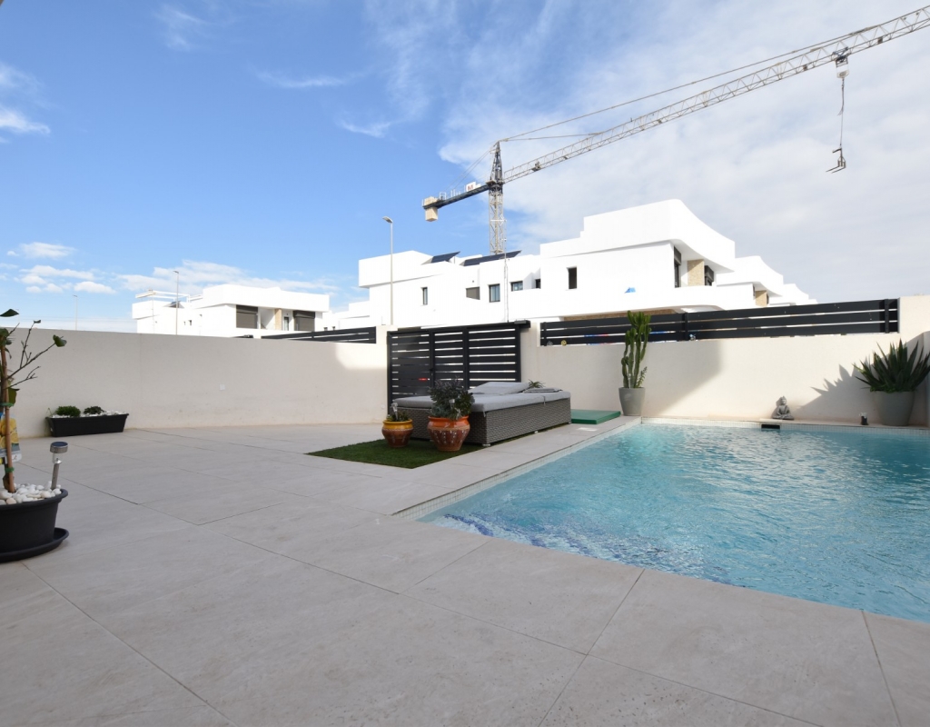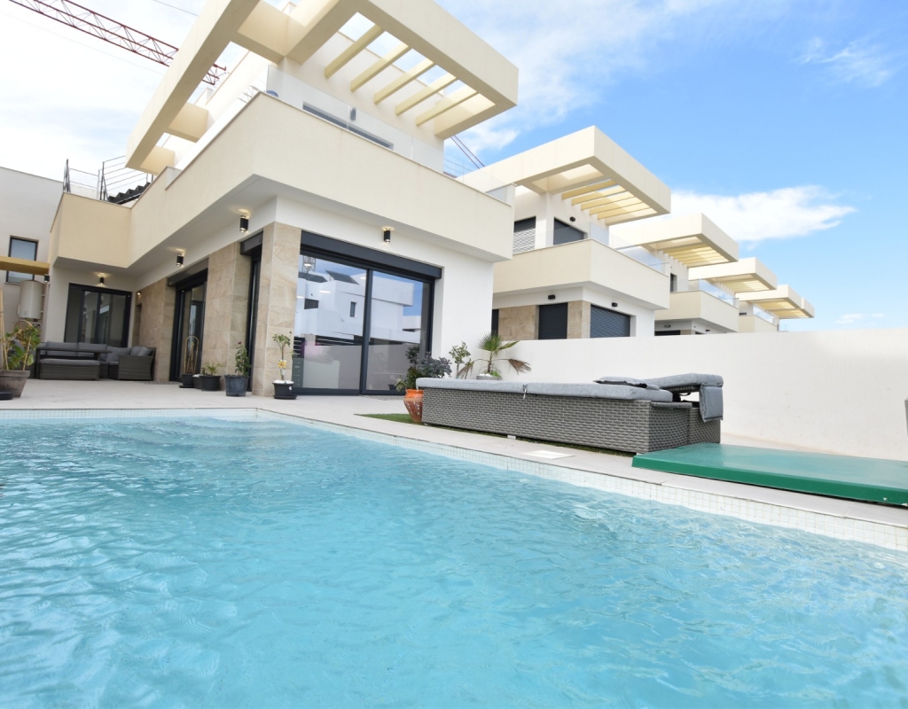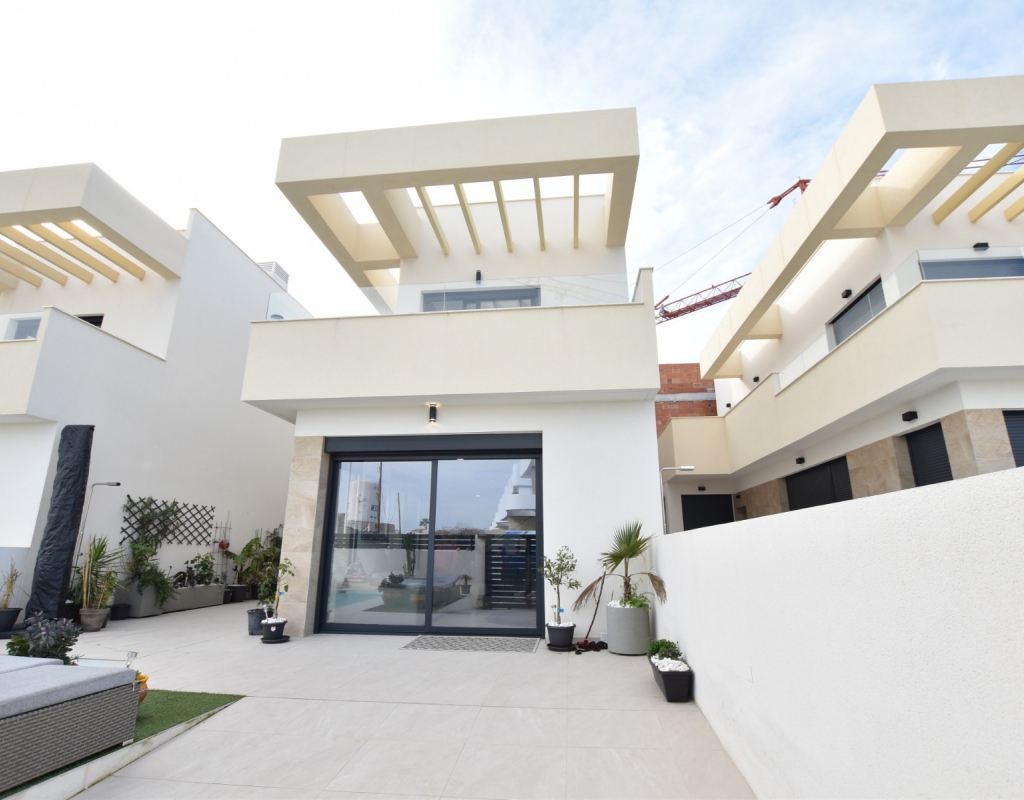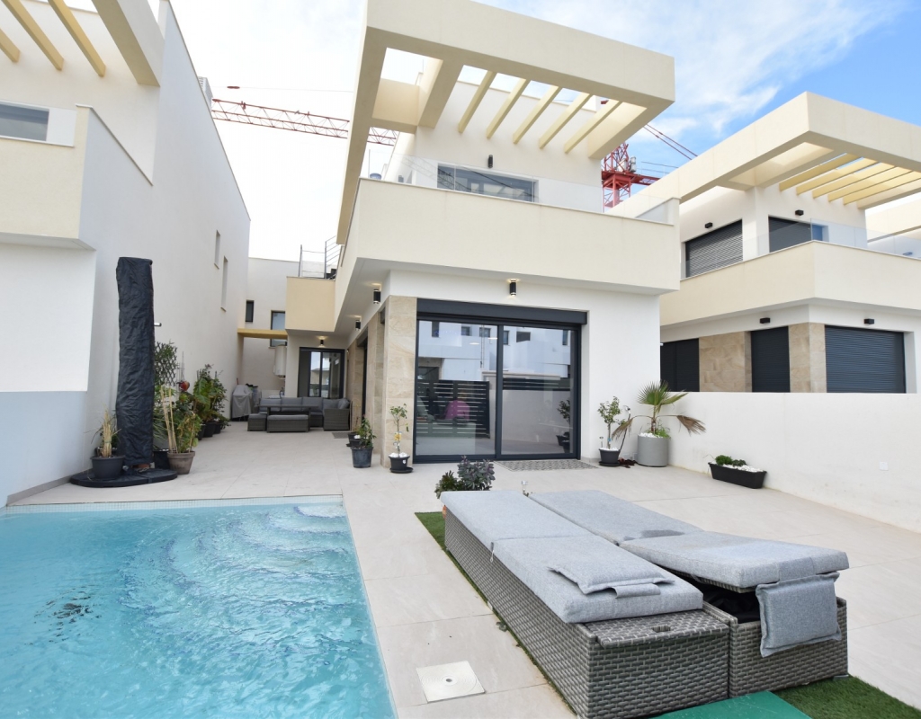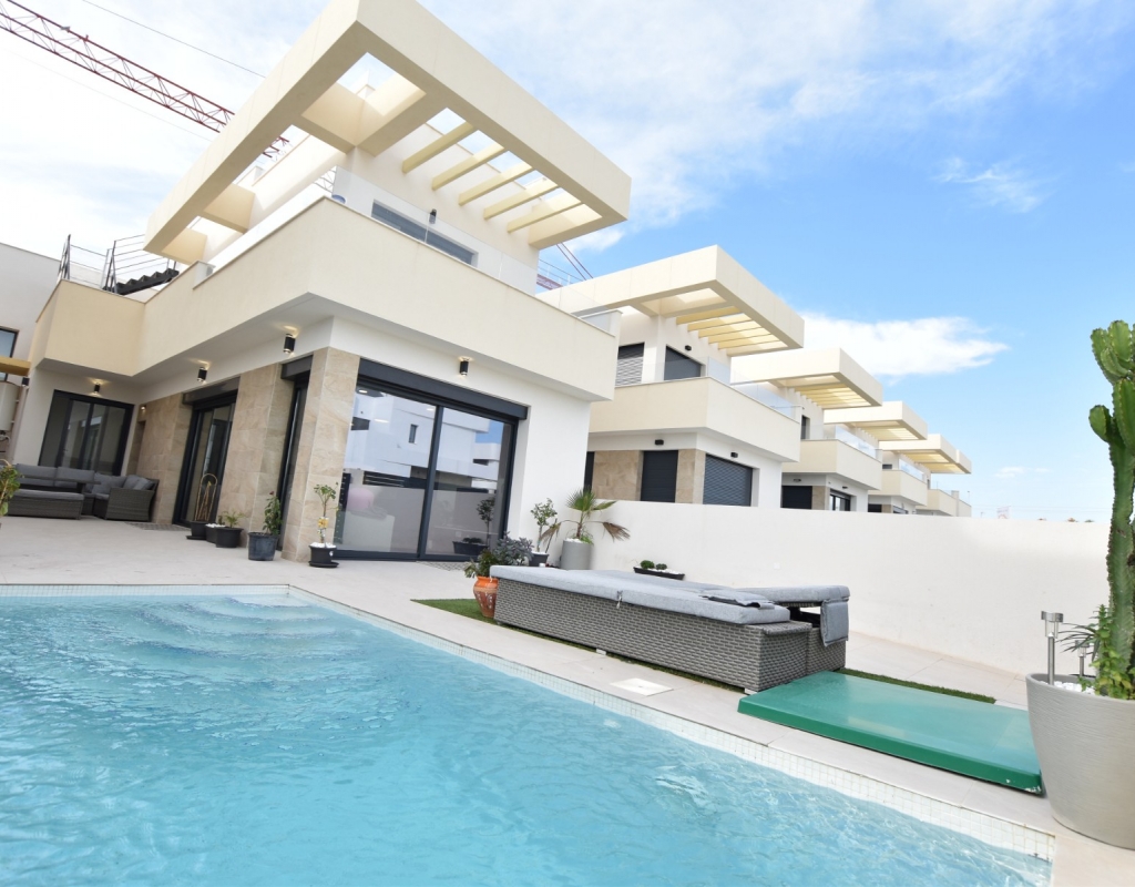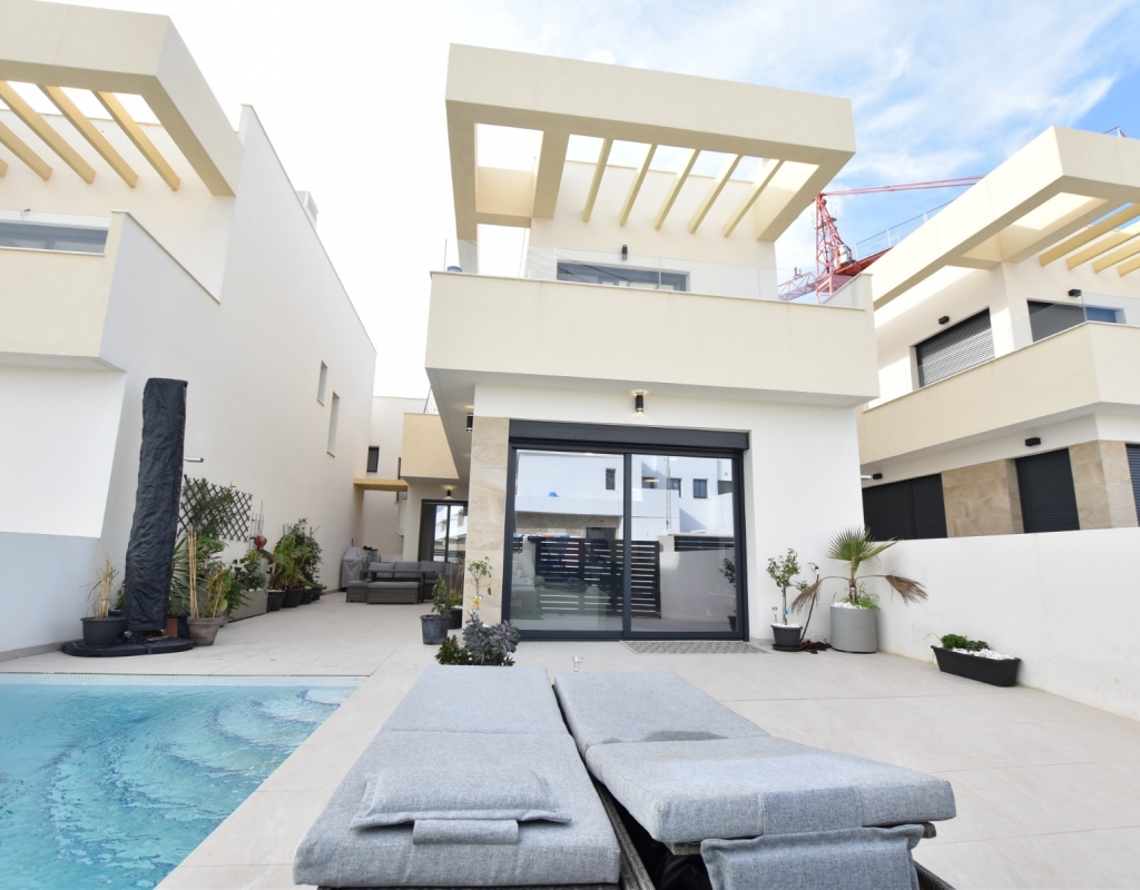 This modern detached villa, completed in 2025, is located in the well-established residential area of La Herrada, Los Montesinos. The property offers contemporary design, comfort, and a highly desirable location on the Costa Blanca. Upon arrival, the villa impresses with its clean architectural lines, private swimming pool, and off-road parking, providing both privacy and convenience. Inside, the home features a bright and spacious open-plan living area combining lounge, dining space, and kitchen, creating an inviting environment suitable for both everyday living and entertaining. A guest cloakroom is also located on this level. The master bedroom is situated on the ground floor and benefits from walk-through wardrobes and an en-suite shower room, making this layout ideal for those seeking main living accommodation on one level. Upstairs, there are two double bedrooms, both with built-in wardrobes and excellent natural light, along with a modern family bathroom. A generous terrace is accessible from this floor, offering additional outdoor space. From the terrace, external stairs lead up to the private rooftop solarium. This area provides open views across the surrounding countryside and both salt lakes, offering an ideal setting for sunbathing, relaxing, or outdoor dining. The villa is sold with most of the furniture included and is fully air conditioned throughout, allowing immediate enjoyment. The location is particularly convenient, with a local supermarket, bars, and restaurants within a five-minute walk. The beaches of Guardamar del Segura and Torrevieja are approximately fifteen minutes away by car, while Vistabella Golf is just a ten-minute drive.