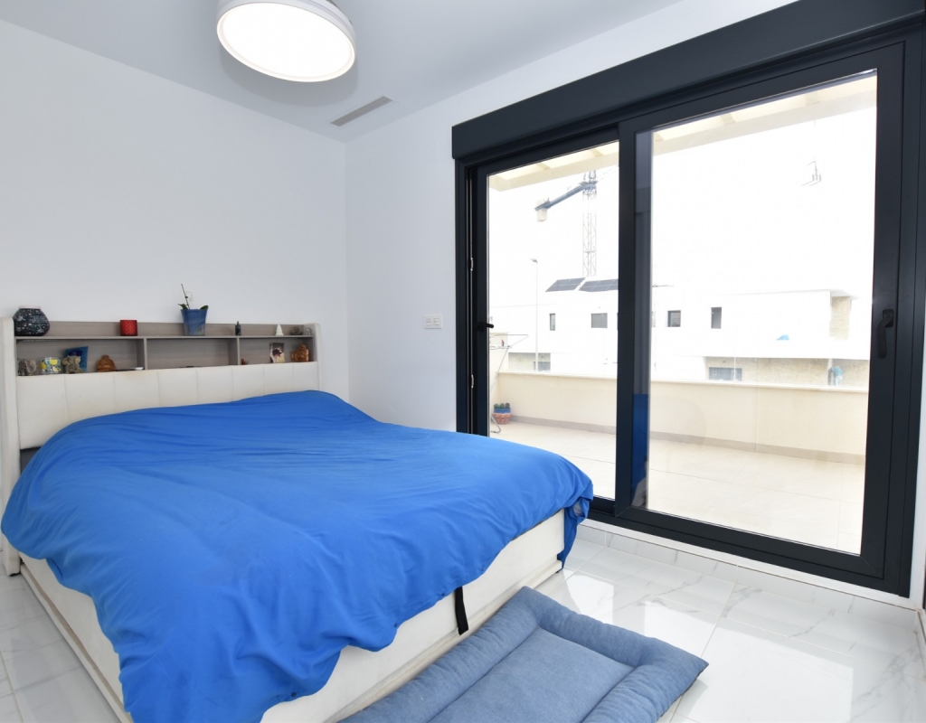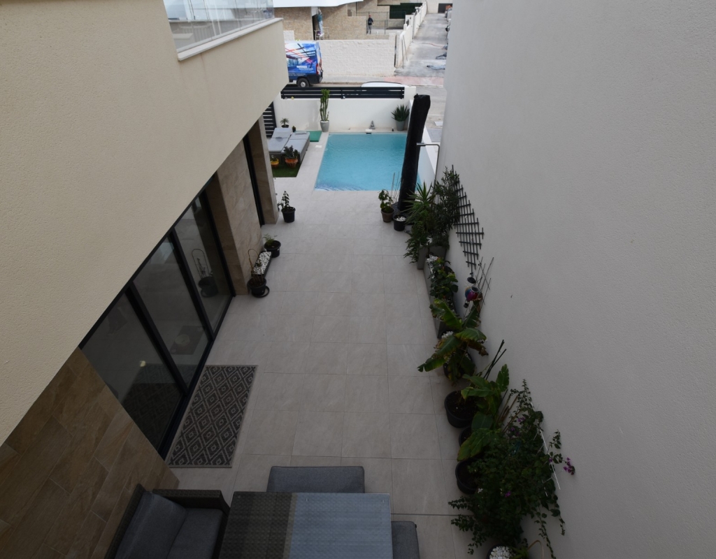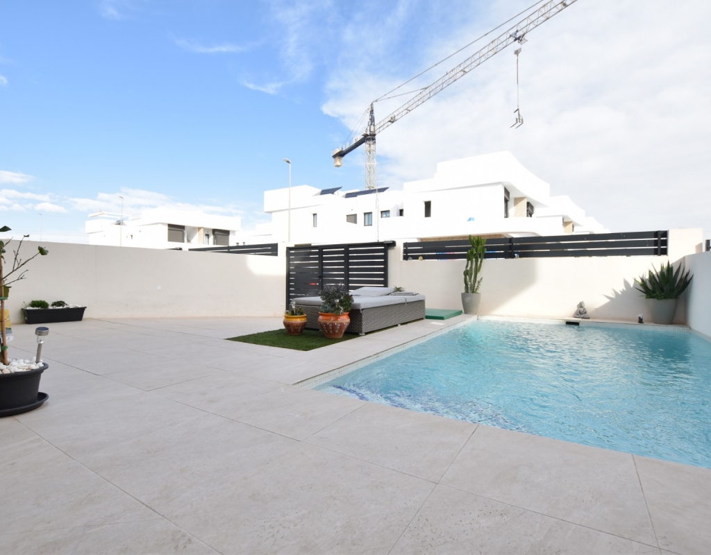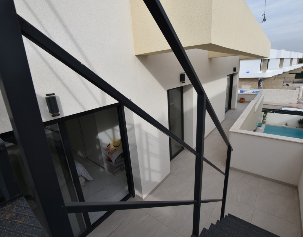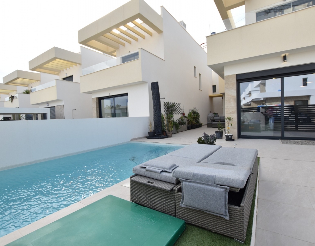 This modern detached villa, completed in 2025, is located in the well-established residential area of La Herrada, Los Montesinos. The property offers contemporary design, comfort, and a highly desirable location on the Costa Blanca. Upon arrival, the villa impresses with its clean architectural lines, private swimming pool, and off-road parking, providing both privacy and convenience. Inside, the home features a bright and spacious open-plan living area combining lounge, dining space, and kitchen, creating an inviting environment suitable for both everyday living and entertaining. A guest cloakroom is also located on this level. The master bedroom is situated on the ground floor and benefits from walk-through wardrobes and an en-suite shower room, making this layout ideal for those seeking main living accommodation on one level. Upstairs, there are two double bedrooms, both with built-in wardrobes and excellent natural light, along with a modern family bathroom. A generous terrace is accessible from this floor, offering additional outdoor space. From the terrace, external stairs lead up to the private rooftop solarium. This area provides open views across the surrounding countryside and both salt lakes, offering an ideal setting for sunbathing, relaxing, or outdoor dining. The villa is sold with most of the furniture included and is fully air conditioned throughout, allowing immediate enjoyment. The location is particularly convenient, with a local supermarket, bars, and restaurants within a five-minute walk. The beaches of Guardamar del Segura and Torrevieja are approximately fifteen minutes away by car, while Vistabella Golf is just a ten-minute drive.
