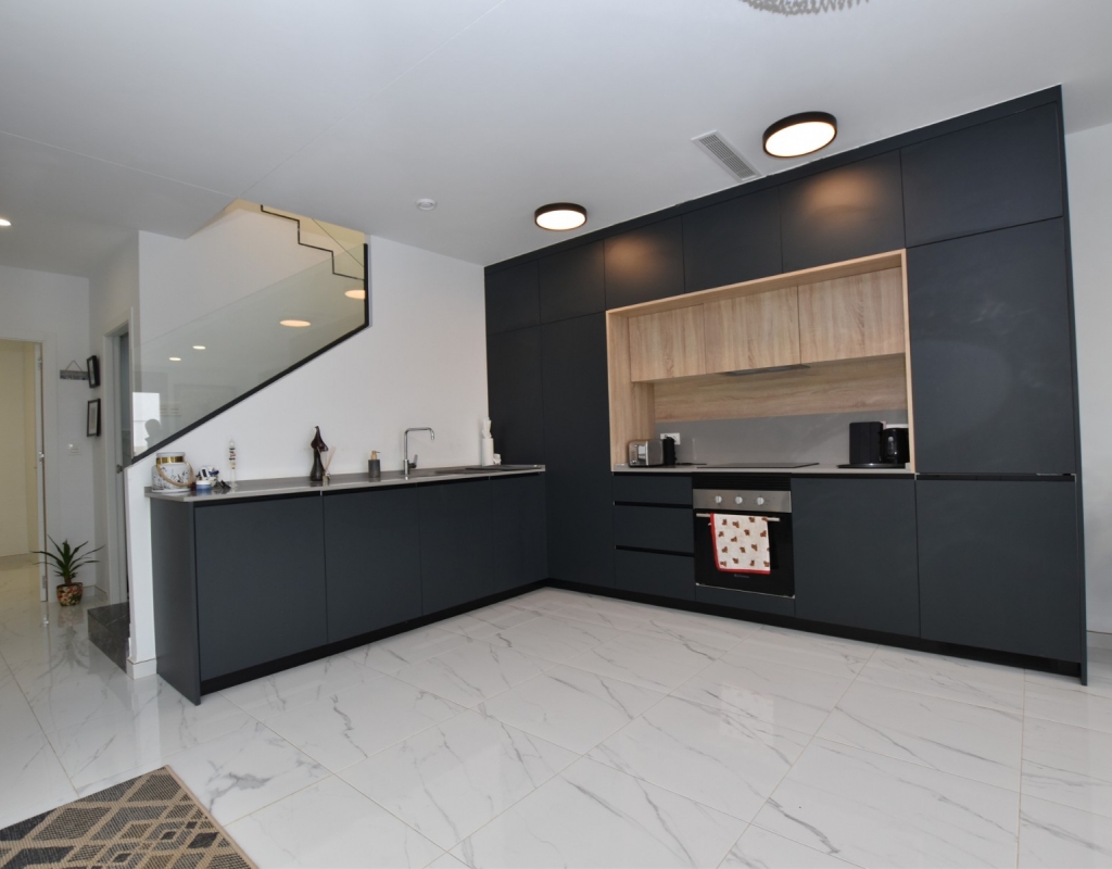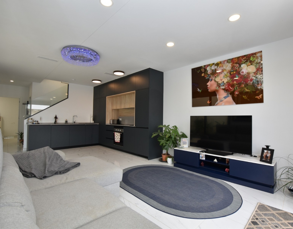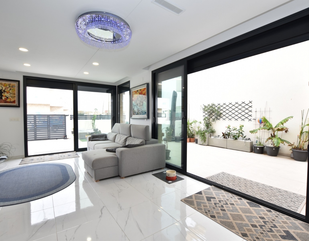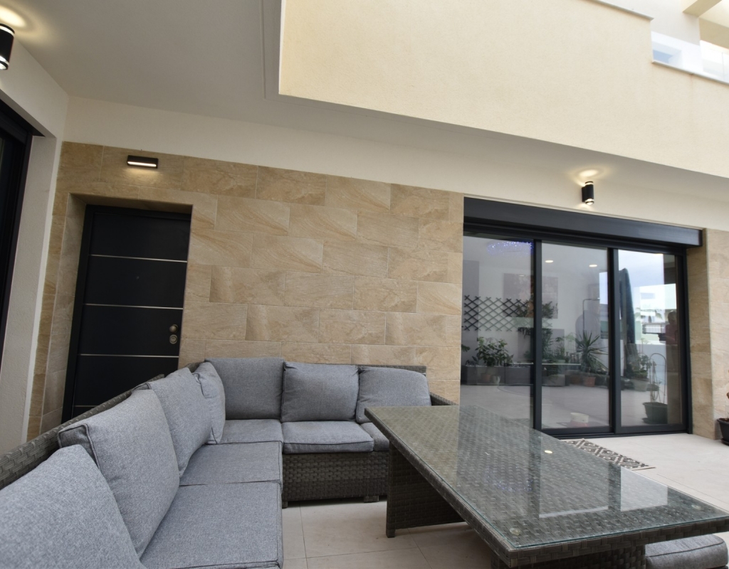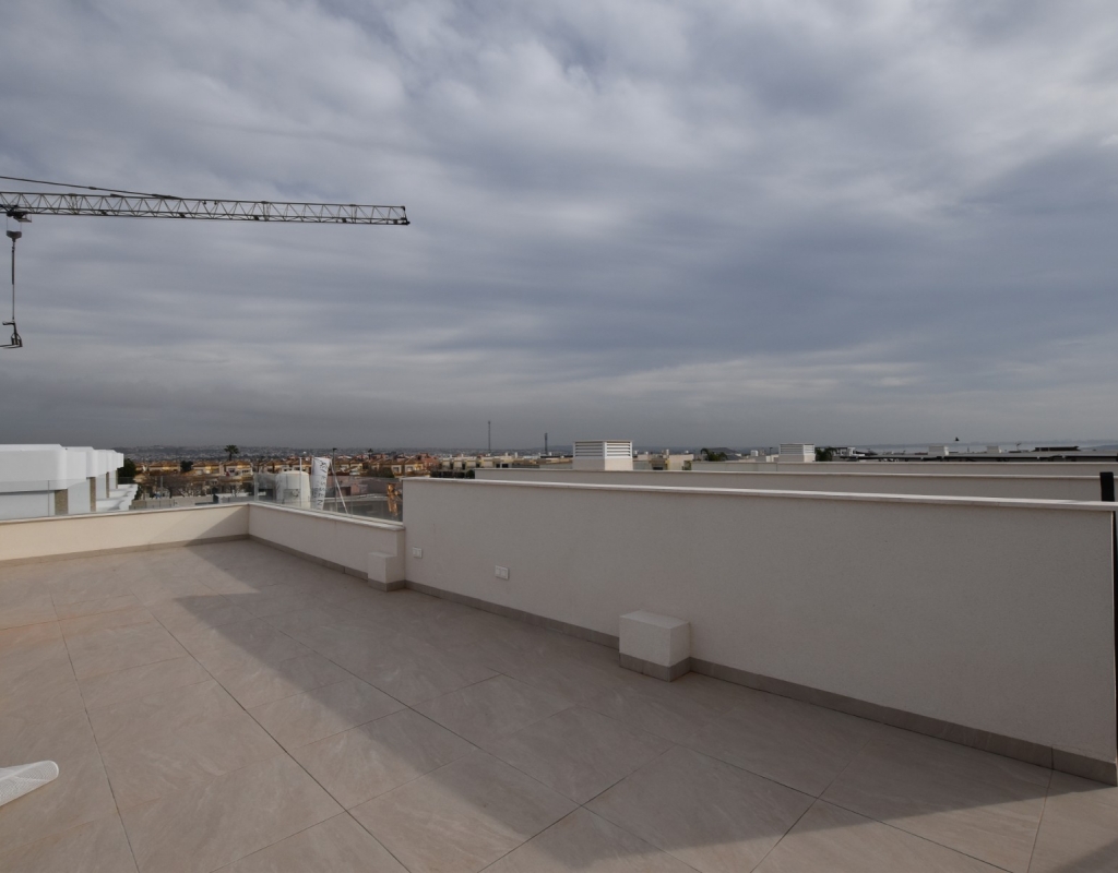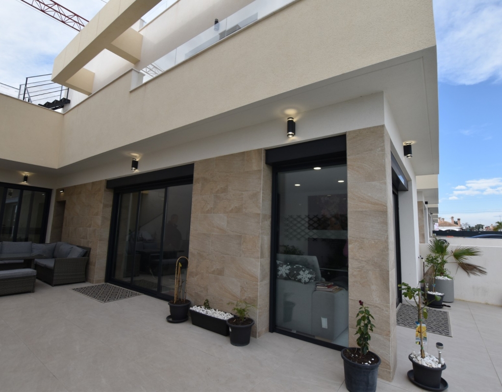 This modern detached villa, completed in 2025, is located in the well-established residential area of La Herrada, Los Montesinos. The property offers contemporary design, comfort, and a highly desirable location on the Costa Blanca. Upon arrival, the villa impresses with its clean architectural lines, private swimming pool, and off-road parking, providing both privacy and convenience. Inside, the home features a bright and spacious open-plan living area combining lounge, dining space, and kitchen, creating an inviting environment suitable for both everyday living and entertaining. A guest cloakroom is also located on this level. The master bedroom is situated on the ground floor and benefits from walk-through wardrobes and an en-suite shower room, making this layout ideal for those seeking main living accommodation on one level. Upstairs, there are two double bedrooms, both with built-in wardrobes and excellent natural light, along with a modern family bathroom. A generous terrace is accessible from this floor, offering additional outdoor space. From the terrace, external stairs lead up to the private rooftop solarium. This area provides open views across the surrounding countryside and both salt lakes, offering an ideal setting for sunbathing, relaxing, or outdoor dining. The villa is sold with most of the furniture included and is fully air conditioned throughout, allowing immediate enjoyment. The location is particularly convenient, with a local supermarket, bars, and restaurants within a five-minute walk. The beaches of Guardamar del Segura and Torrevieja are approximately fifteen minutes away by car, while Vistabella Golf is just a ten-minute drive.