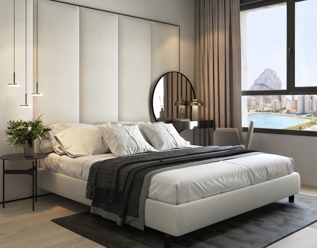 The interior design of the apartments in Calpe is crafted to offer a welcoming and modern space. With three bedrooms and two bathrooms, each unit is equipped to meet the needs of comfort and functionality. The apartments feature air conditioning and electric blinds, ensuring a cool and comfortable environment year-round. Included appliances make daily life easier, while built-in wardrobes provide efficient and organized storage. The pre-installation of air conditioning is a detail that adds value and comfort, allowing customization according to residents' preferences. The ceramic flooring not only adds a modern touch but is also practical and easy to maintain, ideal for a home by the sea.
