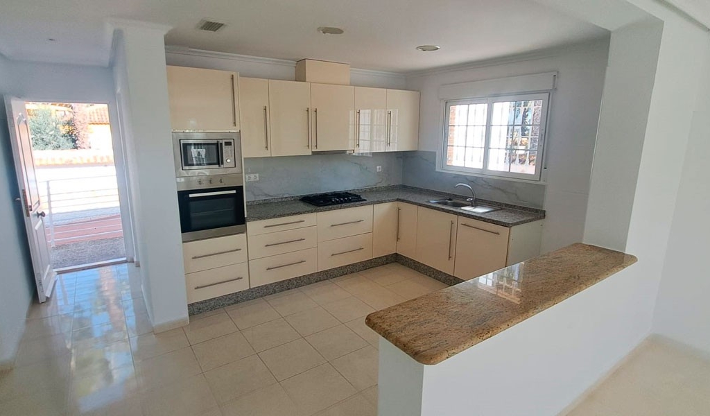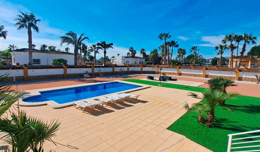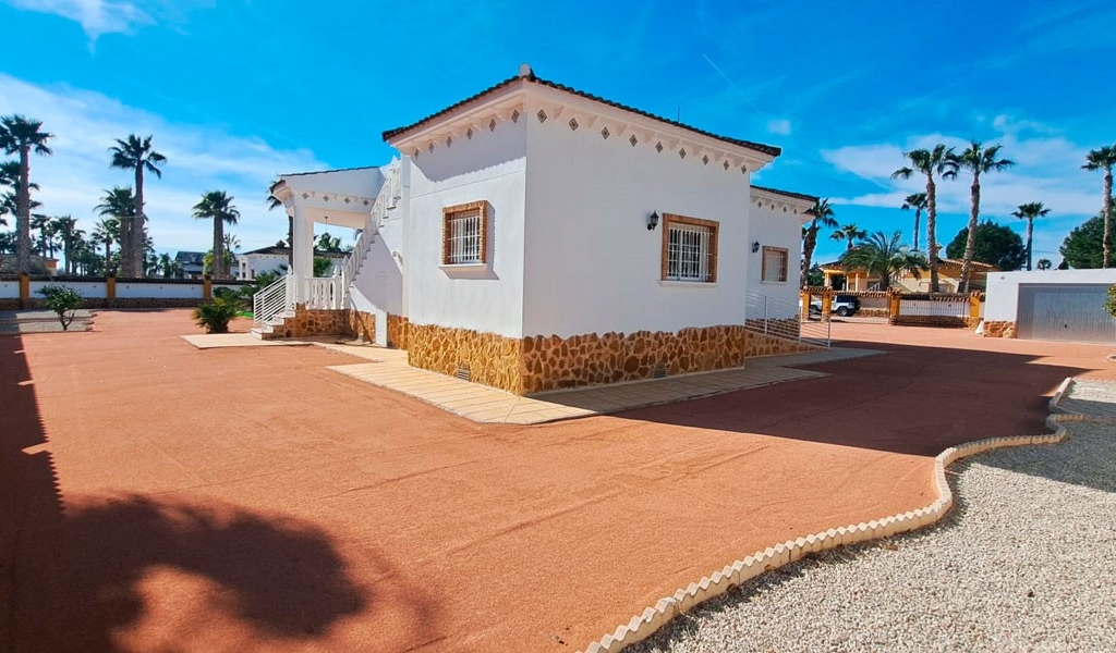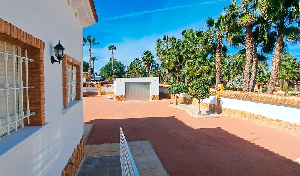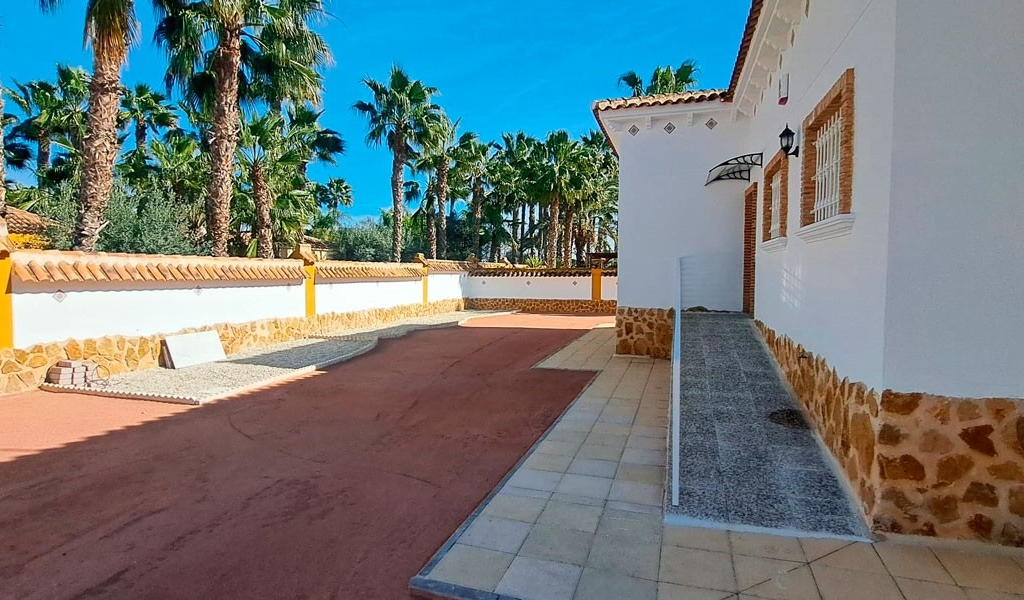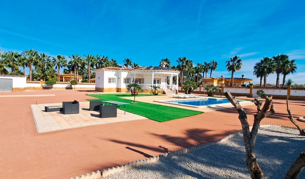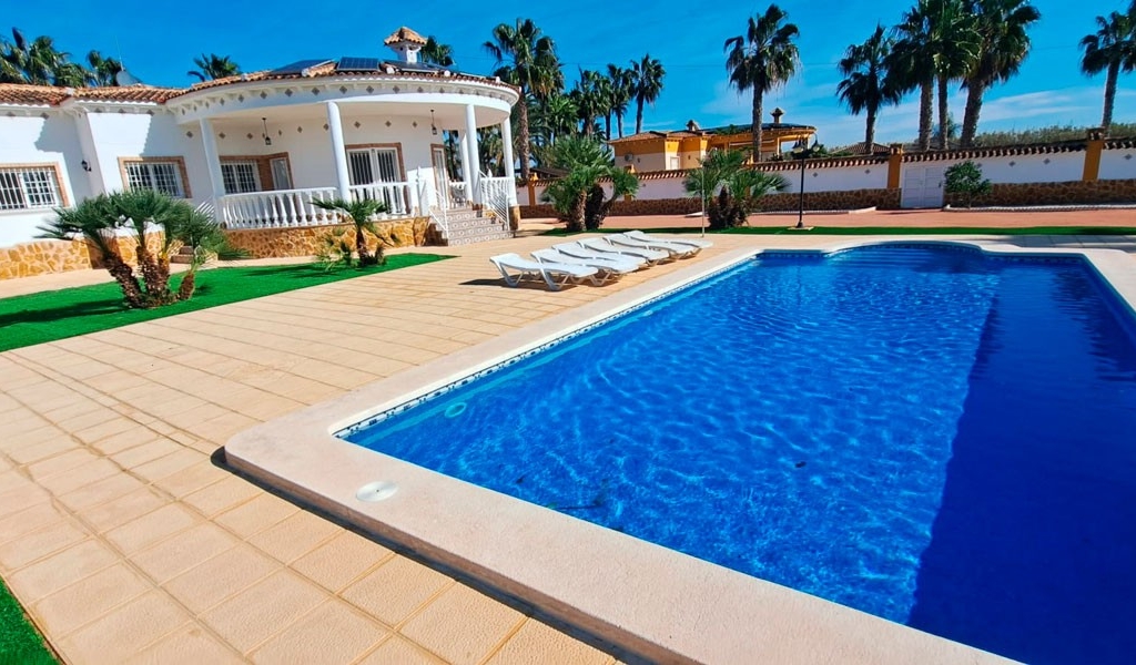This Fantastic, Three Bedroom, Detached Country Villa in Catral is located amidst beautiful open countryside, offering peace, privacy, and stunning surroundings, yet just a 5 minute drive to the town for all amenities. The property benefits from an excellent road network along the coast, with the beaches and La Finca golf course both reachable within approximately 20 minutes, making this an ideal Costa Blanca South location. This impressive 163m² villa is all on one level and set within a beautifully landscaped and fully walled 2,329m² plot. The interior features a unique curved lounge area with air conditioning and a feature fireplace, along with two sets of opening glazed doors leading out to a covered terrace—perfect for indoor-outdoor living. The open plan fitted kitchen includes a breakfast bar and a door leading outside, while a wide archway leads into a versatile area that can be used as a dining or additional sitting space. There are three double bedrooms, all with built-in wardrobes, along with a family bathroom and two shower rooms, one of which is en suite. Externally, the property offers access to a private solarium where you can enjoy panoramic countryside views, along with the benefit of solar panels. The expansive plot is designed for easy maintenance, featuring paved areas, sections of artificial grass, and mature palm trees. A large 10 x 5 private swimming pool provides the perfect space to relax and entertain, while there is ample off-road parking and a garage for two cars with additional storage. The villa benefits from mains water and electricity, a water reserve system, and four solar panels, enhancing efficiency and sustainability. This exceptional country property combines space, comfort, and tranquillity, making it a perfect permanent residence or luxurious retreat in the heart of the Costa Blanca South.