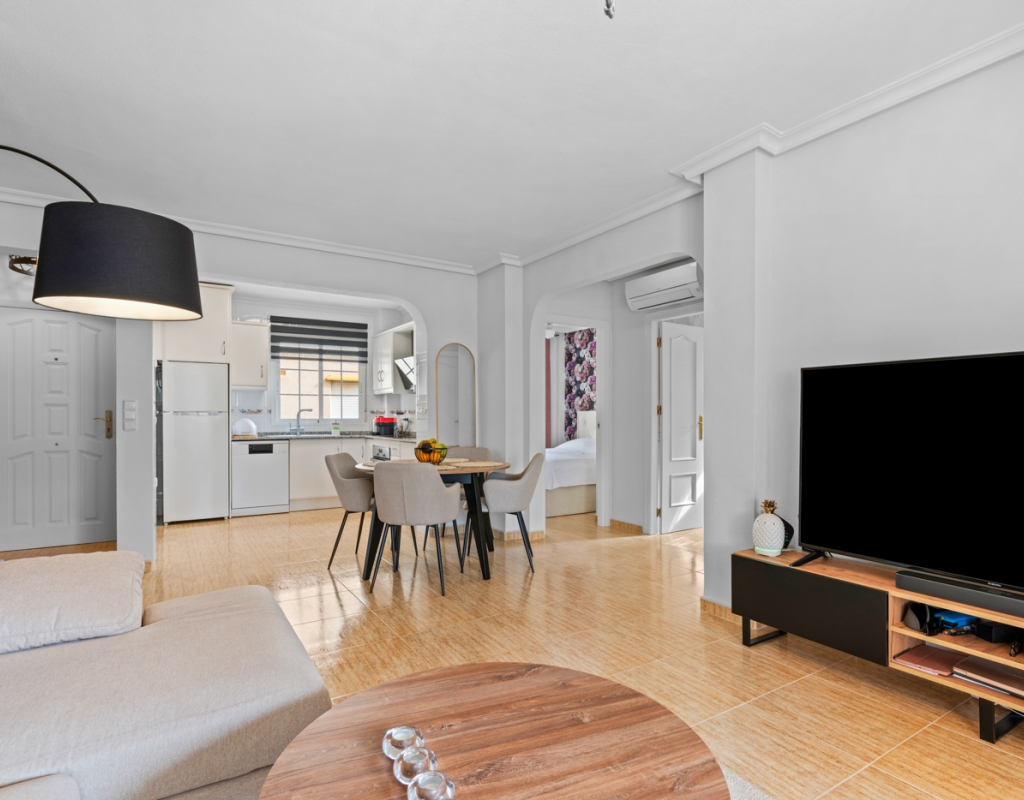 2 bedroom and 1 bathroom apartment in Residential Zodiaco Beach III, just 2,5 kilometers away from the beach. The property has an open plan solution, with a fully equipped kitchen is and a living room that opens to a 12m2 balcony with plenty of seating space and awnings. The apartment features 1 bathroom and 2 carefully decorated exterior bedrooms with built-in-wardrobes and ceiling fans.