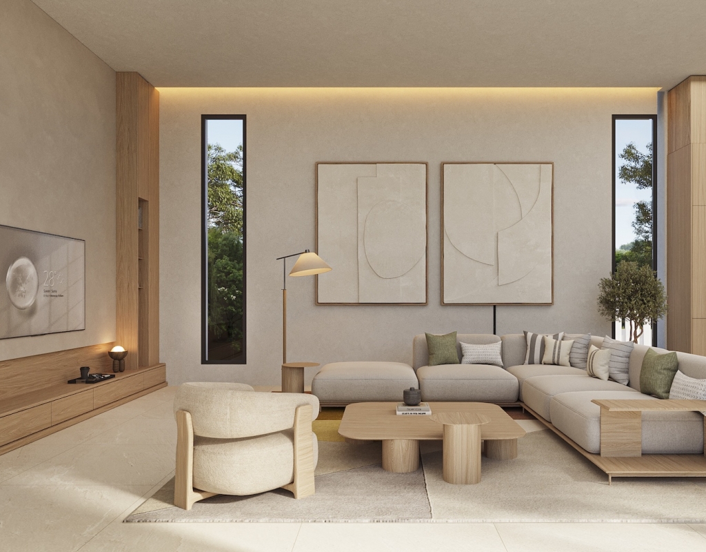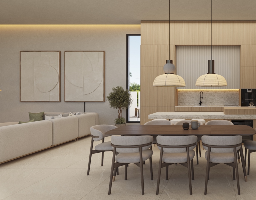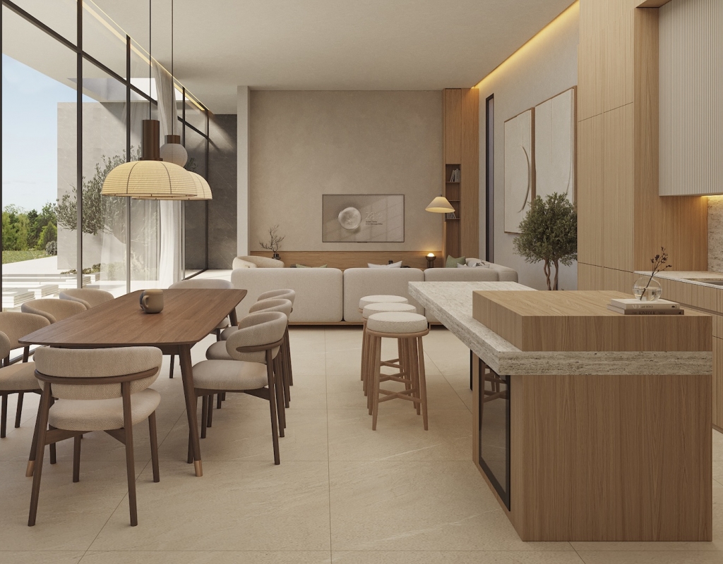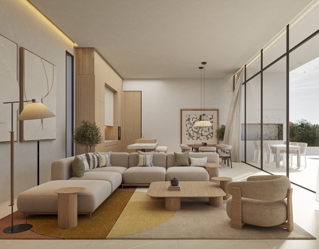 The villa is designed with high-quality finishes, including porcelain stoneware flooring that adds a touch of elegance to every room. It comes fully furnished, ensuring a seamless transition into your new home. The kitchen is equipped with built-in wardrobes, offering plenty of storage space for all your needs.