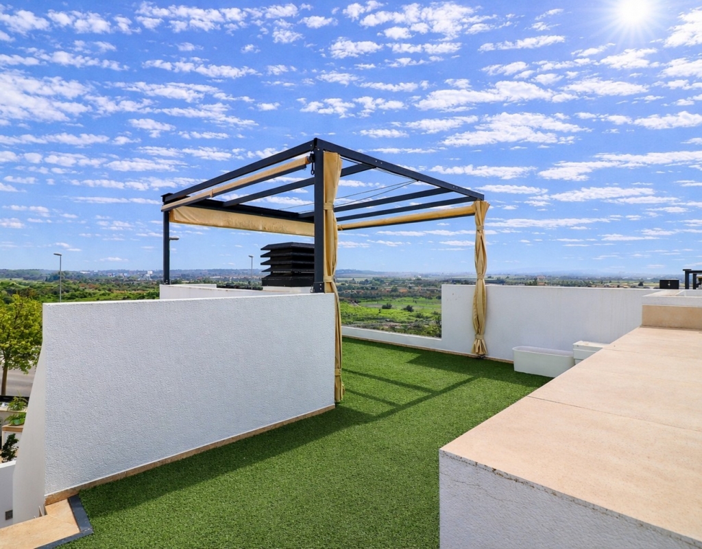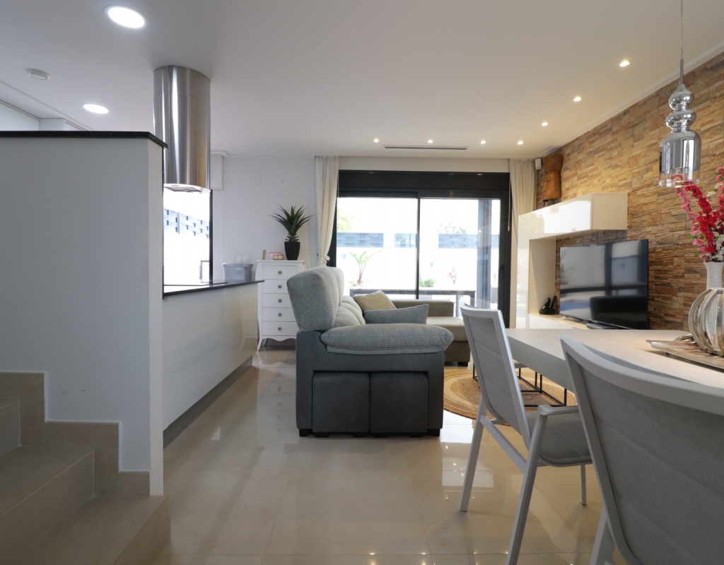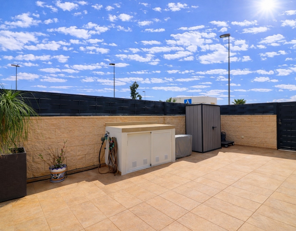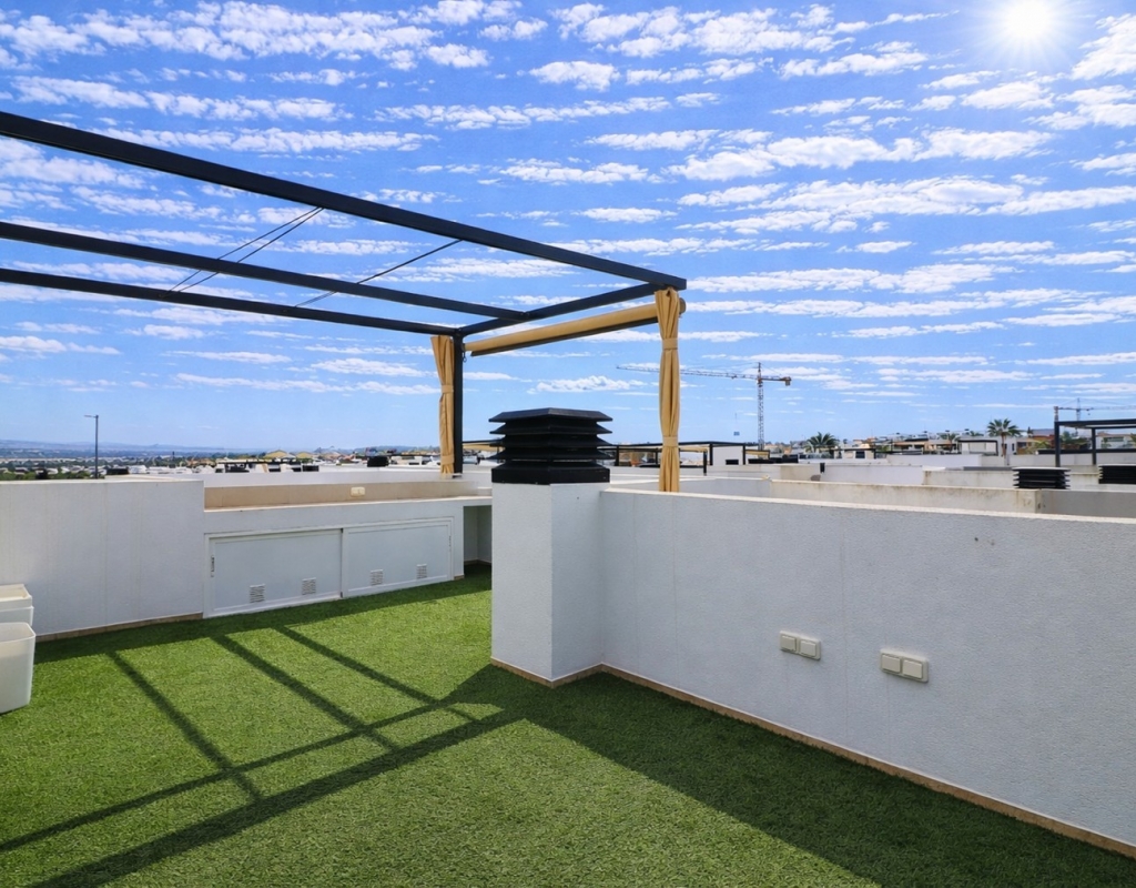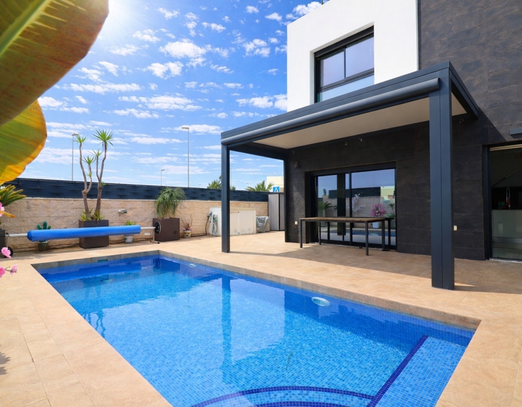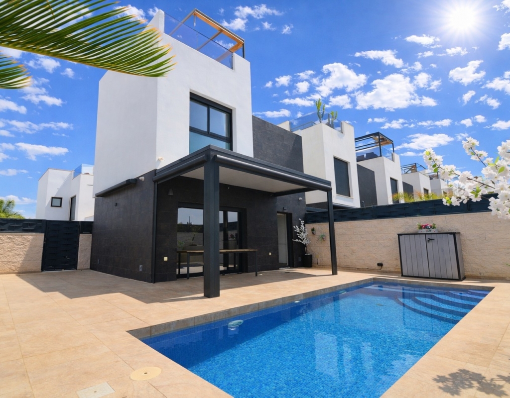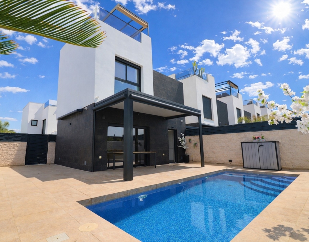 This Spectacular, Three Bedroom, Detached Villa in Benijofar, is located on the borders of this popular town, offering easy access to a wide range of amenities including restaurants, school, municipal sports ground, pharmacy, vets, medical centre, bank and more. A selection of quality restaurants, café bars and a small supermarket are within a 10 minute walk, whilst a couple of main chain supermarkets are just 5 minutes by car, including the neighbouring towns of Quesada and Rojales. La Marquesa Golf Course is just a 10 minute drive away, and a choice of beautiful beaches, including Guardamar, can be reached in approximately 15 minutes. Beautifully presented and set over two floors, the villa offers a 103m² build. The ground floor features a bright living area with stairs leading to the first floor and large double sliding glazed doors opening out to the tiled garden and private pool area. There is an extensive open plan modern white fitted kitchen with a door leading outside, a utility area, a double bedroom with access to a patio area and en suite shower room, plus a convenient cloakroom. The first floor comprises two further double bedrooms and a family shower room. External steps lead up to the impressive 45m² private solarium, where you can enjoy incredible open countryside and mountain views. Part of the solarium is laid with artificial grass and includes a metal framework with retractable sun blinds, creating a covered entertainment and dining area, along with a practical work space with electricity and storage. The garden is private and fully walled, featuring an easy maintenance tiled finish, off road parking, and a pergola with an insulated roof. The villa also boasts a private heated swimming pool, built-in wardrobes, ducted air conditioning, and solar panels serving the hot water system. A stunning modern home in a highly desirable area of the Costa Blanca South.