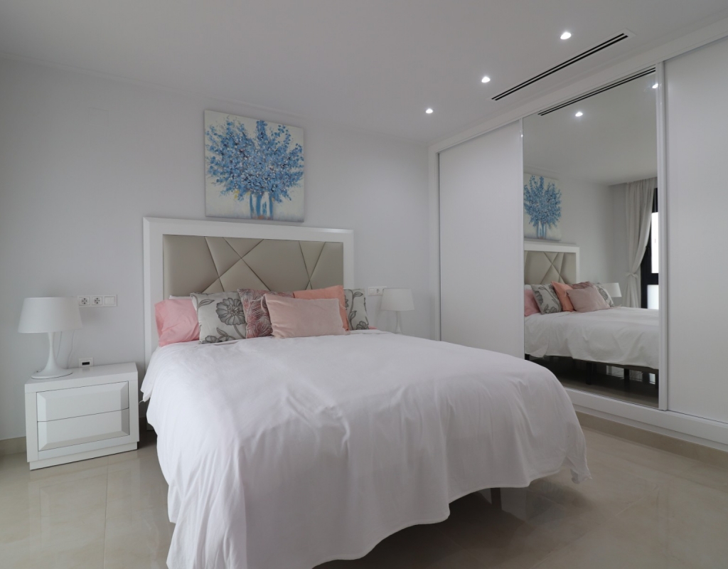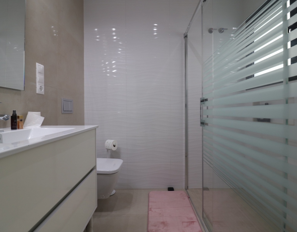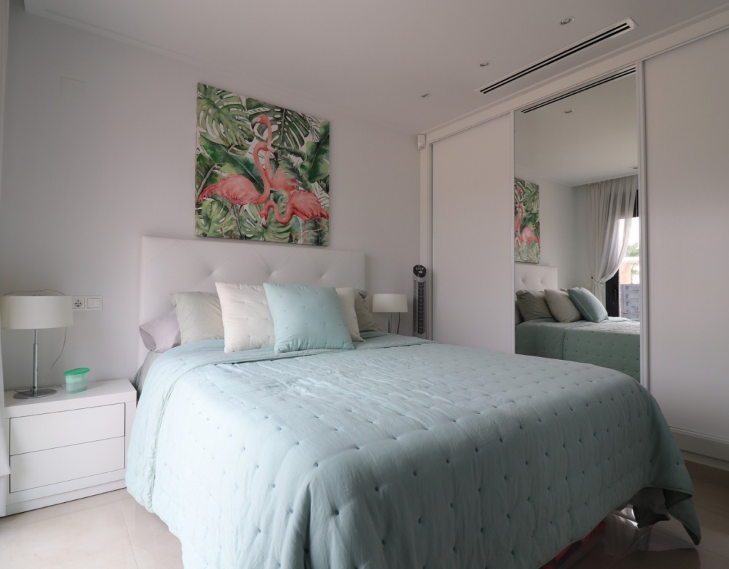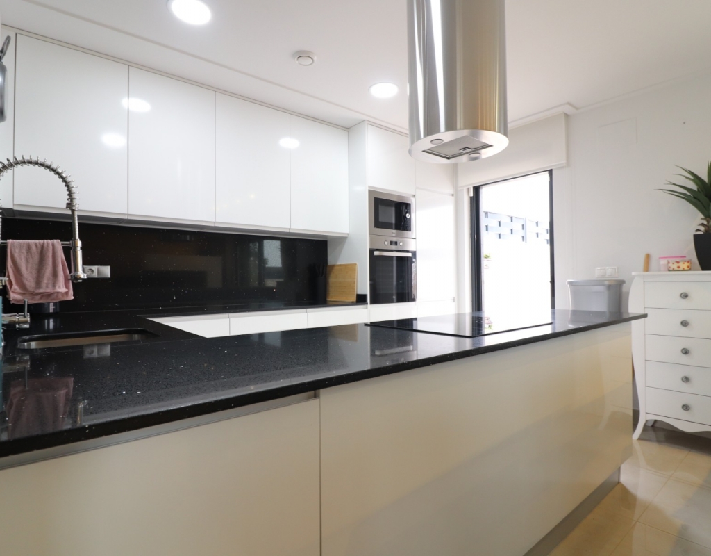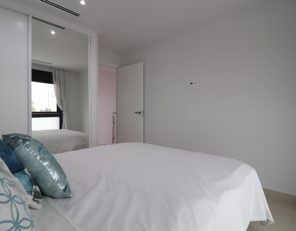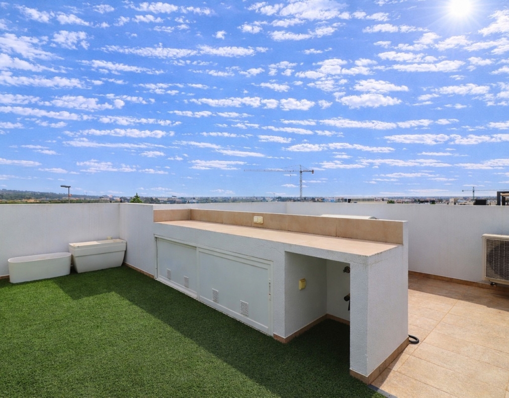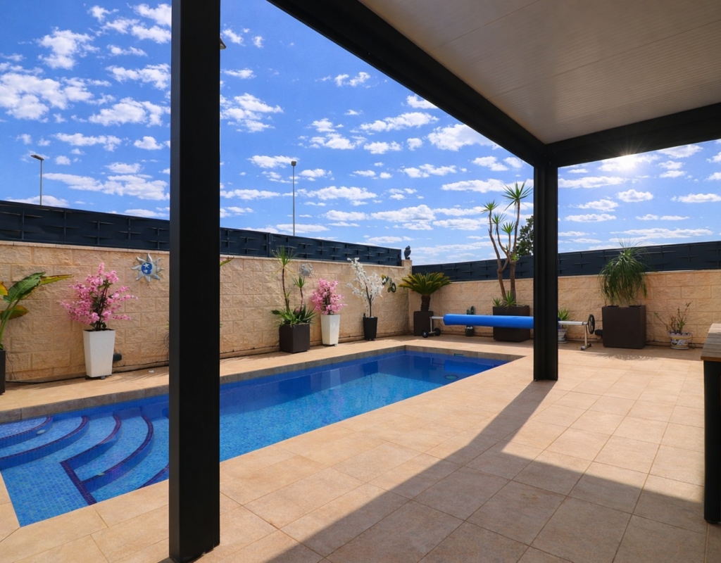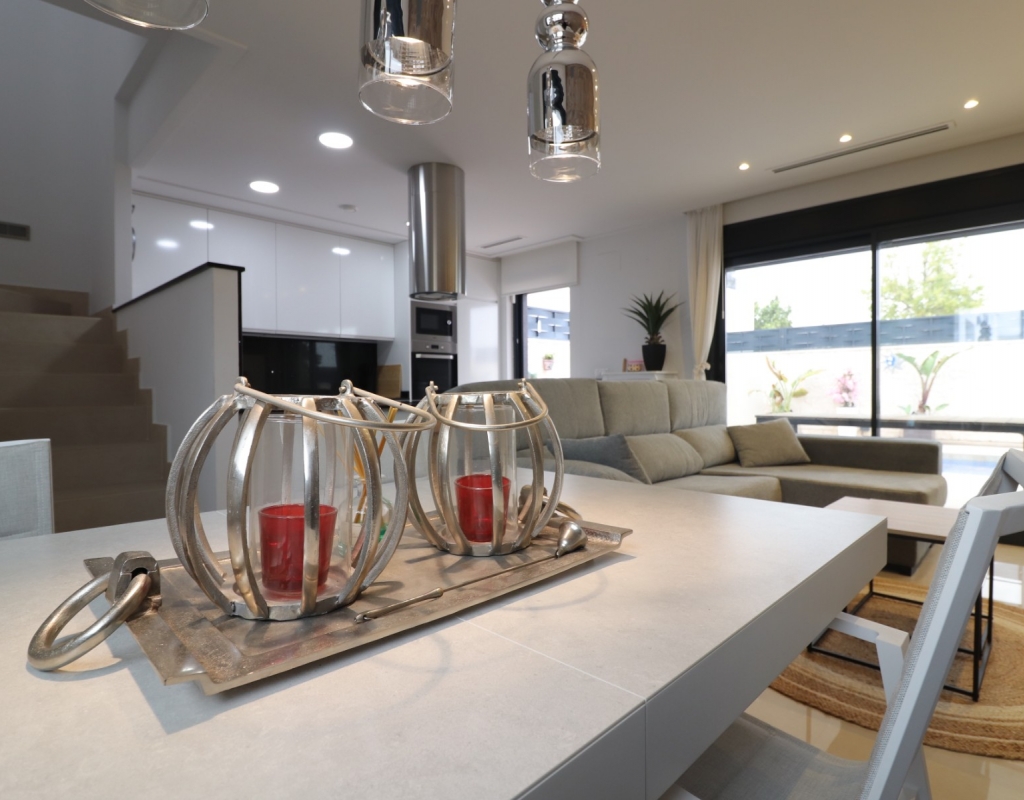 This Spectacular, Three Bedroom, Detached Villa in Benijofar, is located on the borders of this popular town, offering easy access to a wide range of amenities including restaurants, school, municipal sports ground, pharmacy, vets, medical centre, bank and more. A selection of quality restaurants, café bars and a small supermarket are within a 10 minute walk, whilst a couple of main chain supermarkets are just 5 minutes by car, including the neighbouring towns of Quesada and Rojales. La Marquesa Golf Course is just a 10 minute drive away, and a choice of beautiful beaches, including Guardamar, can be reached in approximately 15 minutes. Beautifully presented and set over two floors, the villa offers a 103m² build. The ground floor features a bright living area with stairs leading to the first floor and large double sliding glazed doors opening out to the tiled garden and private pool area. There is an extensive open plan modern white fitted kitchen with a door leading outside, a utility area, a double bedroom with access to a patio area and en suite shower room, plus a convenient cloakroom. The first floor comprises two further double bedrooms and a family shower room. External steps lead up to the impressive 45m² private solarium, where you can enjoy incredible open countryside and mountain views. Part of the solarium is laid with artificial grass and includes a metal framework with retractable sun blinds, creating a covered entertainment and dining area, along with a practical work space with electricity and storage. The garden is private and fully walled, featuring an easy maintenance tiled finish, off road parking, and a pergola with an insulated roof. The villa also boasts a private heated swimming pool, built-in wardrobes, ducted air conditioning, and solar panels serving the hot water system. A stunning modern home in a highly desirable area of the Costa Blanca South.