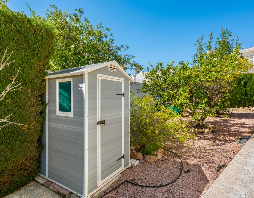 Outdoor areaThe villa is set on a south facing corner plot of 504 m2. In the garden you can find a swimming pool, outdoor shower, a shed and a lot of space for outdoor seating areas. There is a small roof terrace above the garage.