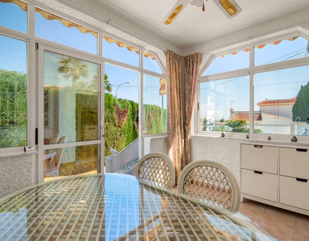 The villa is set over one level and has a living area of 100 m2. It consists of two double bedrooms with fitted wardrobe, a bathroom with bathtub, an open plan kitchen and living room, and a glazed terrace that works as a dining room.