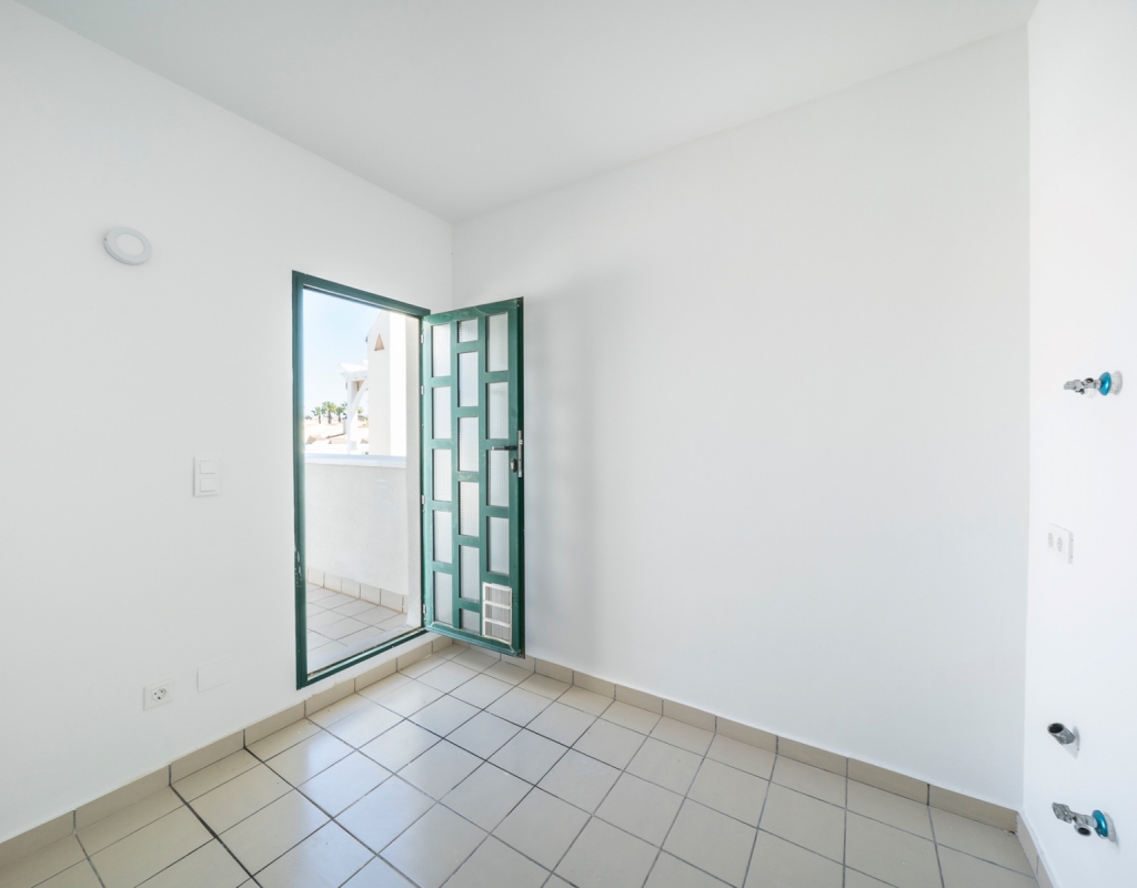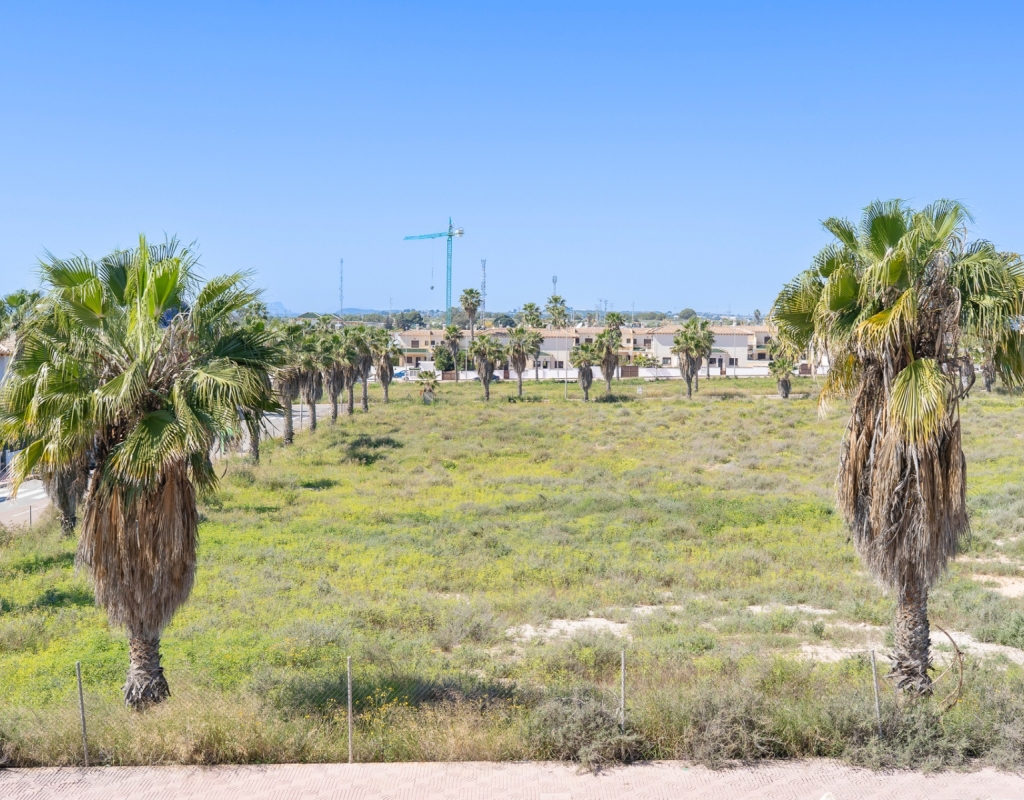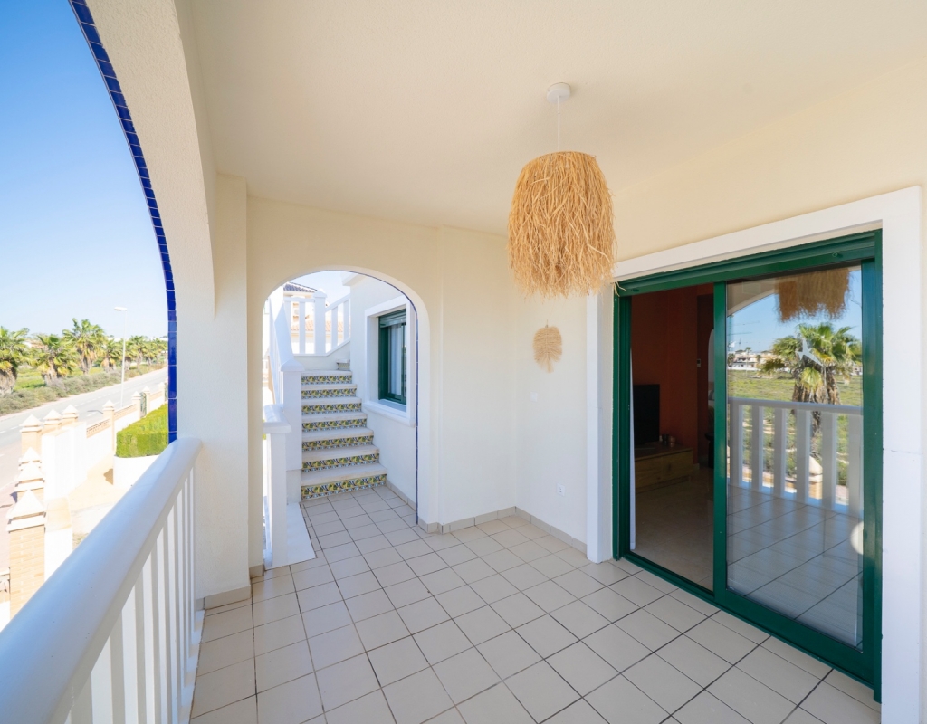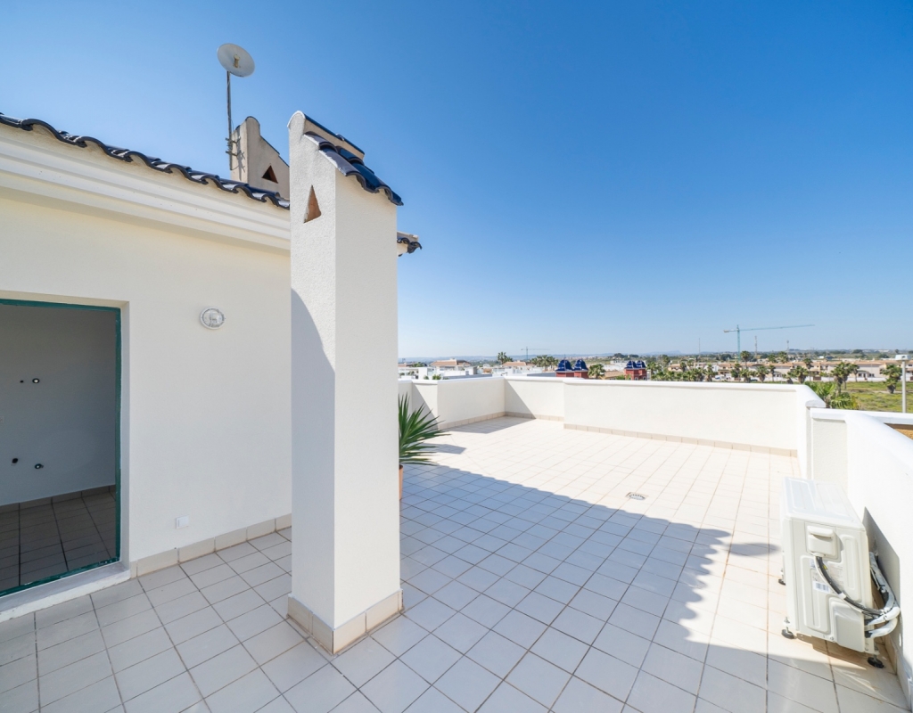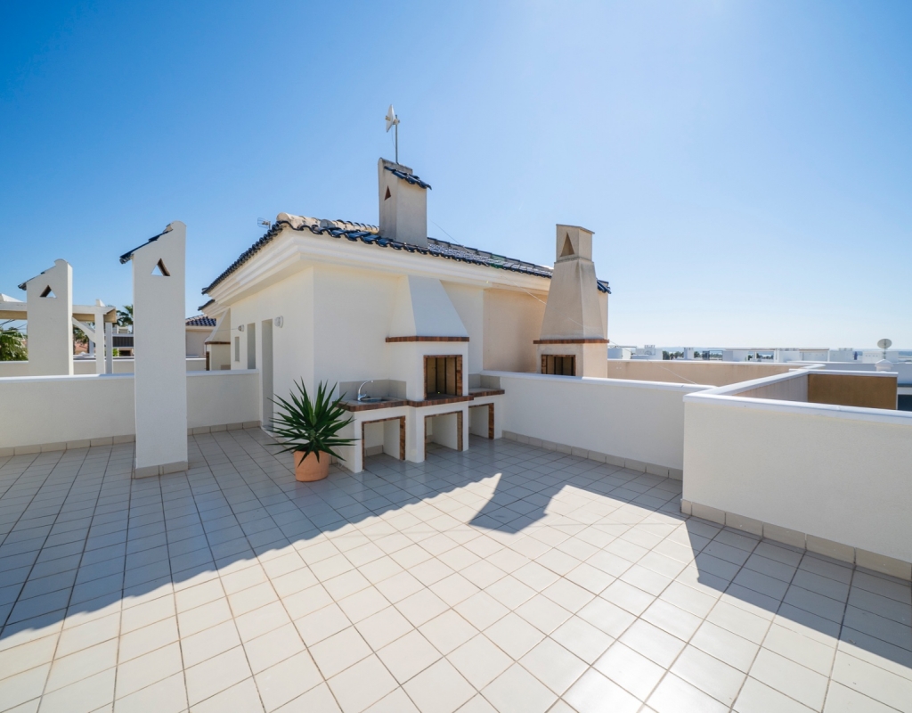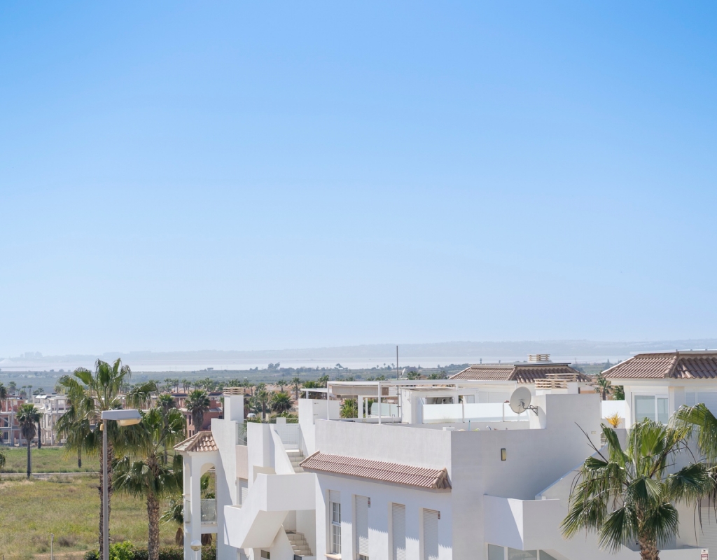 From the balcony, an external staircase leads to a large private roof terrace with a storage room and built-in BBQ, offering views of the salt lakes of Torrevieja and La Mata.
