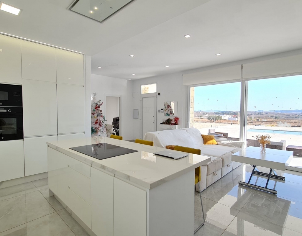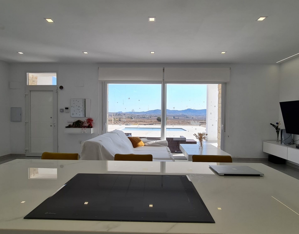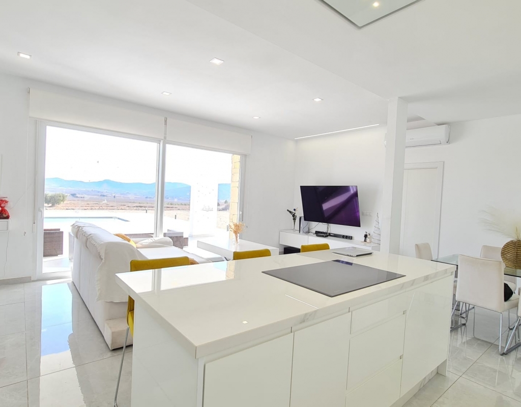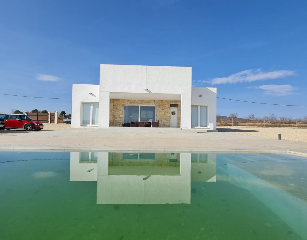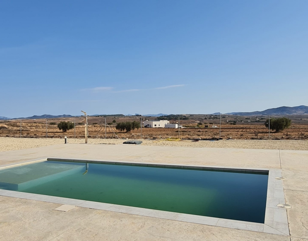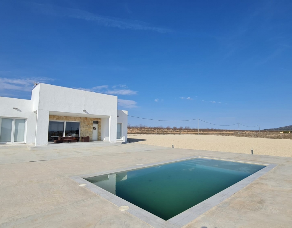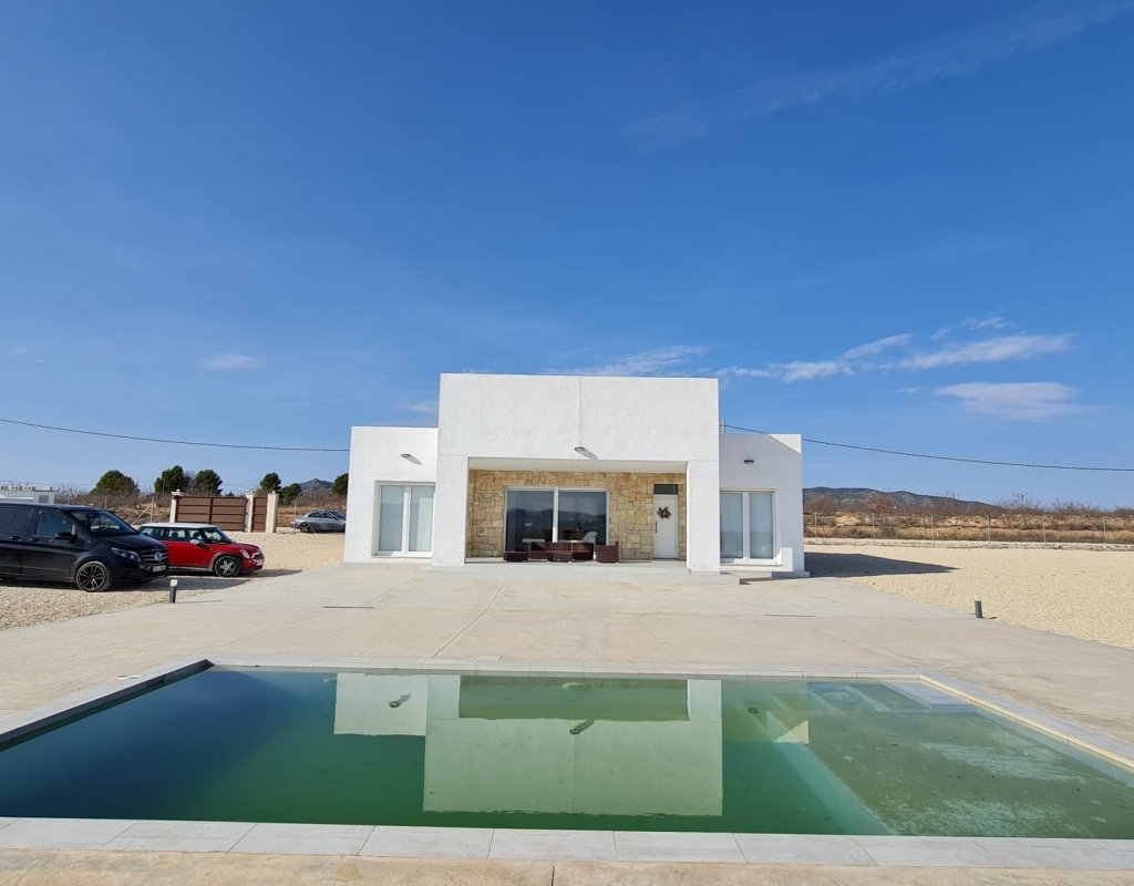 This beautifully designed home offers a perfect blend of modern style and practical living. Located in a peaceful area just 4 minutes to the vibrant town of Pinoso, it provides easy access to all local amenities while enjoying stunning views of surrounding vineyards and orchards.With an open and bright structure, the home features a spacious open-plan living room and kitchen, ideal for sharing special moments. The kitchen, equipped with a modern breakfast bar, seamlessly integrates with the living room, creating a fluid and welcoming atmosphere. Large windows allow natural light to flood every corner of the house, providing a sense of spaciousness and well-being.The property offers three comfortable bedrooms with fitted wardrobes, one of them with an open dressing room integrated into the bedroom and two modern bathrooms (one is ensuite), perfect for the whole family or to host friends and loved ones. Outdoor living is just as impressive, with a large covered porch and a spacious patio surrounding a private swimming pool inviting you to relax and enjoy the weather. The fully fenced property, equipped with electric gates, ensures security and privacy while still being part of a friendly neighborhood.If you're looking for a retreat from the hustle and bustle without being too far from the town's amenities, this is the perfect house. A unique gem that could be yours!Contact us today to learn more or schedule a viewing! The property is vacant and offers immediate access. The seller is in the process of registering the property and swimming pool in the Land Registry, and the latest update is that this should be done by the end of April 2026. We have a large portfolio of properties in the Costa Blanca and Costa Calida areas, specialising in country properties, villas, fincas, building plots and design and build options in the Alicante and Murcia regions with a particular emphasis on Elda, Monovar, Pinoso, Sax, Villena, Aspe, Fortuna, Albacete and many more surrounding areas. We have been established since 2004 and have decades of experience between the team which we bring to bear to help you find and secure your new dream home. We help you every step of the way to make sure your purchase in Spain is safe and hassle free. We are not here to sell you a property, we are here to help you realise your dream and find what is right for you. With us you are in the safest hands. Contact us now to have a no obligation chat about how you too can realise your dreams.