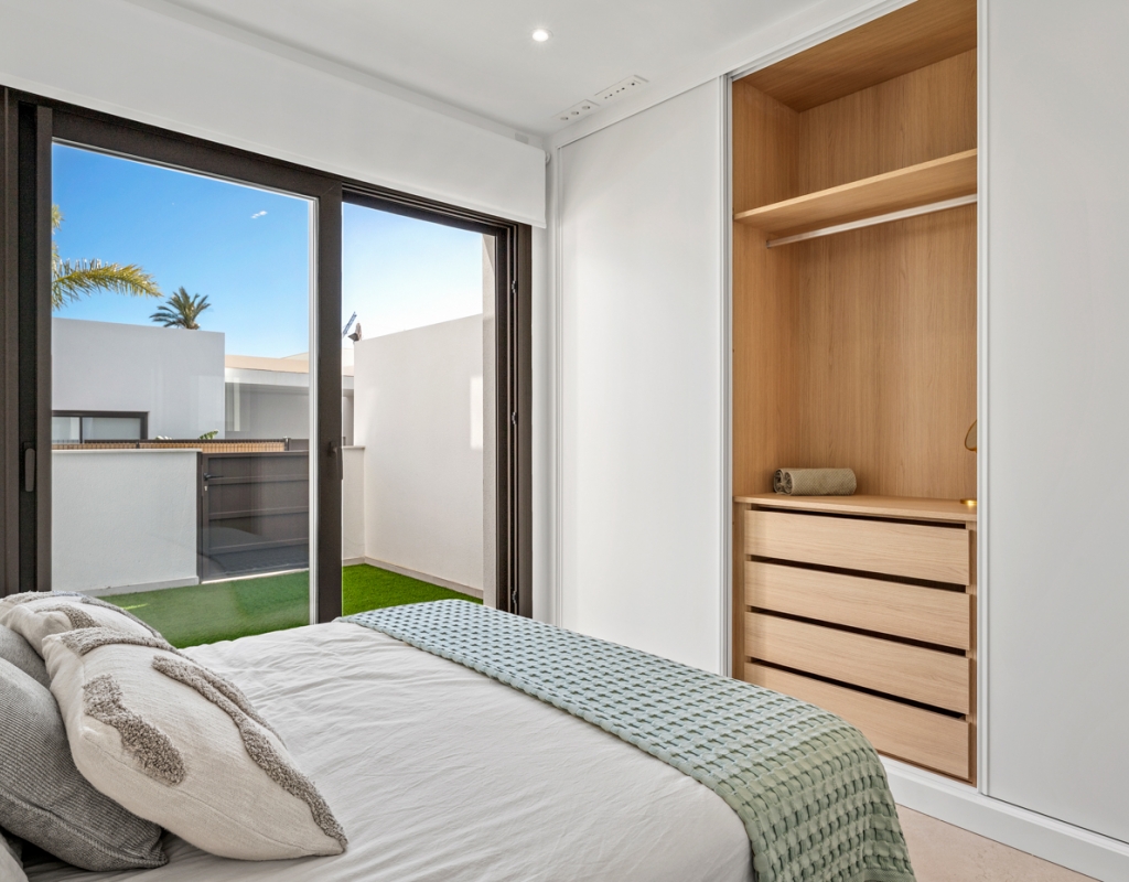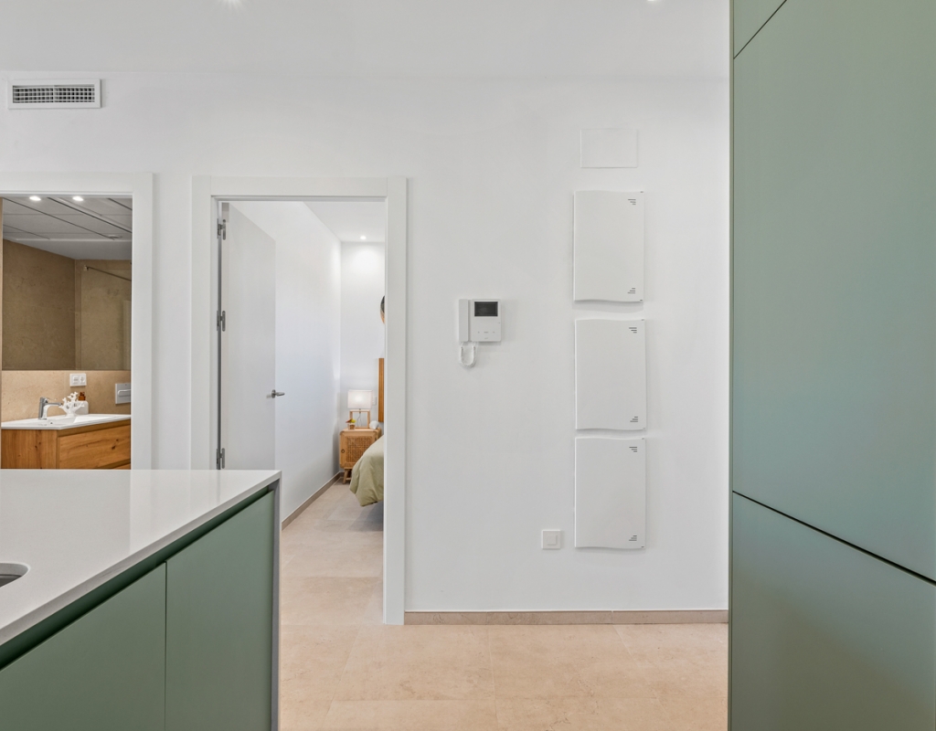The properties feature spacious terraces and, in some cases, solariums, perfect for enjoying the Mediterranean climate and stunning sea views. Private gardens offer additional space for relaxation and outdoor recreation. Additionally, each residence includes a garage, providing convenience and security for vehicles. The integration of elements such as electric shutters and a video intercom system ensures a modern and functional environment, adapted to current comfort and security needs.
