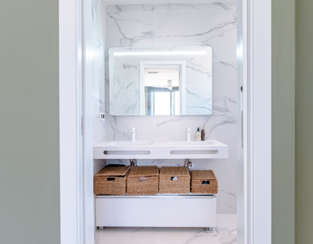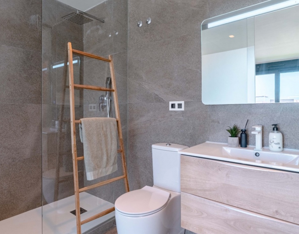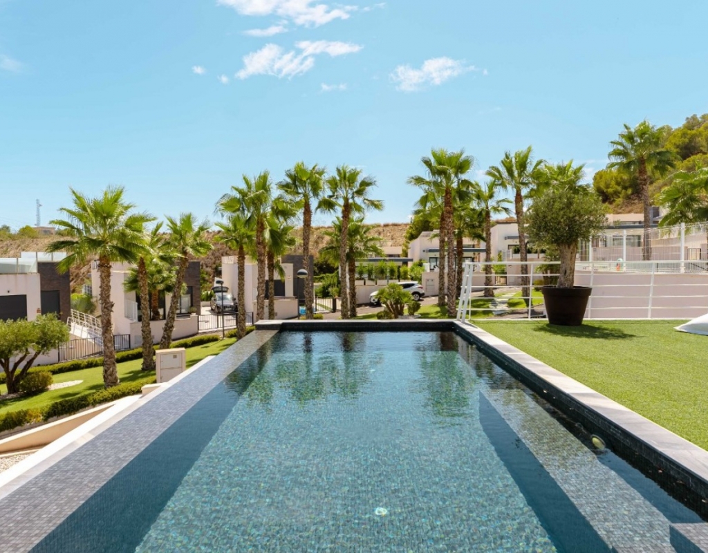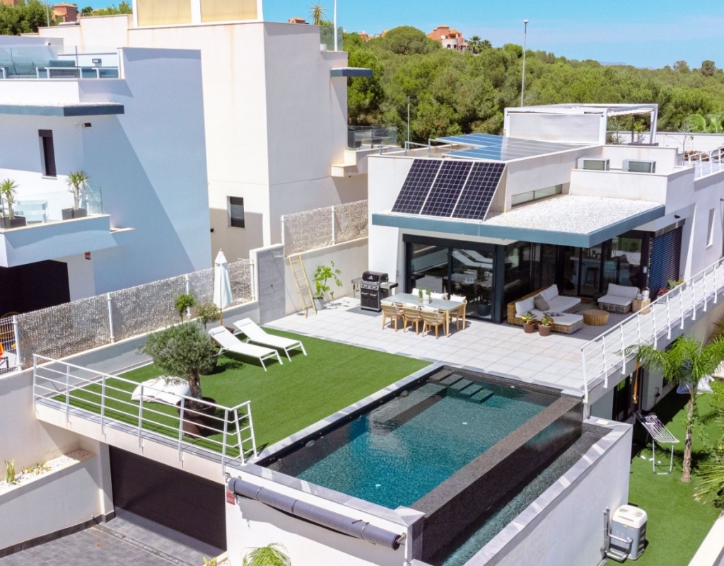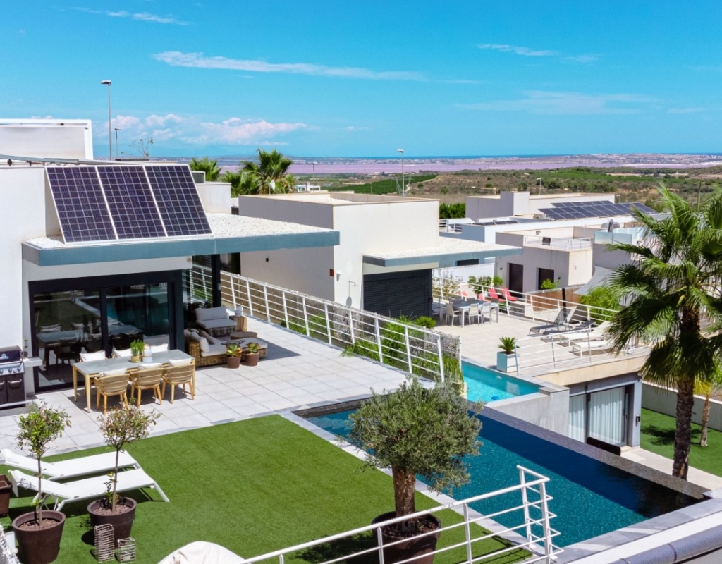 Welcome to your dream villa with quiet location just outside the center of San Miguel de Salinas! This stunning, recently built modern detached villa offers the epitome of luxury living with its array of enticing features. As you step inside, you'll be greeted by a spacious and contemporary interior spread across two floors. The main floor boasts indulgent heated floors, ensuring warmth and comfort throughout. The expansive living areas seamlessly blend with the sleek kitchen, creating an ideal space for entertaining friends and family. Step outside to your private oasis, where a heated, magnesium pool awaits, perfect for year-round enjoyment. Embrace the eco-friendly lifestyle with the solar energy system, reducing your carbon footprint while saving on energy costs. Luxuriate in the comfort of heated floors not only on the main level but also in the bathrooms of the basement, offering ultimate relaxation and comfort. The water filter ensures purity and freshness with every drop, enhancing your overall well-being. The house is equipeed with electrical blinds throughout with smart control. Ascend to the roof terrace and be captivated by breathtaking panoramic views of the sparkling sea and pink salt lake, creating an enchanting backdrop for unforgettable moments. Stay cool during the warmer months with air conditioning throughout the villa. The meticulously landscaped garden and terrace provide serene outdoor spaces to unwind and soak in the Mediterranean sunshine. Convenience meets luxury with a garage accommodating two cars, ensuring secure parking for your vehicles. Whether you're hosting a soirée or enjoying a peaceful evening at home, this villa offers the perfect setting for every occasion. The downstairs floor is equipped with its own kitchen for guests or you could separate the two floors with separate entrances to create 1-2 rentable, fully equipped units. Don't miss this opportunity to own a slice of paradise in San Miguel de Salinas. Experience the height of contemporary living in this exquisite villa boasting unparalleled views and luxurious amenities. Your dream home awaits!