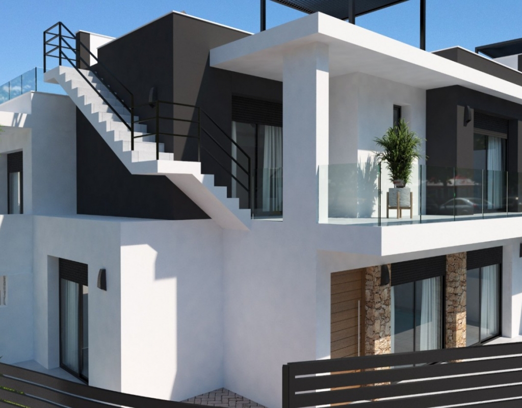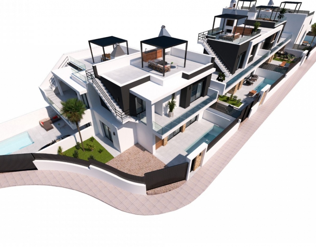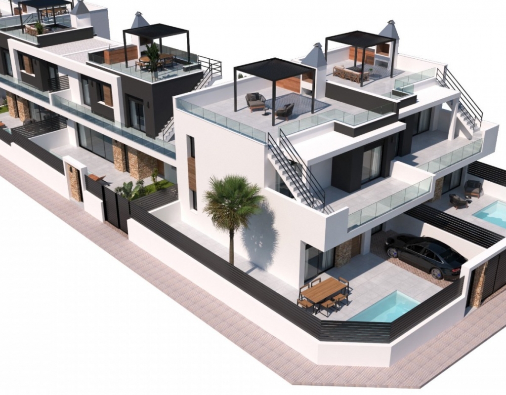 Welcome to your dream retreat in Los Montesinos, Alicante! These brand-new semi-detached villas offer the epitome of luxury living in the heart of the Costa Blanca. As you step into these stunning villas, you're greeted by a spacious layout designed for both comfort and elegance. The stylish exterior sets the tone for the exquisite interiors adorned with beautiful materials, creating a harmonious blend of sophistication and charm. Each villa boasts three bedrooms and three bathrooms, providing ample space for relaxation and privacy. The master suite is a sanctuary of indulgence, featuring a private ensuite bathroom and serene views of the surrounding landscape. Entertainment and relaxation await outdoors, where your own private pool beckons for refreshing dips on warm summer days. For those seeking panoramic vistas, the optional solarium offers breathtaking views of the tranquil lakes and verdant countryside, providing the perfect backdrop for unforgettable gatherings with friends and family. Convenience is key with private parking ensuring hassle-free access to your oasis of tranquility. Stay cool and comfortable year-round with pre-installed air conditioning, ensuring the perfect climate no matter the season. Situated in close proximity to both golf courses and vibrant city life, these villas offer the best of both worlds. Whether you're teeing off on world-class fairways or exploring the bustling streets of nearby towns, endless opportunities for leisure and adventure await just moments from your doorstep. Experience the pinnacle of Mediterranean living in these luxurious villas in Los Montesinos, where every day feels like a holiday in paradise. Plot sizes from 148-195 m2.