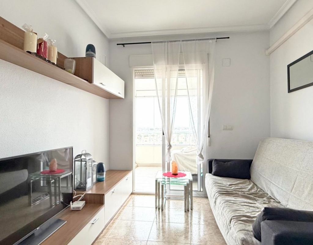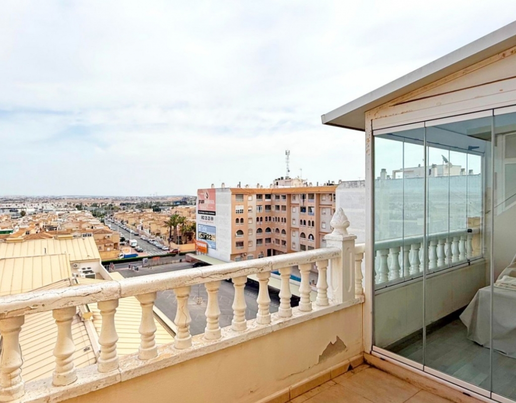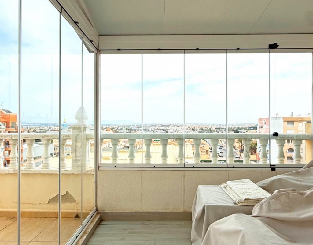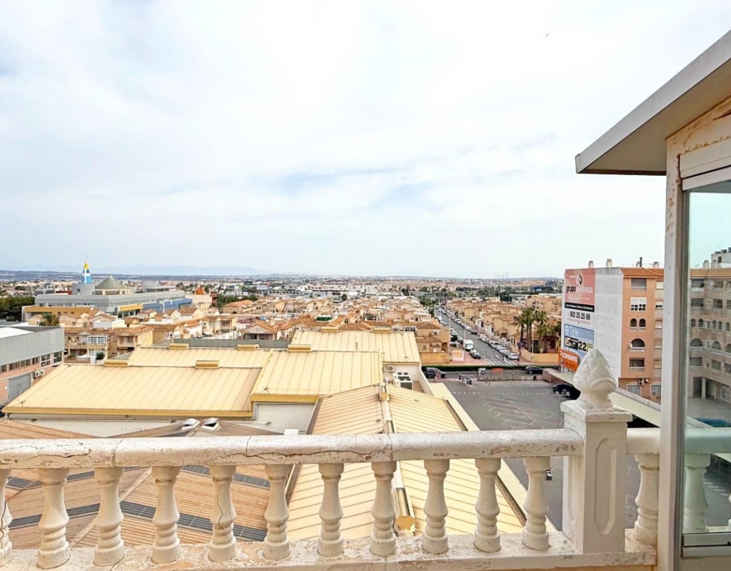 Discover this 5th-floor penthouse apartment in the heart of Torrevieja, ideally located just a short walk from shops, restaurants, and the vibrant promenade. This bright and airy property offers 2 bedrooms, 1 bathroom, and a spacious living area with air conditioning for year-round comfort. There is also a community rooftop. The standout feature is the large, partly glazed-in terrace—perfect for enjoying meals or relaxing while taking in the spectacular panoramic views of the city and the famous pink salt lake. Sold furnished and ready to move in, the apartment also benefits from access to a well-maintained communal pool—an ideal option for both permanent living and holidays. Don't miss this rare opportunity for a top-floor home with unbeatable views and central location!