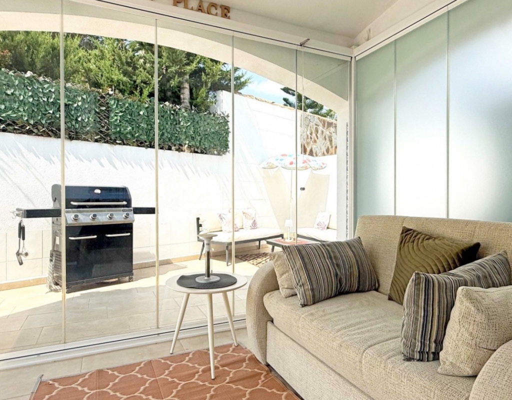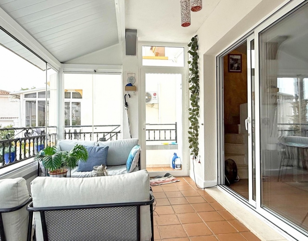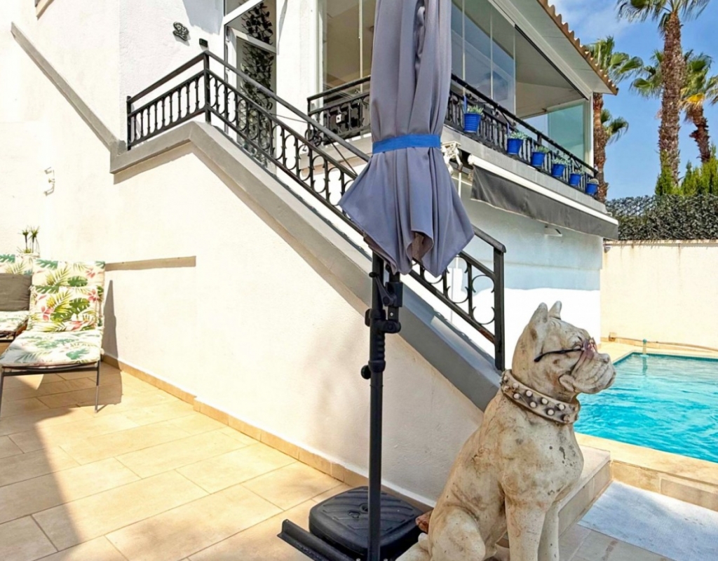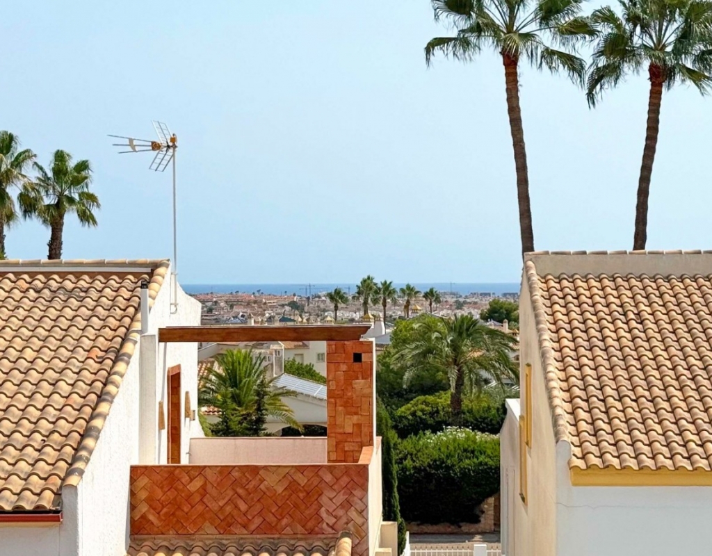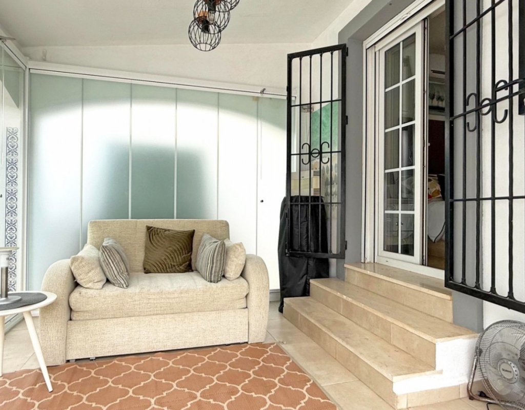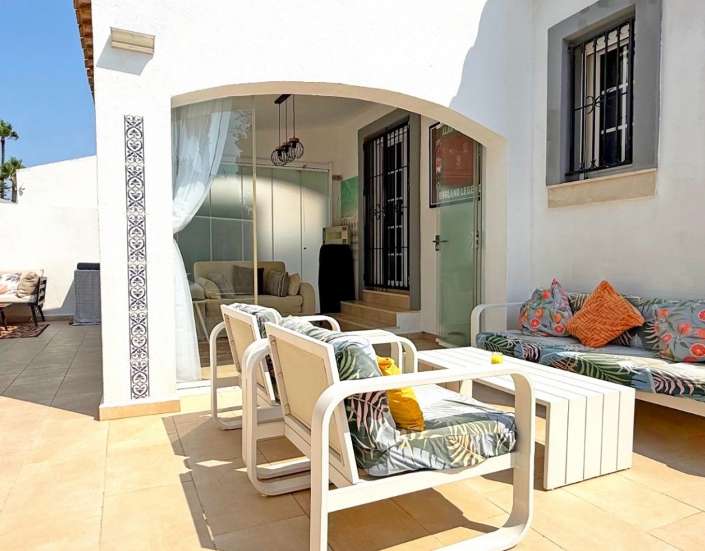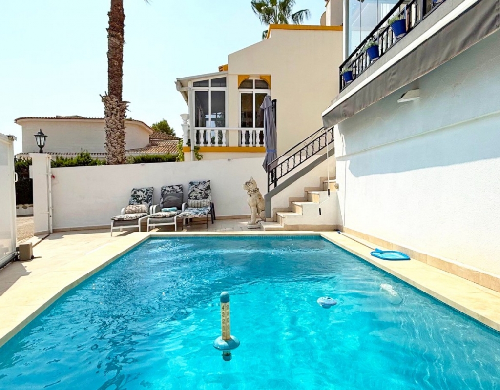 This beautifully maintained villa has been thoughtfully reformed into a 2/3-bedroom home, offering the perfect blend of comfort and style. The property features a private pool, three bathrooms (two of which are en-suite), a spacious kitchen-diner, and a large lounge with direct access to a balcony that overlooks the pool. The balcony can be enclosed with glass curtains, creating a versatile glazed space that the current owners use as a third bedroom when needed, making it ideal for year-round enjoyment. The guest bedroom opens onto a private patio, also fitted with glass curtains, while the master bedroom boasts a generous solarium with stunning sea views. Additional highlights include air conditioning throughout, optional central heating, two large storage rooms, and an excellent location in a quiet and private area of Villamartin. All this just a short walk from the famous Villamartin Plaza and the golf course.