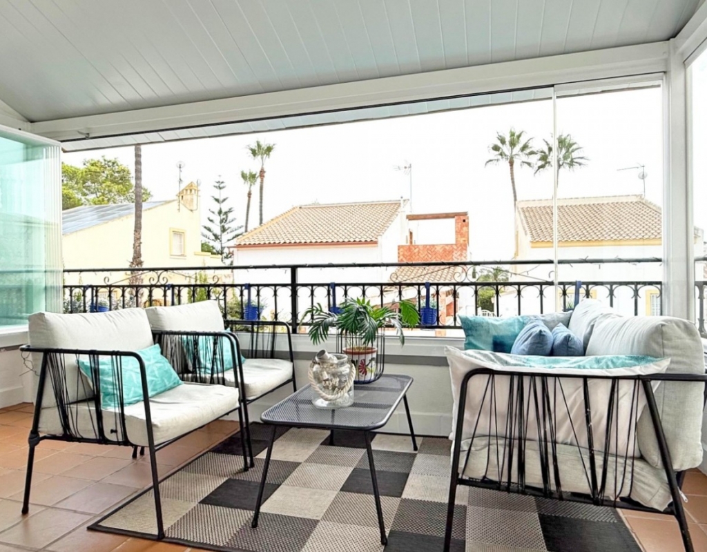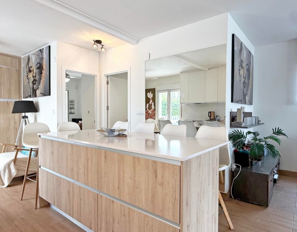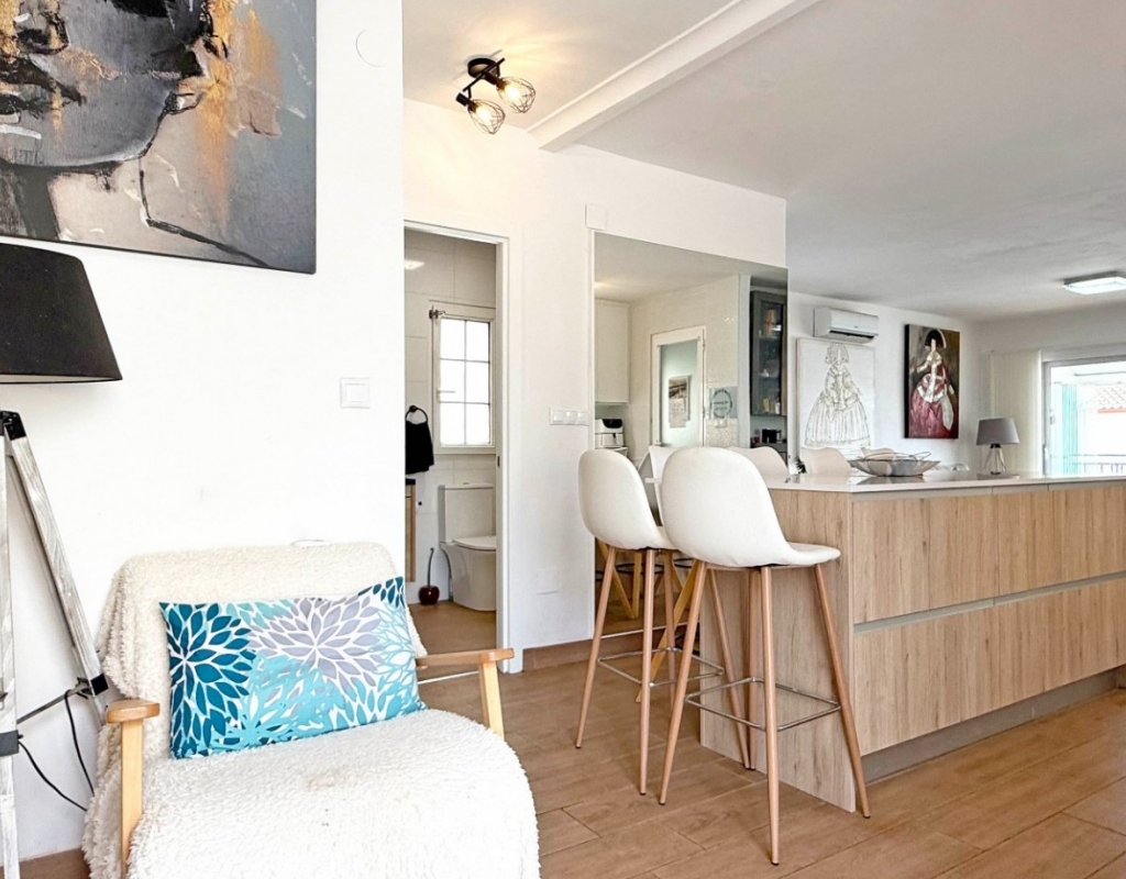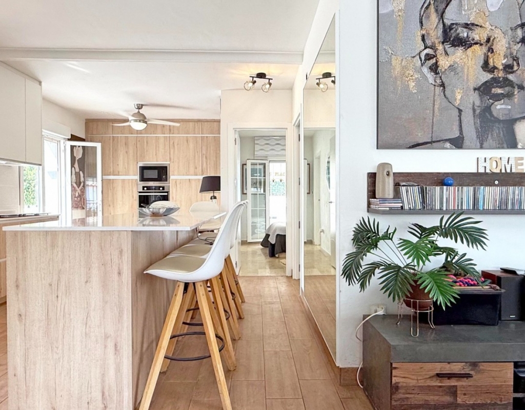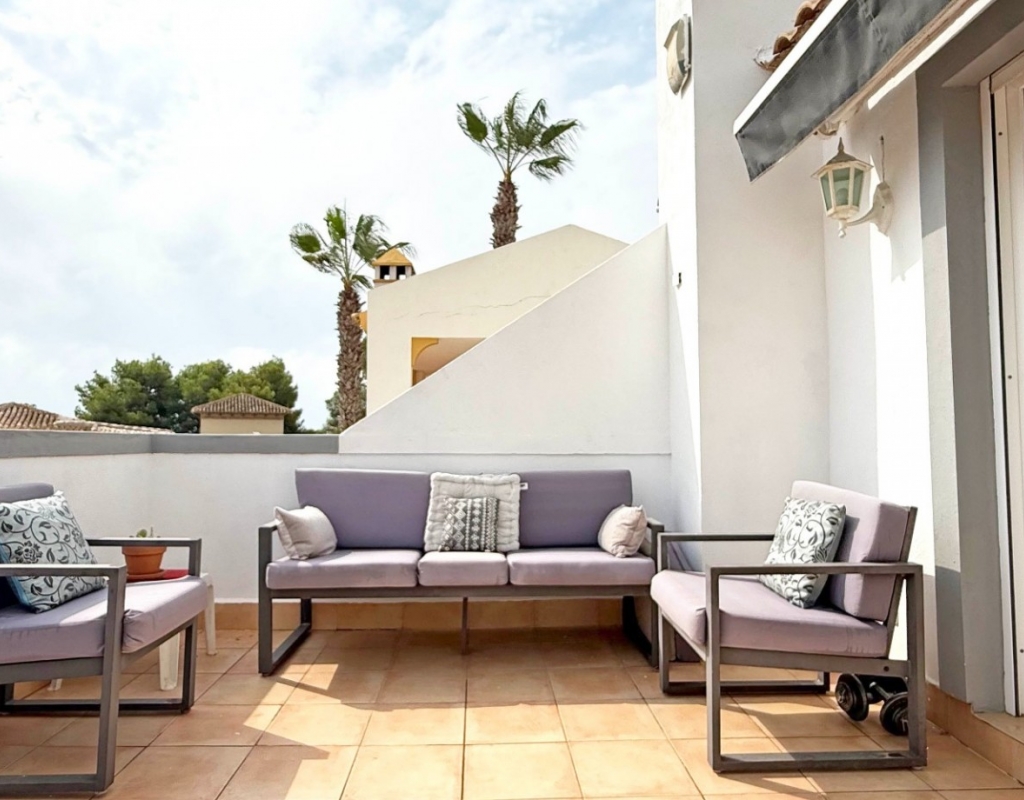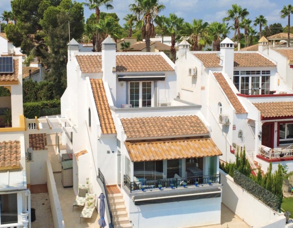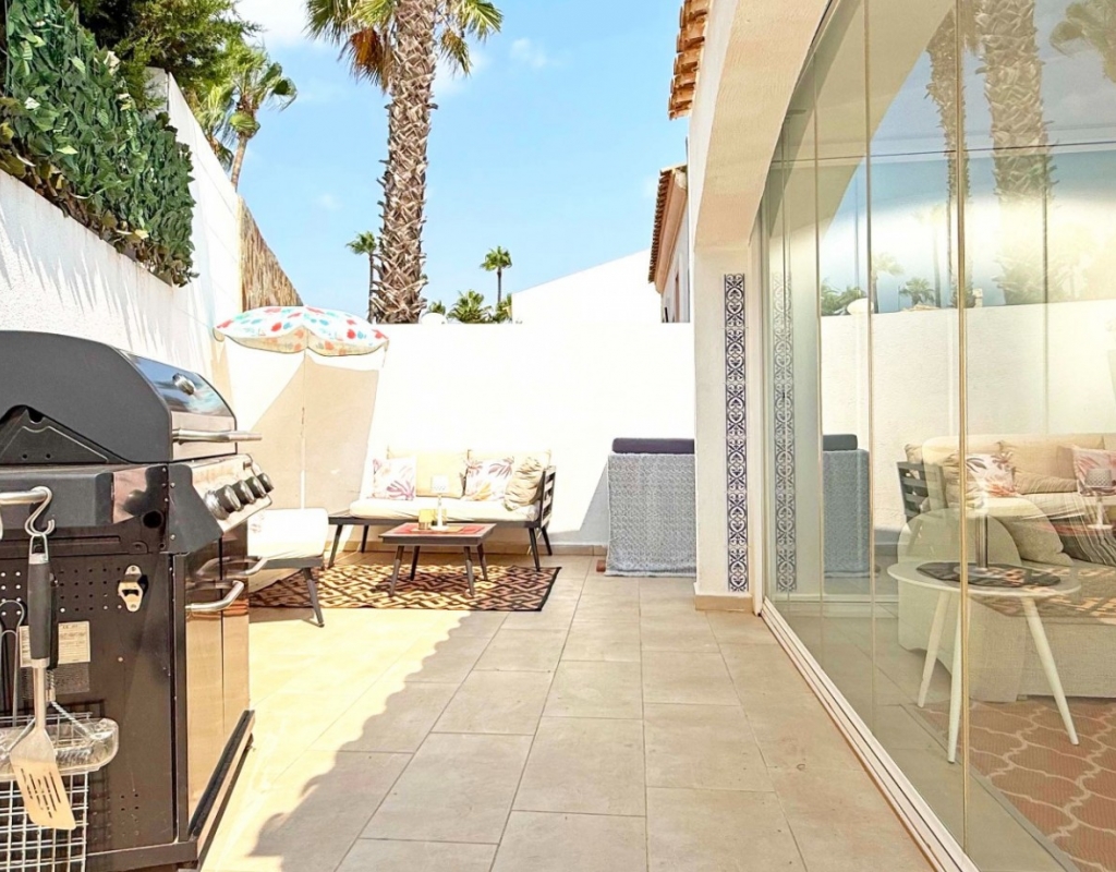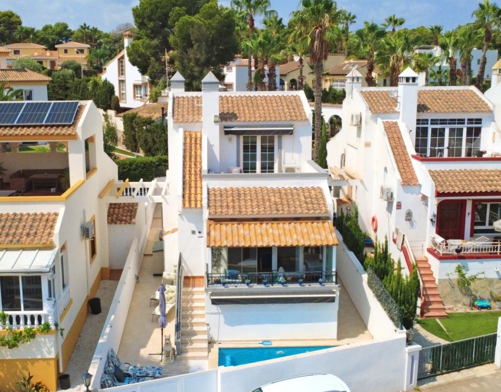 This beautifully maintained villa has been thoughtfully reformed into a 2/3-bedroom home, offering the perfect blend of comfort and style. The property features a private pool, three bathrooms (two of which are en-suite), a spacious kitchen-diner, and a large lounge with direct access to a balcony that overlooks the pool. The balcony can be enclosed with glass curtains, creating a versatile glazed space that the current owners use as a third bedroom when needed, making it ideal for year-round enjoyment. The guest bedroom opens onto a private patio, also fitted with glass curtains, while the master bedroom boasts a generous solarium with stunning sea views. Additional highlights include air conditioning throughout, optional central heating, two large storage rooms, and an excellent location in a quiet and private area of Villamartin. All this just a short walk from the famous Villamartin Plaza and the golf course.