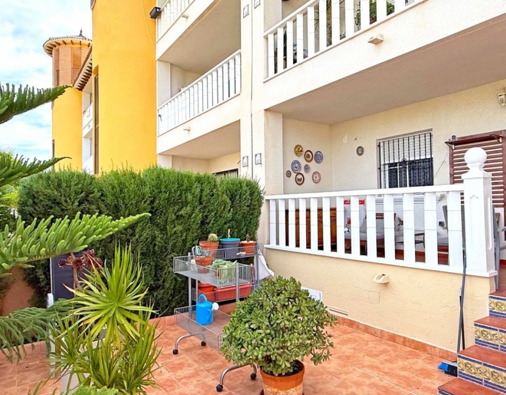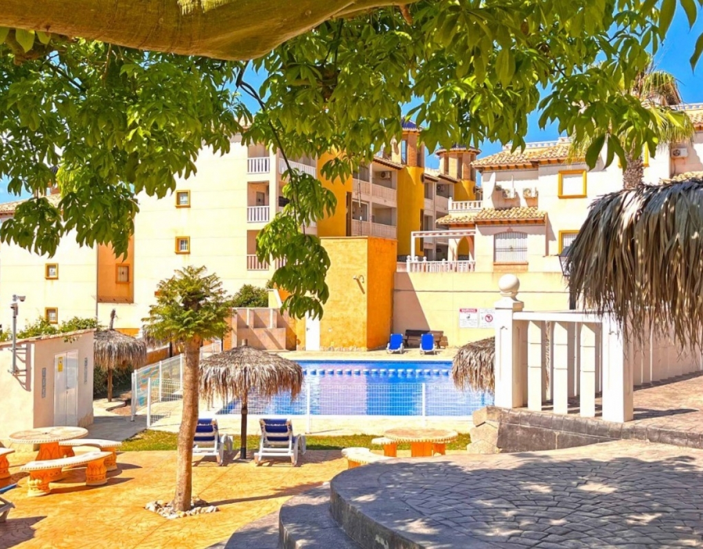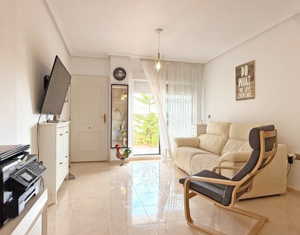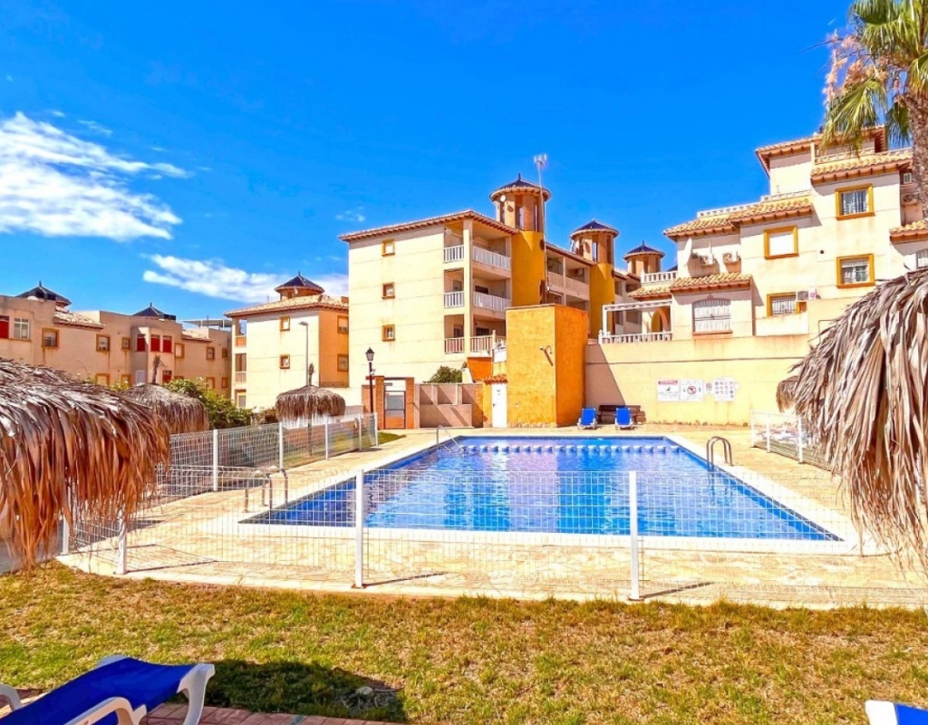 We are delighted to present this charming ground floor apartment located in the sought-after area of Lomas de Cabo Roig, just a short distance from the beaches and golf courses of Orihuela Costa. The property offers 2 bedrooms, 1 bathroom, a well-equipped independent kitchen, and a bright living and dining area. The home stands out for its generous outdoor spaces: a large front terrace with open views of the surrounding nature, perfect for enjoying the Mediterranean climate, and a spacious rear patio ideal for relaxing or entertaining. Situated in good condition and filled with natural light throughout, the apartment provides both comfort and convenience. Residents can also enjoy access to a well-maintained communal pool, making it an excellent choice for holidays, permanent living, or as a rental investment. All essential services—including shops, restaurants, and supermarkets—are within walking distance, ensuring a relaxed and practical lifestyle. Key Features: Ground floor apartment in Lomas de Cabo Roig 2 bedrooms & 1 bathroom Independent, fully equipped kitchen Bright living spaces Large terrace with open nature views Spacious rear patio Communal pool Good condition throughout Walking distance to all services